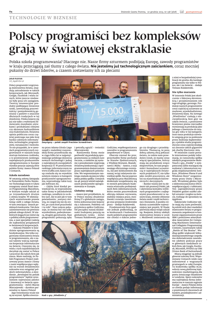 D4 Dziennik Gazeta Prawna, 10 grudnia 2013, nr 238 (3628) gazetaprawna.pl T E C H NOL O G I E W B I Z N E S I E Polscy programiści bez kompleksów grają w światowej ekstraklasie Polska szkoła programowania? Dlaczego nie. Nasze firmy szturmem podbijają Europę, zawody programistów w kraju przyciągają zaś tłumy z całego świata. Nie jesteśmy już technologicznym zaściankiem, coraz mocniej pukamy do drzwi liderów, a czasem zostawiamy ich za plecami z nimi w bezpośredniej rywalizacji do gratka dla każdego programisty nie tylko w Polsce, ale i na świecie – dodaje Tomasz Kułakowski. Jakub Kuźniak [email protected] Polscy programiści wygrywają mistrzostwa świata, znajdują zatrudnienie w takich korporacjach, jak Microsoft, Google, Facebook i wielu innych, które jeszcze niedawno były poza ich zasięgiem. Tworzą innowacyjne produkty podbijające światowe rynki, zawstydzają pracowitością i pomysłowością geniuszy z państw o znacznie dłuższych tradycjach w tej dziedzinie. Polska kojarzy się już nie tylko z wybitnymi filmowcami, muzykami, używkami i produktami rolnymi czy słynnym hydraulikiem oraz budowlańcem. Światowa opinia publiczna coraz częściej postrzega nas jako kraj bardzo zdolnych informatyków, technologów, programistów, wynalazców i twórców. To nie przypadek, że w zawodach programistycznych rozgrywanych w naszym kraju startuje światowa czołówka, a w prestiżowym rankingu największych producentów oprogramowania w Europie wysokie pozycje zajmują dwie polskie firmy: Asseco Poland i Comarch. Szkoła narodowa W ostatnią sobotę listopada w Pomorskim Parku Naukowo-Technologicznym w Gdyni rozegrany został finał Asseco Programming Marathon, w którym wzięło udział aż 30 trzyosobowych drużyn z ośmiu krajów. W eliminacjach wystartowało prawie tysiąc osób z całego świata, w tym zwycięzcy innych podobnych konkursów. Tak duże zainteresowanie nie powinno jednak nikogo dziwić. W niektórych kręgach już mówi się o polskiej szkole programowania, a nasi specjaliści należą do najbardziej pożądanych w światowych korporacjach. – Sukcesy Polaków w dziedzinie oprogramowania są bezdyskusyjne. Nie tylko wygrywamy mistrzostwa świata w programowaniu, ale o nasze talenty walczą największe korporacje informatyczne na świecie. Cieszymy się, że wielu z tych najzdolniejszych decyduje się zostać w Polsce i pracować dla takich firm jak nasza. Mam nadzieję, że Polish Programers Project realizowany przez Asseco i firmy z nami współpracujące wpłynie na wzrost świadomości sukcesów oraz osiągnięć polskich informatyków, a określenie „developed by polish programmers” będzie synonimem najwyższej jakości i innowacji w świecie oprogramowania – mówi Maciej Mierzejewski – dyrektor personalny w Asseco Poland Jego twierdzenia wcale nie są na wyrost. Spółka stworzo- Nie tylko marzenia Zwycięzcy – polski zespół Precision Screwdrivers na przez Adama Górala i jego zespół z maleńkiej rzeszowskiej firmy przeobraziła się w ciągu kilku lat w najpotężniejszego polskiego dostawcę nowych technologii i jedną z największych europejskich korporacji IT. W prestiżowym rankingu informatycznym na www.truffle.com Asseco Group znalazła się na wysokim szóstym miejscu w kategorii producentów oprogramowania, wyprzedzając takie tuzy jak Software AG. – Gdyby ktoś kiedyś powiedział mi, że wyprzedzimy takie firmy w jakimkolwiek rankingu, uznałbym to za dobry żart. Ale to jest jak w tym powiedzeniu: „wszyscy mówią, że czegoś się nie da zrobić, po czym ktoś przychodzi i to robi”. Nasz sukces pokazuje, że można być nie tylko wyrobnikiem, podwykonawcą, drugim garniturem. Nasi programiści pokazują zęby Kadr z gry „Wiedźmin 3” i potrafią ugryźć – twierdzi Mierzejewski. Rzeszowska firma może pochwalić się produkcją oprogramowania za miliard euro rocznie, a niektóre jej systemy z powodzeniem wygrywają światową konkurencję z oprogramowaniem dostarczanym przez największych potentatów. We wspomnianym rankingu znalazła się jeszcze tylko jedna polska spółka: Comarch na 48. pozycji wśród największych producentów oprogramowania w Europie. Globalny zasięg – Asseco jest przykładem, że w Polsce można zbudować firmę IT o globalnym zasięgu, która jednoznacznie kojarzy się z sukcesem. Podobny cel przyświeca spółce CodiLime. Od początku naszej działalności budujemy pozycję na globalnym rynku - mówi Tomasz Kułakowski, prezes CodiLime, współorganizatora zawodów w programowaniu zespołowym w Gdyni. Obecnie niemal 80 proc. przychodów firmy pochodzi ze Stanów Zjednoczonych, z Wielkiej Brytanii, Skandynawii i Malty. – Asseco, z racji swojego olbrzymiego rozmiaru, nie jest konkurentem dla naszej, wciąż relatywnie niewielkiej spółki. Raczej poprzez współpracę przy Marathon24 doskonale uzupełniamy się w swoich potrzebach budowania wizerunku profesjonalnych firm informatycznych, które swoim pracownikom oferują ciekawe wyzwania, stabilne miejsca pracy, możliwości rozwoju zawodowego oraz przyjazne środowisko pracy – dodaje Kułakowski. Przedstawiciele firm zgodnie jednak podkreślają, że w konkursach i budowaniu marki polskich programistów nie chodzi o sukces jedne- go czy drugiego z przedsiębiorstw. Tłumaczą, że poza dobrą zabawą chcą pokazać światu, że rośnie nam prawdziwy rynek, że mamy coraz więcej specjalistów, którzy stają się produktem wręcz eksportowym, bo nasi programiści i konsultanci uczestniczą w największych światowych projektach IT, nie tylko jako zwykli pracownicy, ale też na stanowiskach kierowniczych i decyzyjnych. – Bardzo ważny jest tu element tak promocji Polski, jak i ułatwienia kontaktu wybitnych programistów z najlepszymi pracodawcami w naszym kraju, swoiste zbliżenie świata nauki i myśli technicznej z biznesem. Z punktu widzenia uczestników najważniejszy jest prestiż. W finale pierwszej edyc