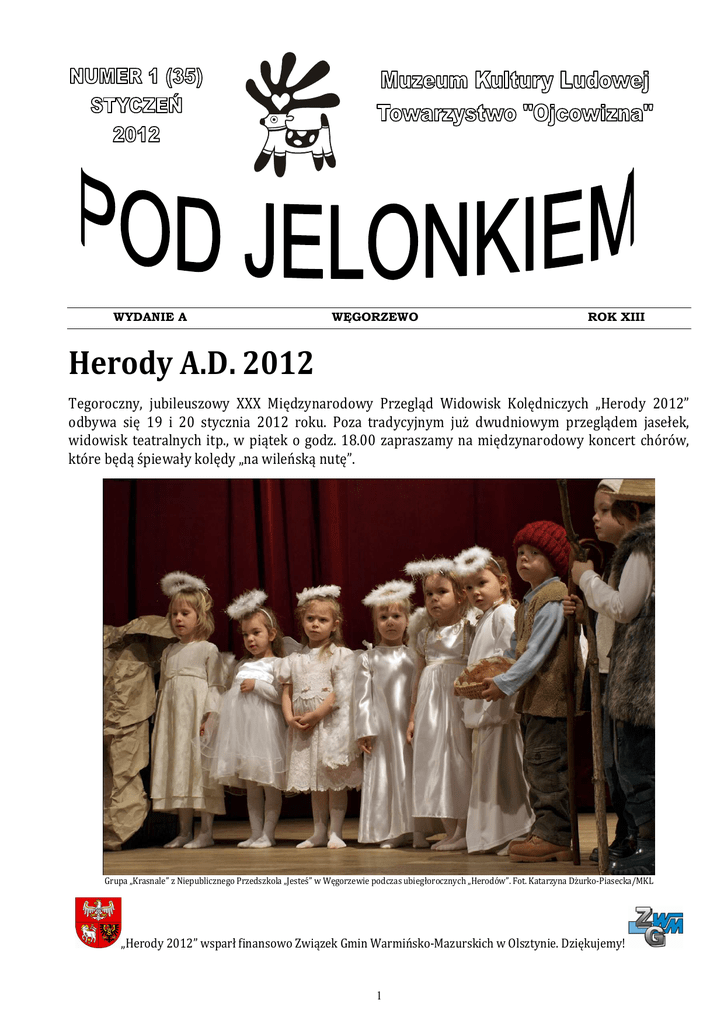 WYDANIE A WĘGORZEWO ROK XIII Herody A.D. 2012 Tegoroczny, jubileuszowy XXX Międzynarodowy Przegląd Widowisk Kolędniczych „Herody 2012” odbywa się 19 i 20 stycznia 2012 roku. Poza tradycyjnym już dwudniowym przeglądem jasełek, widowisk teatralnych itp., w piątek o godz. 18.00 zapraszamy na międzynarodowy koncert chórów, które będą śpiewały kolędy „na wileńską nutę”. Grupa „Krasnale” z Niepublicznego Przedszkola „Jesteś” w Węgorzewie podczas ubiegłorocznych „Herodów”. Fot. Katarzyna Dżurko-Piasecka/MKL „Herody 2012” wsparł finansowo Związek Gmin Warmińsko-Mazurskich w Olsztynie. Dziękujemy! 1 • Klub Mazury „Złota Jesień” – Giżycko Kierownik zespołu: Zygmunt Raczkowski Tytuł widowiska: „Jasełka” z chórem Opis: Narodziny Jezusa. Trzej Królowie go odwiedzają. Chór śpiewa kolędy. Występują anioły, Żyd i diabeł. Lista obecności Udział w XXX Międzynarodowym Przeglądzie Widowisk Kolędniczych „Herody 2012” zapowiedzieli: • „Koguciki” – Samorządowe Przedszkole nr 2 im. Misia Uszatka w Węgorzewie Kierownik zespołu: Grażyna Grzeszuk Tytuł widowiska: „Betlejemska dobranocka” Opis: Do szopki betlejemskiej przychodzą z darami postacie z bajek. • Zespół śpiewaczy „Pelagia” – MiejskoGminne Centrum Kultury w Rykach Kierownik zespołu: Paweł Warowny Tytuł widowiska: „Zaśpiewajm Pieśni Panu Nowamu” – kolędowanie z Gwiazdą Opis: Tradycyjna forma kolędowania w obchodzie z gwiazdą. Widowisko składa się ze wszystkich podstawowych elementów dla tego typu kolędowania. Teksty mówione i kolędy. • „Gwiazdorki” – Gminny Ośrodek Kultury w Budrach Kierownik zespołu: Iwona Urbanowicz Tytuł widowiska: „Zimowy wieczór” Opis: I scena – zapowiedź narodzin Jezusa (wiersze i kolęda); II scena – narodziny Jezusa, scena z pastuszkami oraz dziećmi; III scena – zakończenie (wiersze i kolędy). • „Perełka” – Dom Pomocy Społecznej w Nowej Wsi Ełckiej Kierownik zespołu: Paweł Kalinowski Tytuł widowiska: „Obyczaje i obrzędy Mazur” • „Absolwent” – Gminny Ośrodek Kultury w Budrach Tytuł widowiska: koncert kolędowy • „Promyki” – Szkoła Podstawowa nr 1 w Kętrzynie Kierownik zespołu: Małgorzata Piekarska Tytuł widowiska: „Podążamy do nowonarodzonego Króla” Opis: Na wieść o narodzinach Króla – Boga Człowieka, poszczególne grupy pielgrzymów wyruszają, by oddać hołd nowonarodzonemu Dzieciątku. • Teatr Ludowy w Rostkach – Piski Dom Kultury Kierownik zespołu: Mariusz Trupacz Tytuł widowiska: „Herody” Opis: Przedstawienie kolędnicze w mazurskiej chacie przeplatane kolędami oraz humorem grających kolędników. • Klub Seniora „Barwy Jesieni” – Gminny Ośrodek Kultury w Budrach Kierownik zespołu: Janina Kowalewska Tytuł widowiska: koncert kolędowy Opis: „Przylecieli śliczne anieli”; „Boh sia rożdajet”; „Wśród nocnej ciszy” • Zespół śpiewaczy z Moszczanki – Miejsko-Gminne Centrum Kultury w Rykach Kierownik zespołu: Paweł Warowny Tytuł widowiska: „Z szopką śpiesznie bieżymy” Opis: Tradycyjna forma kolędowania – kobiety chodziły i kolędowały z szopką. • „Piszanie” – Piski Dom Kultury Kierownicy zespołu: Krystyna Bochenek, Mariusz Trupacz Tytuł widowiska: „Herody” Opis: Kolędy i pastorałki. Na podstawie nadesłanych ankiet zestawił Mateusz Braun 2 chorych i niedołężnych. Wiele osób zapewnia, że uroczystość ta budzi podniosłe uczucia i działa budująco. Nie ulega wątpliwości, że Polacy, mający w ogóle wrażliwe usposobienie, bardzo rozczulają się tą uroczystością. Szczególnie zaś sieroty budzą najżywszą sympatię swoimi wierszykami. Uroczystość ta jest odwieczna. Pisanski w swoich zapiskach przechowywanych w rękopisie – Johannisburger Collectaneen, odnotował uroczystość taką obchodzoną w mieście Jańsborku (Piszu) około 1735 roku, obecnie zaś w miastach zdarza się ona chyba bardzo rzadko”. Zwyczaje, których już nie ma! Doroczny, zimowy przegląd zespołów kolędniczych „Herody”, który w 2012 roku odbywa się w Węgorzewie po raz 30-ty zobowiązuje Muzeum Kultury Ludowej do zwrócenia szczególnej uwagi na dawne zwyczaje regionalne, które są niezaprzeczalnym dziedzictwem tej ziemi. Żyjemy w czasach ciągłej zmiany. Każdy rok przynosi nowe, niejednokrotnie ciekawsze wydarzenia od tych dawniejszych. Wiele prastarych zwyczajów, z różnych powodów, nie tylko poprzez tempo życia i cywilizacyjny pośpiech, spoczęło w mroku niepamięci. Wskutek germanizacyjnej działalności administracji pruskiej w II połowie XIX i początkach XX wieku, pamięć o jutrzni zachowała się tylko wśród najstarszych Mazurów i w rzetelnych zapisach niemieckich pastorów i nauczycieli z XIX wieku. Korzystając z tej zbiorowej pamięci, Karol Małłek, nauczyciel z Działdowszczyzny, działacz mazurski, pisarz i folklorysta, odtworzył ten już prawie zapomniany zwyczaj i w formie scenariusza zwyczaju Mazurska Jutrznia na Gody opublikował w Olsztynie w 1931 i 1937 roku. Tradycyjna kultura mazurska w okresie Bożego Narodzenia miała jeden zwyczaj – bardzo dawny, bo wspominany w źródłach już w XVIII wieku – jutrznię. Max Toeppen, wybitny historiograf Prus Wschodnich, opublikował w 1867 roku dzieło Wierzenia Mazurskie, zawierające najstarszy opis jutrzni, która dla mieszkańców wsi i miasteczek mazurskich była ogromnie ważnym świątecznym wydarzeniem: „W pierwszy dzień Bożego Narodzenia (pisze Toeppen) w kościołach na Mazurach, a po wsiach gdzie nie ma kościołów, w szkołach, odbywa się podczas porannego nabożeństwa bardzo charakterystyczna i wielce lubiana uroczystość. Główną rolę odgrywają dzieci szkolne przygotowywane przez nauczyciela. Przybierają one postaci aniołów, gdyż przywdziewają białe szaty – najczęściej ojcowską koszulę przepasaną jaskrawą wstążką – i 