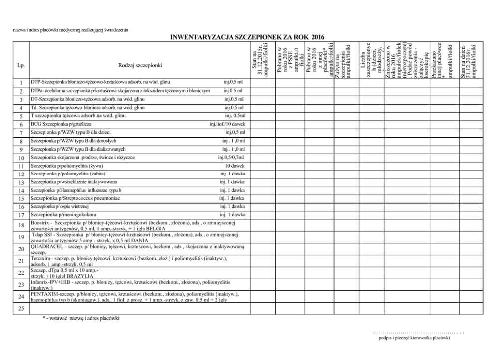nazwa i adres placówki medycznej realizującej świadczenia 1 2 3 4 5 6 7 8 9 10 11 12 13 14 15 16 17 18 19 20 21 22 23 24 25 DTP-Szczepionka błoniczo-tężcowo-krztuścowa adsorb. na wód. glinu inj.0,5 ml DTPa- acelularna szczepionka p/krztuścowi skojarzona z toksoidem tężcowym i błoniczym inj.0,5 ml DT-Szczepionka błoniczo-tężcowa adsorb. na wód. glinu inj.0,5 ml Td- Szczepionka tężcowo-błonicza adsorb. na wód. glinu T szczepionka tężcowa adsorb.na wod. glinu inj.0,5 ml inj. 0.5ml BCG Szczepionka p/gruźlicza Szczepionka p/WZW typu B dla dzieci Szczepionka p/WZW typu B dla dorosłych Szczepionka p/WZW typu B dla dializowanych Szczepionka skojarzona p/odrze, śwince i różyczce Stan na dzień 31.12.2016r. ampułki/fiolki Liczba zaszczepionyc h (dzieci, młodzieży, dorosłych) Zniszczono w roku 2016 ampułek/fiolek (nierozpoczęte) . Podać powód zniszczenia załączyć kserokopię protokołu Przekazano zniszczenia innej placówce * ampułki/fiolki Rodzaj szczepionki Pobrano w roku 2016 z PSSE ampułki,/i fiolki Pobrano w roku 2016 z innej placówki* ampułki/fiolki Zużyto na szczepienia ampułki/fiolki Lp. Stan na 31.12.2015r. ampułki/fiolki INWENTARYZACJA SZCZEPIONEK ZA ROK 2016 inj.liof./10 dawek inj.0,5 ml inj . 1 ,0 ml inj . 1 ,0 ml inj.0,5/0,7ml Szczepionka p/poliomyelitis (żywa) Szczepionka p/poliomyelitis (zabita) 10 dawek inj. 1 dawka Szczepionka p/wściekliźnie inaktywowana inj. 1 dawka Szczepionka p/Haemophilus influenzae typu b Szczepionka p/Streptococcus pneumoniae inj. 1 dawka inj. 1 dawka Szczepionka p/ ospie wietrznej dla grup ryzyka Szczepionka p/meningokokom inj. 1 dawka inj. 1 dawka Boostrix - Szczepionka p/ błonicy-tężcowi-krztuścowi (bezkom., złożona), ads., o zmniejszonej zawartości antygenów, 0,5 ml, 1 amp.-strzyk. + 1 igła BELGIA Tdap SSI - Szczepionka p/ błonicy-tężcowi-krztuścowi (bezkom., złożona), ads., o zmniejszonej zawartości antygenów 5 amp.- strzyk. x 0,5 ml DANIA QUADRACEL - szczep. p/ błonicy, tężcowi, krztuścowi, bezkom., ads., skojarzona z inaktywowaną szczep. Tetraxim - szczep. krztuścowi (bezkom.,złoż.) i poliomyelitis (inaktyw.), p/polio 5 fiol. x 0,5p.mlbłonicy,tężcowi, KANADA adsorb. 1 amp.-strzyk. 0,5 ml Szczep. dTpa 0,5 ml x 10 amp.FRANCJA strzyk. +10 igieł BRAZYLIA Infanrix-IPV+HIB - szczep. p. błonicy, tężcowi, krztuścowi (bezkom., złożona), poliomyelitis (inaktyw.) PENTAXIM-szczep. p/błonicy, tężcowi, krztuścowi złożona), poliomyelitis i haemophilus typ b (skoniugow.), ads. 1 fiol. z prosz(bezkom., i 1 amp.-sztrzyk. z zaw. 0,5 ml + (inaktyw.), 2 igły BELGIA haemophilus typ b (skoniugow.), ads., 1 fiol. z prosz. + 1 amp.-strzyk. z zaw. 0,5 ml + 2 igły FRANCJA * - wstawić nazwę i adres placówki ……………………………………....... podpis i pieczęć kierownika placówki