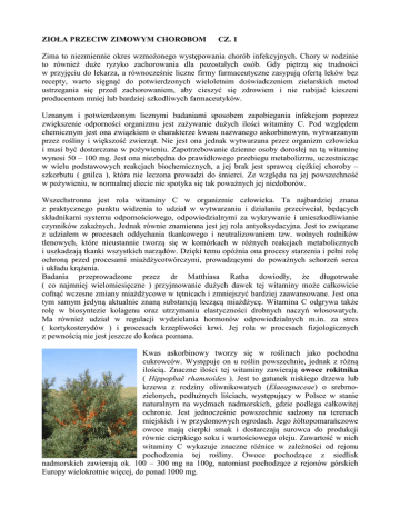 ZIOŁA PRZECIW ZIMOWYM CHOROBOM CZ. 1 Zima to niezmiennie okres wzmożonego występowania chorób infekcyjnych. Chory w rodzinie to również duże ryzyko zachorowania dla pozostałych osób. Gdy piętrzą się trudności w przyjęciu do lekarza, a równocześnie liczne firmy farmaceutyczne zasypują ofertą leków bez recepty, warto sięgnąć do potwierdzonych wieloletnim doświadczeniem zielarskich metod ustrzegania się przed zachorowaniem, aby cieszyć się zdrowiem i nie nabijać kieszeni producentom mniej lub bardziej szkodliwych farmaceutyków. Uznanym i potwierdzonym licznymi badaniami sposobem zapobiegania infekcjom poprzez zwiększenie odporności organizmu jest zażywanie dużych ilości witaminy C. Pod względem chemicznym jest ona związkiem o charakterze kwasu nazwanego askorbinowym, wytwarzanym przez rośliny i większość zwierząt. Nie jest ona jednak wytwarzana przez organizm człowieka i musi być dostarczana w pożywieniu. Zapotrzebowanie dzienne osoby dorosłej na tą witaminę wynosi 50 – 100 mg. Jest ona niezbędna do prawidłowego przebiegu metabolizmu, uczestnicząc w wielu podstawowych reakcjach biochemicznych, a jej brak jest sprawcą ciężkiej choroby – szkorbutu ( gnilca ), która nie leczona prowadzi do śmierci. Ze względu na jej powszechność w pożywieniu, w normalnej diecie nie spotyka się tak poważnych jej niedoborów. Wszechstronna jest rola witaminy C w organizmie człowieka. Ta najbardziej znana z praktycznego punktu widzenia to udział w wytwarzaniu i działaniu przeciwciał, będących składnikami systemu odpornościowego, odpowiedzialnymi za wykrywanie i unieszkodliwianie czynników zakaźnych. Jednak równie znamienna jest jej rola antyoksydacyjna. Jest to związane z udziałem w procesach oddychania tkankowego i neutralizowaniem tzw. wolnych rodników tlenowych, które nieustannie tworzą się w komórkach w różnych reakcjach metabolicznych i uszkadzają tkanki wszystkich narządów. Dzięki temu opóźnia ona procesy starzenia i pełni rolę ochroną przed procesami miażdżycotwórczymi, prowadzącymi do poważnych schorzeń serca i układu krążenia. Badania przeprowadzone przez dr Matthiasa Ratha dowiodły, że długotrwałe ( co najmniej wielomiesięczne ) przyjmowanie dużych dawek tej witaminy może całkowicie cofnąć wczesne zmiany miażdżycowe w tętnicach i zmniejszyć bardziej zaawansowane. Jest ona tym samym jedyną aktualnie znaną substancją leczącą miażdżycę. Witamina C odgrywa także rolę w biosyntezie kolagenu oraz utrzymaniu elastyczności drobnych naczyń włosowatych. Ma również udział w regulacji wydzielania hormonów odpowiedzialnych m.in. za stres ( kortykosterydów ) i procesach krzepliwości krwi. Jej rola w procesach fizjologicznych z pewnością nie jest jeszcze do końca poznana. Kwas askorbinowy tworzy się w roślinach jako pochodna cukrowców. Występuje on u roślin powszechnie, jednak z różną ilością. Znaczne ilości tej witaminy zawierają owoce rokitnika ( Hippophaë rhamnoides ). Jest to gatunek niskiego drzewa lub krzewu z rodziny oliwnikowatych (Elaeagnaceae) o srebrnozielonych, podłużnych liściach, występujący w Polsce w stanie naturalnym na wydmach nadmorskich, gdzie podlega całkowitej ochronie. Jest jednocześnie powszechnie sadzony na terenach miejskich i w przydomowych ogrodach. Jego żółtopomarańczowe owoce mają cierpki smak i dostarczają surowca do produkcji równie cierpkiego soku i wartościowego oleju. Zawartość w nich witaminy C wykazuje znaczne różnice w zależności od rejonu pochodzenia tej rośliny. Owoce pochodzące z siedlisk nadmorskich zawierają ok. 100 – 300 mg na 100g, natomiast pochodzące z rejonów górskich Europy wielokrotnie więcej, do ponad 1000 mg. Najobfitszym źródłem witaminy C są owoce róży. Pod względem botanicznym są to tzw. owoce pozorne (hypancja), powstające z rozrośnięcia dna kwiatowego, a właściwymi owocami są znajdujące się wewnątrz tej okrągłej struktury orzeszki, wyglądające jak nasiona i potocznie tak nazywane. W zielarstwie surowiec ten występuje pod nazwą Fructus rosae ( Fructus cynosbati ). Na zdjęciu: dzika róża, gałązka z owocami W Polsce w stanie dzikim rodzaj róża ( Rosa sp. ) jest reprezentowany przez ponad 100 gatunków i podgatunków, często różniących się od siebie specyficznymi detalami budowy, przez co są trudne do rozróżnienia. Surowcem zielarskim jest w Polsce owoc dzikiej róży ( Rosa canina ), która jest gatunkiem zbiorowym ( tj. składającym się z odmiennych genetycznie form ) i jednym z najczęściej spotykanych w naszej florze. Wysoka zawartość omawianej witaminy w owocach róż jest u nich cechą powszechną i zróżnicowaną. Niektóre uprawiane w innych regionach Europy gatunki wykazują olbrzymie zawartości kwasu askorbinowego, dochodzące do 14 g w 100g, a więc 14 % masy owocu ( R. laxa ). Z takich gatunków można wymienić jeszcze R. beggeriana – 8750 mg, pochodzącą z obszaru Bliskiego Wschodu i wschodnioazjatycką różę pomarszczoną ( R. rugosa ) – 6800 mg, powszechnie u nas znaną i sadzoną w miastach, o unoszącym się w powietrzu intensywnym zapachu jej kwiatów. Wykorzystywana w polskim zielarstwie róża dzika zawiera go w ilości do 1700 mg w 100g. Kolejnym powszechnie dostępnym źródłem witaminy C są owoce czarnej porzeczki ( Ribes nigrum ). Jej zawartość w nich wynosi zwykle 100 – 400 mg w 100g. Porzeczka czarna jest krzewem rodzimym dla naszej flory i dziko występuje w żyznych postaciach olsów, czyli podmokłych lasów liściastych, wykształcających się najczęściej w bezodpływowych zagłębieniach terenu. Porzeczka czerwona ( R. rubrum ), pochodząca z zachodniej Europy zawiera jej jedynie ok. 40 mg. Wśród warzyw najlepszym źródłem witaminy C jest papryka, szczególnie zielona. Jej botaniczna nazwa to pieprzowiec roczny ( Capsicum annuum ), ale nie jest spokrewniona z pieprzem. Należy do rodziny psian