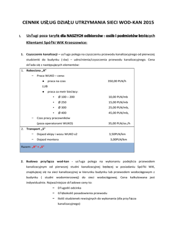 CENNIK USŁ UG DZIAŁU UTRZYMANIA SIECI WOD-KAN 2015 I. Usługi poza taryfądla NASZYCH odbiorców - osób i podmiotów będących Klientami Spółki WiK Krzeszowice: 1. Czyszczenie kanalizacji – usługa polega na czyszczeniu przewodu kanalizacyjnego od pierwszej studzienki do budynku (-ów) – udrożnienia/czyszczenia przewodu kanalizacyjnego. Cena składa sięz następujących elementów: 1. Robocizna ,,R" − Praca WUKO – cena: ● praca na czas 350,00 PLN/h LUB ● − praca za metr bieżący: ▪ Ø 100 – 200 10,00 PLN/mb ▪ Ø 250 15,00 PLN/mb ▪ Ø 300 25,00 PLN/mb, ▪ Ø 400 45,00 PLN/mb, Czas pracy pracowników (poza operatorami WUKO) 35,00 PLN/os./h 2. Transport ,,S" − Dojazd ekipy i wozu WUKO x2 − Dojazd montera 3,50PLN/km 3,00PLN/km Razem: „R” + „S” 2. Budowa przyłącza wod-kan - usługa polega na wykonaniu podejścia przewodem kanalizacyjnym od pierwszej studni kanalizacyjnej będącej w posiadaniu Spółki WiK, znajdującej sięna sieci kanalizacyjnej w kierunku budynku lub przewodem wodociągowym z budynku ( studni wodomierzowej) do sieci wodociągowej. Cena kalkulowana jest indywidualnie. Najważniejsze składowe ceny to: − Długośćodcinka − Głębokośćposadowienia przewodu − Ilośćstudzienek rewizyjnych do wykonania (dla przyłącza kanalizacyjnego) − Wpięcie do kanalizacji (dla przyłącza kanalizacyjnego) − Wpięcie do sieci wodociągowej (dla przyłącza wodociągowego) − Wpięcie budynku (do instalacji wewnętrznej lub przejście przez ścianę) − Ilośćskrzyżowańz mediami − Wykonawstwo w drogach, chodnikach − Opłaty drogowe za korzystanie z pasa − Inne przeszkody terenowe (rowy, nasypy, odwodnienia powierzchniowe, elementy małej architektury) 1. Robocizna ,,R" − Czas pracy pracowników 35,00 PLN/os./h (poza operatorami koparek) − Praca koparki z operatorem: − Koparko-ładowarka CASE 110,00PLN/m-g − Minikoparka JCB 80,00PLN/m-g 2. Transport ,,S" − Dojazd montera 3,00PLN/km 3. Materiał„M” − Koszt materiału zakupionego do wykonania usługi (zgodny z ceną zakupu nowego materiału) Razem: „R” + „S” + „M” Do wykonania usługi potrzebne są: zgoda na wejście w teren, dokumentacja techniczna. Wymiana wodomierza uszkodzonego z winy Odbiorcy usług (uszkodzenie mechaniczne, rozmrożenie) wraz z plombowaniem. Cena za usługęobejmuje: 1. Robocizna ,,R" − Czas pracy 35,00PLN/os./h 2. Transport ,,S" − Dojazd montera 3,00PLN/km 3. Materiał„M” − Koszt nowego wodomierza ø15, ø20 80,00PLN (w przypadku wymiany większych średnic wodomierza – powyżej ø20 – będąstosowane stawki zgodne z cenązakupu nowego wodomierza) Razem: „R” + „S” + „M” 3. Plombowanie wodomierza - po zerwaniu plomby z winy Odbiorcy . Cena za usługęobejmuje: 1. Robocizna ,,R" − Czas pracy 35,00PLN/os./h 2. Transport ,,S" − Dojazd montera 3,00PLN/km Razem: „R” + „S” + „M” 4. Zamknięcie lub odcięcie wody ze względu na: − okres zimowy (ściągnięcie wodomierza): 1. Robocizna ,,R" − Czas pracy 35,00PLN/os./h 2. Transport ,,S" − Dojazd montera 3,00PLN/km Razem: „R” + „S” + „M” 5. Wymiana zaworu przed lub za wodomierzem głównym: 1. Robocizna ,,R" − Czas pracy 35,00PLN/os./h 2. Transport ,,S" − Dojazd montera 3,00PLN/km 3. Materiał„M” − Koszt zaworu uzależniony od średnicy przewodu - stawka zgodna z cenązakupu nowego zaworu Razem: „R” + „S” + „M” 6. Usunięcie awarii na sieci/przyłącza wod-kan z winy Wykonawcy - wg kalkulacji indywidualnej: 1. Robocizna ,,R" − Czas pracy pracowników 35,00 PLN/os./h (poza operatorami koparek) − Praca koparki z operatorem: − Koparko-ładowarka CASE 110,00PLN/m-g − Minikoparka JCB 80,00PLN/m-g 2. Transport ,,S" − Dojazd montera 3,00PLN/km 3. Materiał„M” − Stawka zgodna z cenązakupu nowego materiału Razem: „R” + „S” + „M” 7. Wymknięcie wody w sytuacji posadowienia innych sieci niżwod-kan: 1. Robocizna ,,R" − Czas pracy pracowników 35,00 PLN/os./h 2. Transport ,,S" − Dojazd montera 3. Materiał„M” − strata wody - za 100m3 wg cennika Razem: „R” + „S” + „M” 3,00PLN/km 8. Ekspertyza wodomierza 1. Robocizna ,,R" − Czas pracy pracowników 35,00 PLN/os./h 2. Transport ,,S" − Dojazd montera 3,00PLN/km 3. Ekspertyza wodomierza − zwrot kosztów ekspertyzy - wg. ceny za ekspertyzęwodomierza Razem: „R” + „S” + „M” 9. Wykrywanie awarii na zlecenie - usługa polega na lokalizacji awarii na odcinku przyłącza kanalizacyjnego poprzez kamerowanie przewodu: 1. Robocizna ,,R" − Czas pracy pracowników 35,00 PLN/os./h − opłata za zakres prac 2,00PLN/mb 2. Transport ,,S" − Dojazd montera 3,00PLN/km Razem: „R” + „S” + „M” 10. Opłata za ponowne włączenie przyłącza wodociągowego do sieci wodociągowej (zgodnie z zatwierdzonąpozytywnąopiniąo stanie technicznym przyłącza przez DziałTechniczny): 1. Robocizna ,,R" − Czas pracy pracowników 35,00 PLN/os./h (poza operatorami koparek) − Praca koparki z operatorem: ● Koparko-ładowarka CASE 110,00PLN/m-g ● Minikoparka JCB 80,00PLN/m-g 2. Transport ,,S" − Dojazd montera − Dowóz minikoparki JCB 3. Opłata za włączenie do sieci wodociągowej − Stawka za pojedyncze uruchomienie przyłącza 1000,00PLN/km 3,00PLN/km 3,00PLN/km 4. Opłata za ewentualne zajęcia pasa drogowego − zajęcie pasa - wg. cennika Właściciela pasa drogowego 5. Materiał − Stawka za materiałdo wpięcia do sieci wodociągowej 200,00PLN/kpl Razem: „R” + „S” + „M” 11. Opłata za ponowne włączenie przyłącza kanalizacyjnego do sieci kanalizacyjnej (zgodnie z zatwierdzonąpozytywnąopiniąo stanie technicznym przyłącza przez DziałTechniczny): 1. Robocizna ,,R" − Czas pracy pracowników 35,00 PLN/os./h (poza operatorami koparek) − Praca koparki z operatorem: ● Koparko-ładowarka CASE 110,00PLN/m-g ● Minikoparka JCB 80,00PLN/m-g 2. Transport ,,S" − Dojazd montera − Dowó