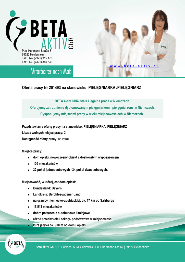 Paul-Hartmann-Straße 61 89522 Heidenheim Tel.: +49 (7321) 315 173 Fax: +49 (7321) 345 832 www.beta-aktiv.pl Oferta pracy Nr 201493 na stanowisku PIELĘGNIARKA /PIELĘGNIARZ BETA aktiv GbR- stała i legalna praca w Niemczech. Oferujemy zatrudnienie dyplomowanym pielęgniarkom i pielęgniarzom w Niemczech. Dysponujemy miejscami pracy w wielu miejscowościach w Niemczech . Przedstawiamy ofertę pracy na stanowisko: PIELĘGNIARKA, PIELĘGNIARZ Liczba wolnych miejsc pracy: 2 Dostępność oferty pracy: od zaraz . Miejsce pracy: dom opieki, nowoczesny obiekt z doskonałym wyposażeniem 100 mieszkańców 32 pokoi jednoosobowych i 34 pokoi dwuosobowych. Miejscowość, w której jest dom opieki: Bundesland: Bayern Landkreis: Berchtesgadener Land na granicy niemiecko-austriackiej, ok. 17 km od Salzburga 17.513 mieszkańców dobre połączenie autobusowe i kolejowe różne przedszkola i szkoły- podstawowa w miejscowości kurs języka ok. 900 m od domu opieki Beta aktiv GbR | E. Sobiech, A. M. Schimizek | Paul-Hartmann-Str. 61 | 89522 Heidenheim Wymagania: wykształcenie kierunkowe: dyplom pielęgniarstwa licencjat/ magister samodzielność i odpowiedzialność związana z wykonywaniem zawodu pielęgniarki, pielęgniarza chęć podjęcia długofalowej współpracy z niemieckim pracodawcą znajomość języka niemieckiego: minimum poziom A2. gotowość do wyjazdu za granicę na minimum rok Oferujemy: Wynagrodzenie 1.900,00 € brutto (przed nostryfikacją) + 50,00 Euro mies. + dodatki za pracę w niedziele i święta Wynagrodzenie 2.500,00 € brutto (po nostryfikacji) + 50,00 Euro mies. + dodatki za pracę w niedziele i święta polskojęzyczną obsługę podczas procesów rejestracyjnych w Niemczech przeprowadzamy proces nostryfikacji dyplomu zatrudnienie na 100% etatu, ok. 170 godzin w miesiącu zakwaterowanie: wstępnie w domu opieki pomoc przy znalezieniu mieszkania umowę o pracę zawartą na niemieckich warunkach i bezpośrednio z niemieckim pracodawcą. Jak z sukcesem i bez ryzyka podjąć się tej pracy? Skontaktuj się z naszym przedstawicielem w Polsce pod numer 505 123 391. Po pozytywnym przejściu pierwszej rozmowy kwalifikacyjnej: wypełnij otrzymane formularze. W ciągu 5 dni roboczych zgłosimy się do Ciebie telefonicznie. Zaprosimy Cię na 2 dni próbnej pracy u Twojego przyszłego pracodawcy. Podpiszesz umowę o pracę bezpośrednio z niemieckim pracodawcą. ________________________________________________________________________________________________ Prosimy o przesłanie wstępnej aplikacji na adres: [email protected] Zapraszamy do kontaktu telefonicznego na numer 0048 505 123 391 Erreichen Sie zusammen mit uns schnell und effektiv Ihre Ziele. Beta aktiv GbR | E. Sobiech, A. M. Schimizek | Paul-Hartmann-Str. 61 | 89522 Heidenheim Bądźmy partnerami. Przyłącz się do grupy pielęgniarek i pielęgniarzy, którzy skorzystali już z naszych ofert pracy Beta aktiv GbR | E. Sobiech, A. M. Schimizek | Paul-Hartmann-Str. 61 | 89522 Heidenheim