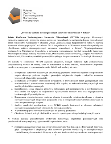 „Problemy sektora nieenergetycznych surowców mineralnych w Polsce” Polska Platforma Technologiczna Surowców Mineralnych (PPTSM) integrująca kluczowych partnerów naukowych i przemysłu sektora surowców mineralnych, w nawiązaniu do prac prowadzonych przez Ministerstwo Gospodarki w obszarze „Planu Działań na rzecz bezpieczeństwa Polski w zakresie surowców nieenergetycznych”, w kwietnia 2015r zorganizowała w Warszawie seminarium poświęcone „Problemom sektora nieenergetycznych surowców mineralnych w Polsce”. Współorganizatorem spotkania było Ministerstwo Gospodarki, a partnerami wspierającymi: Instytut Gospodarki Surowcami Mineralnymi i Energią Polskiej Akademii Nauk, Dolnośląski Klaster Surowcowy, Związek Pracodawców Polska Miedź, Klaster Gospodarki Odpadowej i Recyklingu, Instytut Autostrada Technologii i Innowacji. Do udziału w seminarium PPTSM zaprosiła ekspertów, których zadaniem było podsumowanie dotychczasowej wiedzy na tematy, które w Założeniach do Planu Działań, Ministerstwo Gospodarki uznało za wymagające przeprowadzenia analiz. Wśród nich znalazły się min.: 1. Identyfikacja surowców kluczowych dla polskiej gospodarki omawiana łącznie z rozpoznaniem stopnia obecnego poziomu odzysku i potencjału zwiększenia odzysku z odpadów surowców kluczowych dla polskiej gospodarki. 2. Identyfikacja problemów społecznych związanych z prowadzeniem robót geologicznych oraz uruchamianiem i prowadzeniem eksploatacji złóż kopalin, ze wskazaniem dobrych praktyk oraz możliwych środków zaradczych. 3. Kompleksowa ocena obciążeń górnictwa płatnościami publicznoprawnymi i cywilnoprawnymi oraz analiza ich wpływu na racjonalność wykorzystania zasobów złóż oraz międzynarodową konkurencyjność przedsiębiorstw. 4. Rozpoznanie stopnia obecnego poziomu odzysku i potencjału zwiększenia odzysku z odpadów surowców kluczowych dla polskiej gospodarki, wraz z oceną możliwości wdrożenia rozwiązań na rzecz zwiększenia tego odzysku. 5. Analiza zasadności uruchomienia przez NCBiR agendy badawczej w obszarze substytucji surowców nieenergetycznych istotnych dla polskiej gospodarki. 6. Wspieranie napływu surowców kluczowych dla polskiej gospodarki. 7. Określenie dobrych praktyk dla Polski w zakresie zapobiegania nielegalnej eksploatacji kopalin. W wyniku dyskusji przedstawicieli środowiska naukowego, organizacji pozarządowych oraz przedstawicieli strony rządowej, zgłoszono kilka postulatów, min.: zwrócenie szczególnej uwagi na pozyskiwanie surowców bez koncesji i odpowiednich pozwoleń, gdyż udostępnienie i eksploatacja złóż surowców powinna rozwijać się w uporządkowanych i ustabilizowanych warunkach. Dotyczy to również konieczności wprowadzenia zmian prawnych 1 i organizacyjnych, promujących odzysk i recykling surowców, szczególnie ze zużytego sprzętu elektrycznego, elektronicznego, jak i innych źródeł. W obszarze identyfikacji surowców kluczowych dla polskiej gospodarki, należy wyraźnie zdefiniować kryteria ich wyboru. Należy wskazać kierunki dla strumienia odpadów z uwzględnieniem odpowiednich systemów ich przerobu. Należy zwrócić uwagę na problem niejednorodności złóż antropogenicznych, a jednocześnie, że każde z nich (włącznie z urban mining) ma wyższe koncentracje istotnych pierwiastków niż występujące w złożach naturalnych. W obszarze obciążeń górnictwa płatnościami publicznoprawnymi i cywilnoprawnymi obecnie zauważalny jest nadmierny fiskalizm, który nie pozwala na racjonalne pozyskiwanie surowców. Koniecznym jest wypracowanie odpowiedniego modelu naliczania opłat, który nie będzie wprowadzał nowych instrumentów podatkowych, tylko je upraszczał. Na rynku surowcowym pojawia się dużo wątków zagranicznych, należy pogłębić informacje jakiego typu przedsiębiorstwa sięgają po surowce trudno dostępne. Czy obce koncerny dostarczają nam te surowce? Jeżeli są to polskie przedsiębiorstwa to jest to pole do działania dla administracji państwowej. Im więcej informacji od przedsiębiorstw tym lepsze i bardziej skuteczne działanie ministerstwa. Jeśli firma płaci podatki w Polsce lub operuje na rynkach zagranicznych poprzez nasz kraj to też powinniśmy ją wspierać. Ważny problem stanowi substytucja w przypadku zagrożenia dostaw surowców krytycznych. W Polsce problem ten dotyczy 21 pierwiastków. Niezbędna dla tego działania jest agenda badawcza, umieszczenie substytutów w inteligentnych specjalizacjach itp. Istotnym jest także „wypływ” odpadów z Polski, cennych pod względem możliwości odzysku z nich surowców. Obowiązujące rozporządzenia w krajach UE regulują to. W Polsce potrzebne jest w tej sprawie odpowiednie rozporządzenie pozwalające na takie ograniczenia. Wytyczne dla Planu działań można traktować jako wstęp dla rozwoju regionów, ale niezbędne są pozytywne informacje na ten temat, które pojawią się w mediach. Pomocna w tym zakresie może być strategia Corporate Social Responsibility (CSR) – Społeczna Odpowiedzialność Biznesu, która w przypadku dużych przedsiębiorstw jest dobrze widoczna, jednak w obszarze MŚP pozostawia jeszcze wiele do życzenia. Istotne jest także uwzględnienie zaleceń i wytycznych zawartych w Global Reporting Initiative oraz działaniach europejskich i światowych. Zagadnienia społeczne obejmują każdy etap działalności wydobywczej, począwszy od eksploracji aż po likwidację zakładu górniczego, a zgodnie z polskimi uwarunkowaniami prawnymi podjęcie eksploatacji wymaga uzyskania zgody samorządu terytorialnego i dlatego właściwa polityka przedsiębiorców w tym zakresie jest kluczowym elementem powodzenia takich przedsięwzięć. Wszystkie omawiane zagadnienia dotykają ważnych problemów. Zajmują się nimi m.in. Ministerstwo Gospodarki, Polska Platforma Technologiczna Surowców Mineralnych oraz partnerzy współpracujący. Należy kontynuować dyskusję w 