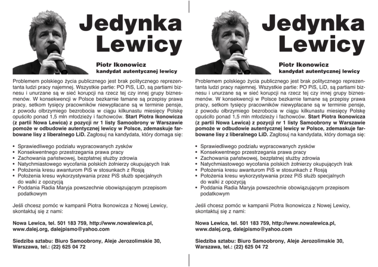 Jedynka Lewicy Jedynka Lewicy Piotr Ikonowicz Piotr Ikonowicz kandydat autentycznej lewicy kandydat autentycznej lewicy Problemem polskiego ˝ycia publicznego jest brak politycznego reprezentanta ludzi pracy najemnej. Wszystkie partie: PO PiS, LiD, sà partiami biznesu i unurzane sà w sieç korupcji na rzecz tej czy innej grupy biznesmenów. W konsekwencji w Polsce bezkarnie ∏amane sà przepisy prawa pracy, setkom tysi´cy pracowników niewyp∏acane sà w terminie pensje, z powodu olbrzymiego bezrobocia w ciàgu kilkunastu miesi´cy Polsk´ opuÊci∏o ponad 1,5 mln m∏odzie˝y i fachowców. Start Piotra Ikonowicza (z partii Nowa Lewica) z pozycji nr 1 listy Samoobrony w Warszawie pomo˝e w odbudowie autentycznej lewicy w Polsce, zdemaskuje farbowane lisy z liberalnego LiD. Zag∏osuj na kandydata, który domaga si´: Problemem polskiego ˝ycia publicznego jest brak politycznego reprezentanta ludzi pracy najemnej. Wszystkie partie: PO PiS, LiD, sà partiami biznesu i unurzane sà w sieç korupcji na rzecz tej czy innej grupy biznesmenów. W konsekwencji w Polsce bezkarnie ∏amane sà przepisy prawa pracy, setkom tysi´cy pracowników niewyp∏acane sà w terminie pensje, z powodu olbrzymiego bezrobocia w ciàgu kilkunastu miesi´cy Polsk´ opuÊci∏o ponad 1,5 mln m∏odzie˝y i fachowców. Start Piotra Ikonowicza (z partii Nowa Lewica) z pozycji nr 1 listy Samoobrony w Warszawie pomo˝e w odbudowie autentycznej lewicy w Polsce, zdemaskuje farbowane lisy z liberalnego LiD. Zag∏osuj na kandydata, który domaga si´: • • • • • • Sprawiedliwego podzia∏u wypracowanych zysków Konsekwentnego przestrzegania prawa pracy Zachowania paƒstwowej, bezp∏atnej s∏u˝by zdrowia Natychmiastowego wycofania polskich ˝o∏nierzy okupujàcych Irak Po∏o˝enia kresu awanturom PiS w stosunkach z Rosjà Po∏o˝enia kresu wykorzystywania przez PiS s∏u˝b specjalnych do walki z opozycjà • Poddania Radia Maryja powszechnie obowiàzujàcym przepisom podatkowym • • • • • • JeÊli chcesz pomóc w kampanii Piotra Ikonowicza z Nowej Lewicy, skontaktuj si´ z nami: JeÊli chcesz pomóc w kampanii Piotra Ikonowicza z Nowej Lewicy, skontaktuj si´ z nami: Nowa Lewica, tel. 501 183 759, http://www.nowalewica.pl, www.dalej.org, [email protected] Nowa Lewica, tel. 501 183 759, http://www.nowalewica.pl, www.dalej.org, [email protected] Siedziba sztabu: Biuro Samoobrony, Aleje Jerozolimskie 30, Warszawa, tel.: (22) 625 04 72 Siedziba sztabu: Biuro Samoobrony, Aleje Jerozolimskie 30, Warszawa, tel.: (22) 625 04 72 Sprawiedliwego podzia∏u wypracowanych zysków Konsekwentnego przestrzegania prawa pracy Zachowania paƒstwowej, bezp∏atnej s∏u˝by zdrowia Natychmiastowego wycofania polskich ˝o∏nierzy okupujàcych Irak Po∏o˝enia kresu awanturom PiS w stosunkach z Rosjà Po∏o˝enia kresu wykorzystywania przez PiS s∏u˝b specjalnych do walki z opozycjà • Poddania Radia Maryja powszechnie obowiàzujàcym przepisom podatkowym