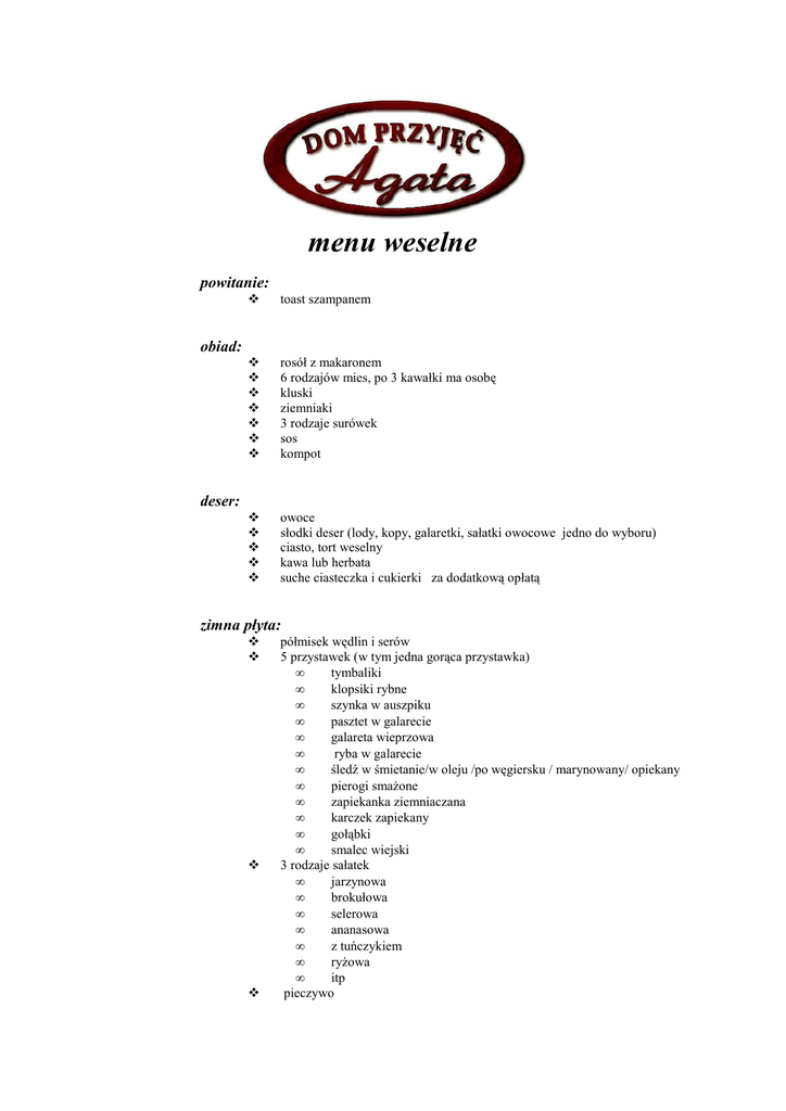 menu weselne powitanie: toast szampanem rosół z makaronem 6 rodzajów mies, po 3 kawałki ma osobę kluski ziemniaki 3 rodzaje surówek sos kompot owoce słodki deser (lody, kopy, galaretki, sałatki owocowe jedno do wyboru) ciasto, tort weselny kawa lub herbata suche ciasteczka i cukierki za dodatkową opłatą obiad: deser: zimna płyta: półmisek wędlin i serów 5 przystawek (w tym jedna gorąca przystawka) • tymbaliki • klopsiki rybne • szynka w auszpiku • pasztet w galarecie • galareta wieprzowa • ryba w galarecie • śledź w śmietanie/w oleju /po węgiersku / marynowany/ opiekany • pierogi smaŜone • zapiekanka ziemniaczana • karczek zapiekany • gołąbki • smalec wiejski 3 rodzaje sałatek • jarzynowa • brokułowa • selerowa • ananasowa • z tuńczykiem • ryŜowa • itp pieczywo kolacja I mięso pieczone: • schab • karczek • łopatka • golonka • mini koryta • kurczak • kaczka faszerowana • świnki z formy ryby smaŜone: • pstrąg • łosoś frytki kluski smaŜone ziemniaki po chłopsku pieczywo dodatkowa sałatka dodatki dobierane są w zaleŜności od wybranej potrawy kloacja II gulasz gulasz węgierski bogracz flaczki bigos strogonoff jedno danie do wyboru kolacja III barszcz z krokietem Ŝurek z jakiem i kiełbasą jedno danie do wyboru Napoje gazowane, niegazowane, soki według Ŝyczenia klienta, płatne po imprezie. Przedstawiliśmy Państwu naszą przykłądową ofertę, jesteśmy jednak otwarci na inne propozycje dań. Wystrój sali w gestii Państwa Młodych do uzgodnienia w terminie nie kolidującuym z innym imprezami. Dysponujemy miejscami noclegowymi dla gości.