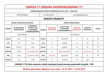 UWAGA !!! ZMIANA HARMONOGRAMU !!! HARMONOGRAM WYWOZU ODPADÓW OD 02.01.2017 - 30.06.2017 PUM GRUDZIĄDZ tel. 695 259 000 www.odpadyprabuty.pl MIASTO PRABUTY ODPADY KOMUNALNE ZMIESZANE MIESIĄC OD WSZYSTKICH MIESZKAŃCÓW ODPADY SEGREGOWANE DODATKOWY WYWÓZ TYLKO Z BUDYNKÓW MIESIĄC WIELORODZINNYCH PLASTIK OD WSZYSTKICH PLASTIK TYLKO Z BUDYNKÓW WIELORODZINNYCH DNI WYWOZU PAPIER OD WSZYSTKICH SZKŁO OD WSZYSTKICH POPIÓŁ DNI WYWOZU Styczeń 4,18 11,25 Styczeń 2 9,16,23,30 9 16 23 Luty 1,15 8,22 Luty 6 13,20,27 13 20 27 Marzec 1,15,29 8,22 Marzec 6 13,20,27 13 20 27 Kwiecień 12,26 5, 14 (piątek), 19 Kwiecień 3 10, 18 (wtorek) 24 10 18 (wtorek) 24 Maj 10,24 4 (czwartek), 17,31 Maj 2 (wtorek) 8,15,22,29 8,29 15 29 Czerwiec 7,21 14,28 Czerwiec 5 12,19,26 19 5,26 ― UWAGA !!! W dniu wywozu należy wystawić przed posesję pojemnik do godz. 7:00 Zbiórka gabarytów odbędzie się w dniu: 22.03.2017 i 31.05.2017 ZASADY SEGREGACJI ODPADÓW NA TERENIE MIASTA PRABUTY „PLASTIK” wyrzucamy: – butelki plastikowe po napojach (zgniecione) – butelki po płynach do mycia – plastikowe zakrętki – plastikowe torebki, worki, reklamówki – plastikowe koszyczki po owocach – puszki po napojach oraz po warzywach i owocach konserwowych (np. groszku, brzoskwiniach) – metale, drobny żelazny złom – kolorowe kapsle – czyste plastikowe opakowania po produktach żywnościowych np. po jogurtach, serach, margarynach – pojemniki po artykułach sypkich – opakowania typu "tetrapack" – opakowania wielomateriałowe np. po mleku, sokach nie wyrzucamy: – pojemników i butelek z zawartością – zabawek, styropianu – opakowań po lekach – sprzętu AGD, baterii – butelek po płynach chłodniczych – pojemników i butelek po olejach (spożywczych, chłodniczych, silnikowych) – puszek po farbach, gumy – opakowań po aerozolach – pojemników po wyrobach garmażeryjnych – opakowań po środkach – owadobójczych i chwastobójczych – zatłuszczonych folii np. po mięsie lub rybie „PAPIER” wyrzucamy: – gazety, czasopisma, – papier biurowy i szkolny – książki, katalogi – kartonowe i tekturowe pudełka – ścinki drukarskie, – zapisane kartki – papierowe torebki „SZKŁO” nie wyrzucamy: wyrzucamy: nie wyrzucamy: – tłustego i brudnego papieru – papieru przebitkowego, – kalki, tapet – pieluch jednorazowych, podpasek – worków po cemencie – artykułów i papierów higienicznych – butelki szklane po napojach i sokach bez zakrętek – słoiki bez wieczek – szklane opakowania po kosmetykach – butelki po napojach alkoholowych – szkła stołowego i kryształowego, szkła żaroodpornego – porcelany, ceramiki i fajansu – doniczek, opakowań po lekach – luster, witraży, szyb okiennych i drzwiowych – reflektorów i żarówek – lamp neonowych, fluorescencyjnych, rtęciowych izolatorów – szkła okularowego – ekranów i lamp telewizyjnych – szyb samochodowych „POPIÓŁ” wyrzucamy: nie wyrzucamy: popiół żużel innych odpadów niż popiół i żużel UWAGA!!! Zbiórka odpadów wielkogabarytowych odbędzie się dnia 22.03.2017 r. i 31.05.2017 r. Zapotrzebowanie na ich odbiór należy zgłosić przed w/w terminem do Urzędu Miasta i Gminy w Prabutach tel. (55) 246 07 34 Punkt selektywnej zbiórki odpadów komunalnych przy ul. Koszarowej 1 tel. 603 526 772 czynny jest w piątek od 12:00 do 18:00 oraz w sobotę od 8:00 do 18:00 (w styczniu do godz. 16:00) UWAGA !!! ZMIANA HARMONOGRAMU !!! HARMONOGRAM WYWOZU ODPADÓW OD 02.01.2017 - 30.06.2017 PUM GRUDZIĄDZ tel. 695 259 000 www.odpadyprabuty.pl [email protected] OBRZYNOWO, JAKUBOWO, PACHUTKI, JULIANOWO, HALINOWO ODPADY KOMUNALNE ZMIESZANE MIESIĄC ODPADY OD WSZYSTKICH MIESZKAŃCÓW MIESIĄC PLASTIK OD WSZYSTKICH MIESZKAŃCÓW PAPIER OD WSZYSTKICH MIESZKAŃCÓW DNI WYWOZU SZKŁO OD WSZYSTKICH MIESZKAŃCÓW POPIÓŁ DNI WYWOZU Styczeń 13,27 Styczeń 5 5 (czwartek) 5 (czwartek) 19 Luty 10,24 Luty 2 10 10 16 Marzec 10,24 Marzec 2 10 10 16 Kwiecień 7,21 Kwiecień 6 7 7 20 Maj 5,19 Maj 4 (czwartek) 5 5 18 Czerwiec 2, 17 (sobota), 30 Czerwiec 1 2 2 ― UWAGA !!! W dniu wywozu należy wystawić przed posesję pojemnik do godz. 7:00 Zbiórka gabarytów odbędzie się w dniu: 30.03.2017 i 31.05.2017 ZASADY SEGREGACJI ODPADÓW NA TERENIE GMINY PRABUTY „PLASTIK” wyrzucamy: – butelki plastikowe po napojach (zgniecione) – butelki po płynach do mycia – plastikowe zakrętki – plastikowe torebki, worki, reklamówki – plastikowe koszyczki po owocach – puszki po napojach oraz po warzywach i owocach konserwowych (np. groszku, brzoskwiniach) – metale, drobny żelazny złom – kolorowe kapsle – czyste plastikowe opakowania po produktach żywnościowych np. po jogurtach, serach, margarynach – pojemniki po artykułach sypkich – opakowania typu "tetrapack" – opakowania wielomateriałowe np. po mleku, sokach nie wyrzucamy: – pojemników i butelek z zawartością – zabawek, styropianu – opakowań po lekach – sprzętu AGD, baterii – butelek po płynach chłodniczych – pojemników i butelek po olejach (spożywczych, chłodniczych, silnikowych) – puszek po farbach, gumy – opakowań po aerozolach – pojemników po wyrobach garmażeryjnych – opakowań po środkach – owadobójczych i chwastobójczych – zatłuszczonych folii np. po mięsie lub rybie „PAPIER” wyrzucamy: – gazety, czasopisma, – papier biurowy i szkolny – książki, katalogi – kartonowe i tekturowe pudełka – ścinki drukarskie, – zapisane kartki – papierowe torebki „SZKŁO” nie wyrzucamy: wyrzucamy: nie wyrzucamy: – tłustego i brudnego papieru – papieru przebitkowego, – kalki, tapet – pieluch jednorazowych, podpasek – worków po cemencie – artykułów i papierów higienicznych – butelki szklane po napojach i sokach bez zakrętek – słoiki bez wieczek – szklane opakowania po kosmetykach – butelki po napojach alkoholowych – szkła stołowego i kryształowego,