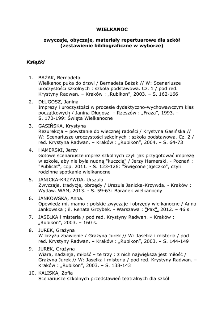 WIELKANOC zwyczaje, obyczaje, materiały repertuarowe dla szkół (zestawienie bibliograficzne w wyborze) Książki 1. BAŻAK, Bernadeta Wielkanoc puka do drzwi / Bernadeta Bażak // W: Scenariusze uroczystości szkolnych : szkoła podstawowa. Cz. 1 / pod red. Krystyny Radwan. – Kraków : „Rubikon”, 2003. – S. 162-166 2. DŁUGOSZ, Janina Imprezy i uroczystości w procesie dydaktyczno-wychowawczym klas początkowych / Janina Długosz. – Rzeszów : „Fraza”, 1993. – S. 170-199: Święta Wielkanocne 3. GASIŃSKA, Krystyna Rezurekcja – powstanie do wiecznej radości / Krystyna Gasińska // W: Scenariusze uroczystości szkolnych : szkoła podstawowa. Cz. 2 / red. Krystyna Radwan. – Kraków : „Rubikon”, 2004. – S. 64-73 4. HAMERSKI, Jerzy Gotowe scenariusze imprez szkolnych czyli jak przygotować imprezę w szkole, aby nie była nudną "kuczcią" / Jerzy Hamerski. - Poznań : "Publicat", cop. 2011. - S. 123-126: "Święcone jajeczko", czyli rodzinne spotkanie wielkanocne 5. JANICKA-KRZYWDA, Urszula Zwyczaje, tradycje, obrzędy / Urszula Janicka-Krzywda. - Kraków : Wydaw. WAM, 2013. - S. 59-63: Baranek wielkanocny 6. JANKOWSKA, Anna. Opowiedz mi, mamo : polskie zwyczaje i obrzędy wielkanocne / Anna Jankowska ; il. Renata Grzybek. - Warszawa : "Pax", 2012. – 46 s. 7. JASEŁKA i misteria / pod red. Krystyny Radwan. – Kraków : „Rubikon”, 2003. – 160 s. 8. JUREK, Grażyna W krzyżu zbawienie / Grażyna Jurek // W: Jasełka i misteria / pod red. Krystyny Radwan. – Kraków : „Rubikon”, 2003. – S. 144-149 9. JUREK, Grażyna Wiara, nadzieja, miłość – te trzy : z nich największa jest miłość / Grażyna Jurek // W: Jasełka i misteria / pod red. Krystyny Radwan. – Kraków : „Rubikon”, 2003. – S. 138-143 10. KALISKA, Zofia Scenariusze szkolnych przedstawień teatralnych dla szkół podstawowych / Zofia Kaliska, Beata Jacewicz. - Białystok : "Printex", 2010. - S. 47-58: Wielkanoc 11. KAMOCKI, Janusz Polski rok obrzędowy / Janusz Kamocki. – Kraków : Towarzystwo Autorów i Wydawców Prac Naukowych „Universitas”, cop. 2008. – S. 142-152: Wielkanoc 12. LIPKA, Jerzy O jajku prawie wszystko czyli O wielkim dziele sztuki na małej skorupce / Jerzy Lipka. – Opole : „Nowik”, 2005. – 156 s. 13. ŁACIAK, Beata Obyczajowość polska czasu transformacji czyli wojna postu z karnawałem / Beata Lipka. – Warszawa : „Trio”, 2005. – S. 251-334: Obyczajowość świąteczna 14. MACHOWSKA, Renata Z Chrystusem wczoraj, dziś na wieki / Renata Machowska // W: Jasełka i misteria / pod red. Krystyny Radwan. – Kraków : „Rubikon”, 2003. – S. 89-95 15. MAJ, Magdalena Święta Wielkanocne w obyczaju / Magdalena Maj, Justyna Zaremba // W: Scenariusze uroczystości szkolnych : gimnazjum i szkoły ponadgimnazjalne. Cz. 2 / red. Teresa Król. – Kraków : „Rubikon”, 2005. – S. 83-90 16. MAZIARZ-WYSOCKA, Aleksandra Sacrum i profanum w obrzędowości związanej ze świętami Wielkiej Nocy / Aleksandra Maziarz-Wysocka // W: Pedagogika zabawy w edukacji kulturalnej / pod red. Elzbiety Kędzior-Niczyporuk. – Lublin : „Klanza”, 2006. – S. 158-162 17. MIKA, Krystyna Wielkanocne świętowanie / Krystyna Mika // W: Scenariusze na cały rok... : (szkolne uroczystości, imprezy , widowiska). Cz. 1 / pod red. Elżbiety Doroszkiewicz, Krystyny Staszewskiej. – Kielce : Wydaw. Pedagogiczne, 1995. – S. 79-94 18. MIKLASZ, Iwona Przedstawienie wielkanocne / Iwona Miklasz, Mariola Wolnik // W: Uroczystości dla najmłodszych w szkole podstawowej : przedstawienia, teatrzyki, wiersze / [red. Barbara Bleja-Sosna], 2006. – S. 31-34 19. NADOLNA, Urszula Barwy pór roku : scenariusze uroczystości w przedszkolu / Urszula Nadolna, Bożena Stącel-Winiarska. - Kraków : Centrum Edukacyjne Bliżej Przedszkola, 2011. - S. 237-243: Wielkanocne zwyczaje scenariusz dla wszystkich grup przedszkolnych 20. NADOLNA, Urszula Barwy pór roku : scenariusze uroczystości w przedszkolu / Urszula Nadolna, Bożena Stącel-Winiarska. - Kraków : Centrum Edukacyjne Bliżej Przedszkola, 2011. - S. 243-246: Niespodzianki wielkanocne scenariusz dla wszystkich grup przedszkolnych 21. OGRODOWSKA, Barbara Polskie obrzędy i zwyczaje doroczne / Barbara Ogrodowska. – Wyd. 2. – Warszawa : „Sport i Turystyka”, „Muza”, 2005. – S. 126-179: Czas świąteczny wielkanocny 22. OGRODOWSKA, Barbara Święta polskie – tradycja i obyczaj / Barbara Ogrodowska. – Wyd.2. – Warszawa : „Alfa-Wero”, 2000. – S. 167-226: Niedziela Palmowa, Wielki Tydzień, Wielkanoc 23. PERTLER, Cordula Dzieci świętują Wielkanoc / Cordula Pertler, Eva Reuys. – Kielce : ”Jedność”, cop. 2003. – 69 s. 24. PRZYMUS, Ryszard Inscenizacje pełne radości : dla klas 1-3 / Ryszard Przymus. – Łódź : „Juka”, 1995. – S. 117-122: Wielkanocne obyczaje 25. PRZYMUS, Ryszard Uroczystości pełne radości : (dla klas 1-3) / Ryszard Przymus. – Łódź : „Juka”, 1995. – S. 100-106: Pisanki, kraszanki 26. RADWAN, Krystyna Na dróżkach kalwaryjskich / Krystyna Radwan // W: Jasełka i misteria / pod red. Krystyny Radwan. – Kraków : „Rubikon”, 2003. – S. 133-137 27. SKUBIS-TYSZEWSKA, Barbara Czy można naprawdę zdjąć serce z krzyża / Barbara Skubis Tyszewska // W: Jasełka i misteria / pod red. Krystyny Radwan. – Kraków : „Rubikon”, 2003. – S. 150-160 28. SŁOJKOWSKA-AFFELSKA, Sylwia Obrzędy i zwyczaje wielkanocne na terenie Białej Puszczy Kurpiowskiej – dawniej i dziś / Sylwia Słojkowska-Affelska // W: Edukacja regionalna / red. nauk. Anna Weronika Brzezińska, Aleksandra Hulewska, Justyna Słomska. – Warszawa : Wydaw. Naukowe PWN, 2006. – S. 351-356 29. STANISZEWSKA, Danuta Gaiczek zielony, rzecz o polskich obyczajach wielkanocnych / Danuta Staniszewska // W: Szkolne teatrzyki na cztery pory roku : praca zbiorowa / pod red. Iwony Fechner-Sędzickiej. – Toruń : „Aker”, 2005. – S. 90-98 30. WALTER, Philippe Mitologia chrześcijańska 
