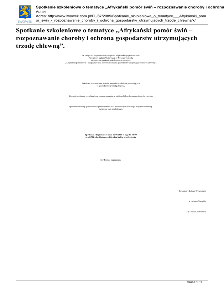 Spotkanie szkoleniowe o tematyce „Afrykański pomór świń – rozpoznawanie choroby i ochrona Autor: Adres: http://www.lwowek.com.pl/PL/87/2089/Spotkanie_szkoleniowe_o_tematyce___Afrykanski_pom or_swin_-_rozpoznawanie_choroby_i_ochrona_gospodarstw_utrzymujacych_trzode_chlewna/k/ Spotkanie szkoleniowe o tematyce „Afrykański pomór świń – rozpoznawanie choroby i ochrona gospodarstw utrzymujących trzodę chlewną”. W związku z zagrożeniem wystąpienia afrykańskiego pomoru świń Powiatowy Lekarz Weterynarii w Nowym Tomyślu zaprasza na spotkanie szkoleniowe o tematyce „Afrykański pomór świń – rozpoznawanie choroby i ochrona gospodarstw utrzymujących trzodę chlewną”. Szkolenie przeznaczone jest dla wszystkich rolników posiadających w gospodarstwie trzodę chlewną. W czasie spotkania przedstawione zostaną prezentacje multimedialne dotyczące objawów choroby, sposobów ochrony gospodarstwa przed chorobą oraz prezentacja z ostatniego przypadku choroby na terenie woj. podlaskiego. Spotkanie odbędzie się w dniu 16.08.2016 r. o godz. 13:00 w sali Miejsko-Gminnego Ośrodka Kultury we Lwówku Serdecznie zapraszam. Powiatowy Lekarz Weterynarii w Nowym Tomyślu (-) Tomasz Jurkiewicz strona 1 / 1 Powered by TCPDF (www.tcpdf.org)