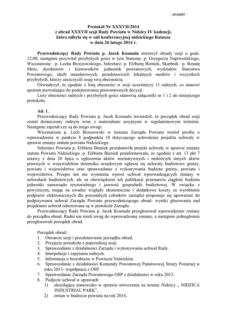 - projekt - Protokół Nr XXXVII/2014 z obrad XXXVII sesji Rady Powiatu w Nidzicy IV kadencji, która odbyła się w sali konferencyjnej nidzickiego Ratusza w dniu 26 lutego 2014 r. Przewodniczący Rady Powiatu p. Jacek Kosmala otworzył obrady sesji o godz. 12:00, następnie przywitał przybyłych gości w tym Starostę- p. Grzegorza Napiwodzkiego, Wicestarostę - p. Lecha Brzozowskiego, Sekretarz- p. Elżbietę Bieniek, Skarbnik –p. Renatę Mróz, dyrektorów i kierowników jednostek powiatowych, wydziałów Starostwa Powiatowego, służb mundurowych, przedstawicieli lokalnych mediów i wszystkich przybyłych, którzy zaszczycili sesję swą obecnością. Oświadczył, że zgodnie z listą obecności w sesji uczestniczy 11 radnych, co stanowi quorum pozwalające do podejmowania prawomocnych decyzji. Listy obecności radnych i przybyłych gości stanowią załączniki nr 1 i 2 do niniejszego protokołu. Ad. 1. Przewodniczący Rady Powiatu p. Jacek Kosmala stwierdził, że porządek obrad sesji został dostarczony radnym wraz z materiałami sesyjnymi w regulaminowym terminie. Następnie zapytał czy są do niego uwagi. Wicestarosta p. Lech Brzozowski w imieniu Zarządu Powiatu wniósł prośbę o wprowadzenie w punkcie 8 podpunktu 10 dotyczącego uchwalenia projektu uchwały w sprawie zmiany statutu powiatu Nidzickiego. Sekretarz Powiatu p. Elżbieta Bieniek przedstawiła projekt uchwały w sprawie zmiany statutu Powiatu Nidzickiego. p. Elżbieta Bieniek poinformowała, że zgodnie z art. 13 pkt 7 ustawy z dnia 20 lipca o ogłoszeniu aktów normatywnych i niektórych innych aktów prawnych w wojewódzkim dzienniku urzędowym ogłasza się uchwały budżetowe gminy, powiatu i województwa oraz sprawozdanie z wykonywania budżetu gminy, powiatu i województwa. Przepis ten nie wymienia wprost uchwał wprowadzających zmiany w uchwałach budżetowych, ale za obowiązkiem ich publikacji przemawia ciągłość budżetu jednostki samorządu terytorialnego i jawność gospodarki budżetowej. W związku z powyższym, mając na uwadze względy ekonomiczne ( dodatkowe koszty za wyrobienie podpisów elektronicznych dla pozostałych członków zarządu) proponuje się upoważnić do podpisywania uchwał Zarządu Powiatu przewodniczącego obrad- wyniki głosowania nad projektami uchwał odnotowane są w protokole Zarządu. Przewodniczący Rady Powiatu p. Jacek Kosmala przegłosował wprowadzenie zmiany do porządku obrad. Radni nie mieli uwag do wprowadzonej zmiany, a następnie jednogłośnie przegłosowali porządek obrad. Porządek obrad: 1. Otwarcie sesji i przedstawienie porządku obrad. 2. Przyjęcie protokołu z poprzedniej sesji. 3. Sprawozdanie z działalności Zarządu i wykonywania uchwał Rady. 4. Interpelacje i zapytania radnych. 5. Informacja o bezrobociu w Powiecie Nidzickim. 6. Sprawozdanie z działalności Komendy Powiatowej Państwowej Straży Pożarnej w roku 2013- współpraca z OSP. 7. Sprawozdanie Zarządu Powiatowego OSP z działalności w roku 2013. 8. Podjecie uchwał w sprawach: 1) określająca stanowisko w sprawie utworzenia na terenie Nidzicy „ NIDZICA INDUSTRIAL PARK”, 2) zmian w budżecie powiatu na rok 2014, -2- 3) zmian w Wieloletniej Prognozie Finansowej Powiatu Nidzickiego na lata 2014-2025, 4) udzielenia pomocy finansowej dla Samorządu Województwa WarmińskoMazurskiego, 5) udzielenia pomocy finansowej dla Samorządu Województwa WarmińskoMazurskiego, 6) stanowiska dotyczącego włączenia Powiatu Nidzickiego do strefy przygranicznej objętej zasadami małego ruchu granicznego, 7) Programu Powiatu Nidzickiego na Rzecz Osób Niepełnosprawnych na lata 2014-2018, 8) ustalenia wysokości opłat za usuniecie i przechowywanie statków lub innych obiektów pływających, 9) wyrażenia zgody na oddanie w najem Sali dydaktycznej znajdującej się w budynku przy ul. Jagiełły 1 stanowiącym własność Powiatu Nidzickiego, będącym w trwałym zarządzie Zespołu Szkół Ogólnokształcących w Nidzicy, 10) zmiany Statutu Powiatu w Nidzicy. 9. Odpowiedzi na interpelacje i zapytania radnych. 10. Wolne wnioski. Ad.2. Uwag do protokołu z poprzedniej sesji nie zgłoszono, został przyjęty jednogłośnie. Ad. 3. Starosta Grzegorz Napiwodzki złożył sprawozdanie z międzysesyjnej działalności Zarządu i wykonania uchwał Rady. Sprawozdanie to stanowi załącznik nr 3 do niniejszego protokołu. Ponadto poinformował, że 22 lutego br. odbyło się spotkanie z wicemarszałkiem województwa warmińsko- mazurskiego, który zadeklarował pomoc w zadaniu związanym z modernizacją drogi 545. Radny Ryszard Kumelski zapytał czy Agencja Restrukturyzacji i Modernizacji Rolnictwa rezygnuje z pomieszczeń na ul. Wyborskiej, ponieważ zalazła inny lokal, czy zawiesza swą pracę. Następnie odniósł się do nauczania matematyki w ZSRiO w Jagarzewie. Uważa, że problem ten powinien być przedstawiony na jednym z posiedzeń Komisji Oświaty, by Radni mogli się zapoznać z prowadzonymi działaniami w w/w sprawie. Na koniec dodał, że cieszy się z wizyty Ministra Finansów p. Cichonia i ma nadzieję, że wywiąże się ze złożonych deklaracji. Starosta Grzegorz Napiwodzki odpowiedział na pierwsze pytanie Radnego Ryszarda Kumelskiego. ARiMR z siedzibą w Nidzicy postanowiła opuścić lokal na ul. Wyborskiej, ale nie zaprzestanie swojej działalności. Poszukuje większego pomieszczenia, które spełni wymagania Agencji. Następnie odniósł się do prowadzonych działań w ZSRiO w Jagarzewie. Poinformował, że od września już są prowadzone działania, by podwyższyć poziom nauczania matematyki. Dyrektor ZSRiO będzie kontrolował pracę nauczyciela matematyki i za 3 miesiące oceni jego pracę. Na koniec odniósł się do spotkania, które odbyło się z Ministrem Finansów. Powiedział, że tego typu wizyty są ze wszech miar w naszym interesie monity nasze nie zaszkodzą. Każdy przyjaciel w naszej sprawie jest mile widziany. Radny Ryszard Kumelski zaznaczył, że n