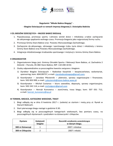 Regulamin "Młode Babice Biegają" - Biegów Dziecięcych w ramach imprezy biegowej 2. Dziesiątka Babicka I CEL BIEGÓW DZIECIĘCYCH – MŁODE BABICE BIEGAJĄ 1. Popularyzacja, promocja sportu i zdrowia wśród dzieci i młodzieży a także zachęcanie do aktywnego spędzania wolnego czasu. Promocja biegania jako najprostszej formy ruchu. 2. Promocja Gminy Stare Babice oraz Powiatu Warszawskiego Zachodniego. 3. Zachęcenie do aktywnego, zdrowego i sportowego trybu życia dzieci i młodzieży z terenu Gminy Stare Babice oraz Powiatu Warszawskiego Zachodniego. 4. Integracja młodzieżowego środowiska sportowego i instytucji z terenu Gminy Stare Babice. II ORGANIZATOR 1. Organizatorem biegu jest: Gminny Ośrodek Sportu i Rekreacji Stare Babice, ul. Zachodnia 2 Zielonki – Parcele, 05-082 Stare Babice, NIP: 118 208 18 02. 2. Osoby odpowiedzialne za poszczególne kwestie związane z biegiem: 1) Dyrektor Biegów Dziecięcych – Radosław Karpiński – bezpieczeństwo, wolontariat, sponsoring; kom: 604199757, e-mail: [email protected]; 2) Koordynator – Jarosław Płóciennik – płatności, sprawy organizacyjne i finansowe; kom: 502 833 999, e-mail: [email protected]; 3) Koordynator – Michał Costanzo – biuro zawodów, depozyty, sprawy organizacyjne; kom: 502 242 114, e-mail: [email protected] 4) Koordynator – Henryk Kuncewicz – start/meta, trasa biegu; kom: 507 031 712, e-mail: [email protected] III TERMIN, MIEJSCE, KATEGORIE WIEKOWE, TRASY 1. Biegi odbędą się w dniu 8 kwietnia 2017 r. (sobota) ze startem i metą przy ul. Rynek w Starych Babicach. 2. Start pierwszego biegu nastąpi o godzinie 9.30. 3. Biegi odbędą się w poszczególnych kategoriach wiekowych, bez pomiaru czasu, na poszczególnych dystansach z podziałem na dziewczynki i chłopców. Dystans Kolejność biegów Roczniki urodzenia uczestniczące w danym biegu. 300 m Dziewcząt 1 2007 i młodsze 300 m Chłopców 2 2007 i młodsi 600 m Dziewcząt 3 2004-2005-2006 600 m Chłopców 4 2004-2005-2006 1000 m Dziewcząt 5 2003-2002-2001 1000 m Chłopców 6 2003-2002-2001 4. W związku z uwarunkowaniami technicznymi trasy, mając na uwadze względy bezpieczeństwa, organizator ustala limit 50 zawodników w każdym z wymienionych biegów. 5. O możliwości uczestnictwa w imprezie decyduje kolejność zgłoszeń. 6. Kolejne biegi będą startowały co około 8 - 12 minut. 7. Trasy Biegów Dziecięcych, w zależności od dystansu, przebiegać przez ul. Rynek, ul. Kościuszki i ul. Szembeka w Starych Babicach. 8. Dekoracja pierwszych trzech osób nastąpi bezpośrednio po każdym biegu na scenie głównej. IV UCZESTNICTWO, ZGŁOSZENIA, NAGRODY 1. Udział w Biegach Dziecięcych jest bezpłatny. 2. Uczestnictwo w biegu będzie możliwe tylko za zgodą rodzica lub prawnego opiekuna. 3. Rodzic/prawny opiekun zobowiązany jest wypełnić oświadczenie uprawniające zawodnika do startu. 4. Rodzic/prawny opiekun, podpisując oświadczenie, wyraża zgodę na przetwarzanie danych osobowych zawodnika na potrzeby organizacji imprezy, a także wykorzystania zdjęć uczestnika, wykonanych w dniu biegu, w celach informacyjnych oraz w materiałach promocyjnych organizatora. 5. Oświadczenia będą dostępne na stronie internetowej biegu www.dziesiatkababicka.pl oraz w: Sekretariacie Szkoły Podstawowej im. H. Sienkiewicza w Starych Babicach, ul. Polna 40, od poniedziałku do piątku w godzinach 9:00-15:00; Sekretariacie Zespołu Szkolno-Przedszkolnego w Borzęcinie Dużym, ul. Warszawska 697, od poniedziałku do piątku w godzinach 9:00-15:00; Sekretariacie I Gminnego Gimnazjum w Koczargach Starych, ul. Akacjowa 12, od poniedziałku do piątku w godzinach 9:00-15:00; Siedzibie GOSiR Stare Babice w Zielonkach Parcele, ul. Zachodnia 2, od poniedziałku do piątku w godzinach 9:00-15:00; do 31 marca (piątek) 2017r. do godziny 12:00. 6. Biuro biegów dziecięcych, mieszczące się w Szkole Podstawowej w Starych Babicach przy ul. Polnej 40, będzie czynne: 7 kwietnia 2017r. (piątek) w godzinach 17.00-20.00; 8 kwietnia 2017r. (sobota) w godzinach 7:30-9:00. 7. Organizator zaleca odbiór numeru startowego 7 kwietnia (piątek) w godzinach 17:00-20:00. 8. Odbiór numeru startowego w dniu biegu będzie możliwy najpóźniej 30 minut przed startem. 9. Każdy zawodnik na mecie otrzyma pamiątkowe medale. V BEZPIECZEŃSTWO I POSTANOWIENIA KOŃCOWE 1. Za bezpieczeństwo dzieci przed i po biegu w strefie startu/mety odpowiadają Rodzice lub Opiekunowie prawni. 2. Bezpieczeństwo zawodników podczas biegu nadzorować będzie wyspecjalizowana obsługa medyczna. 3. Decyzje obsługi medycznej dotyczące możliwości kontynuowania biegu przez zawodnika są ostateczne. 4. Organizator nie ubezpiecza zawodników. 5. Zabrania się poruszania się po trasie biegu na rowerach oraz innych urządzeniach mechanicznych bez zezwolenia wydanego przez organizatora. 6. Organizator zastrzega sobie prawo do odwołania imprezy lub jej przerwania bez podania powodów. 7. Wiążąca i ostateczna interpretacja niniejszego regulaminu przysługuje wyłącznie organizatorowi. 8. W sprawach nieujętych w regulaminie rozstrzyga organizator. Dyrektor Młode Babice Biegają Radosław Karpiński