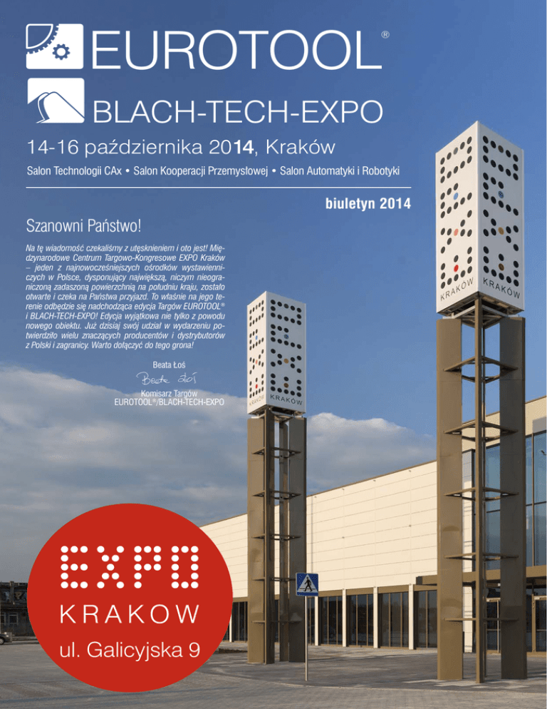 EUROTOOL ® BLACH-TECH-EXPO 14-16 października 2014, Kraków Salon Technologii CAx • Salon Kooperacji Przemysłowej • Salon Automatyki i Robotyki biuletyn 2014 Szanowni Państwo! Na tę wiadomość czekaliśmy zutęsknieniem ioto jest! Międzynarodowe Centrum Targowo-Kongresowe EXPO Kraków – jeden z najnowocześniejszych ośrodków wystawienniczych w Polsce, dysponujący największą, niczym nieograniczoną zadaszoną powierzchnią na południu kraju, zostało otwarte iczeka na Państwa przyjazd. To właśnie na jego terenie odbędzie się nadchodząca edycja Targów EUROTOOL® iBLACH-TECH-EXPO! Edycja wyjątkowa nie tylko zpowodu nowego obiektu. Już dzisiaj swój udział w wydarzeniu potwierdziło wielu znaczących producentów i dystrybutorów zPolski izagranicy. Warto dołączyć do tego grona! Beata Łoś Komisarz Targów EUROTOOL®/BLACH-TECH-EXPO ul. Galicyjska 9 Miejsce wydarzeń na światowym poziomie Międzynarodowe Centrum Targowo-Kongresowe EXPO Kraków jest jednym znajnowocześniejszych ośrodków wystawienniczych wkraju dysponującym największą zadaszoną powierzchnią wpołudniowej Polsce. Dwie przestronne hale „Wisła” i„Dunaj” umożliwiają organizację targów ikongresów, ale także koncertów, festiwali, spektakli teatralnych, musicali, wystawnych balów czy zawodów sportowych na światową skalę. To obiekt wprost stworzony do organizacji targów przemysłowych. Wygodny iniezwykle użyteczny, zpojemnym parkingiem, szerokimi bramami rozładunkowymi oraz nośnością podłogi pozwalającą na ekspozycję maszyn wielkogabarytowych. To tutaj wdniach 14-16.10.2014 r. zorganizujemy 19. edycję cenionych wbranży Międzynarodowych Targów EUROTOOL®, połączonych z6. edycją Targów BLACH-TECH-EXPO. Uroczystego otwarcia obiektu dokonano 14 maja. Goście obecni na wieczornej gali, którą uświetnił występ grupy artystycznej Art Color Balet, byli nie tylko pod wrażeniem EXPO, ale także tempa, wjakim powstało. Przygotowania do rozpoczęcia budowy trwały bowiem 4,5 roku. Sama realizacja – zaledwie 228 dni. To historyczna chwila dla naszej firmy. Nowa siedziba pozwoli nam złapać wiatr wżagle, znacznie poszerzyć ofertę ipodnieść jakość organizowanych przez nas wydarzeń. EXPO Kraków jest jednym znajnowocześniejszych ośrodków targowo-kongresowych wPolsce, achcemy by wniedługim czasie stał się najważniejszym wEuropie Środkowo-Wschodniej. Posiadamy wszystkie atuty, by odgrywać ważną rolę wtej części kontynentu – powiedziała Grażyna Grabowska, prezes Targów wKrakowie. Imponujące otwarcie EXPO Kraków. Miałem przyjemność uczestniczyć w programie artystycznym, który podobnie jak obiekt, zrobił na mnie ogromne wrażenie. To nowy rozdział dla Targów wKrakowie. Wracam do Krakowa po okresie nieobecności. Mam nadzieję, że wkrótce ta impreza powróci do roli wiodącej wkraju, tego życzę organizatorom. Piotr Pachczyński, właściciel FHU Faktor Kraków bliżej Europy WKrakowie w1887 r. odbyła się pierwsza na ziemiach polskich Powszechna Wystawa Krajowa, skupiająca ponad 800 wystawców. Do ducha dawnej Galicji nawiązują więc nazwy: większa zhal to „Wisła” (powierzchnia 5 tys. m²) amniejsza – „Dunaj” (4 tys. m²). Sale konferencyjne to zkolei: Budapeszt, Lwów, Praga iWiedeń, podkreślające doskonałą lokalizację EXPO. Odległość każdego ztych miast do Krakowa to mniej niż 500 km. EXPO Kraków jest znakomicie zlokalizowane – nie tylko na mapie Europy, ale isamego Krakowa – blisko obwodnicy miasta iautostrady A4. Złatwością dojedziemy do EXPO zcentrum miasta, Dworca Głównego PKP czy lotniska wBalicach. Widziałem ten obiekt jeszcze w trakcie budowy i już wtedy robił wrażenie, natomiast przyjemnie było zobaczyć go wpełnej krasie w dniu otwarcia EXPO Kraków. Czekaliśmy na ten obiekt wiele lat i w końcu jest. Najbardziej podoba mi się otwarta przestrzeń whalach ibrak słupów, atakże mniejsze sale konferencyjne, które dają nam możliwość spotkań biznesowych wgronie wystawców. Piotr Honc, właściciel MEXIM Najwięksi wpołudniowej Polsce To, co niewątpliwie wyróżnia obiekt, to fakt, że oferuje on największą niczym nieograniczoną powierzchnię pod dachem wpołudniowej Polsce. Wdwóch niezależnych halach ołącznej powierzchni 9 tys. m2 zamiast słupów zastosowano dźwigary zdrewna klejonego. Unikalna konstrukcja hal pozwala na niemal dowolną aranżację powierzchni do wysokości blisko 9 m. Bezrampowe bramy rozładunkowe owysokości iszerokości 5,5 m oraz wzmacniana posadzka onośności 40 kPa umożliwiają rozładunek iprezentację najbardziej wymagających eksponatów. Wewnątrz obiektu znajdziemy zespół klimatyzowanych, modułowych sal konferencyjnych, pozwalających na dowolną aranżację, pokoje spotkań, przestronne lobby oraz restaurację. Nowe Centrum wyposażone jest również wparking na 700 miejsc. Ogromną zaletą tego obiektu jest jego infrastruktura irozwiązania architektoniczne. Odpowiednia nośność podłogi, wysokość hal i wielkość bram wjazdowych pozwolą prezentować duże maszyny. Sprawniej będzie można wjechać na teren hal idokonać instalacji maszyn na stoiskach. Szymon Kuzio, prezes IGO ul. Galicyjska 9 Nowoczesny budynek, znakomity design iświetne wykończenie. Obiekt jest przyjazny i wygodny dla Wystawców. Robi znakomite wrażenie – zzewnątrz iwewnątrz. Remigiusz Mądrowski, prezes REM-TECH EXPO BUS Wraz zotwarciem nowego obiektu została uruchomiona specjalna linia autobusowa dla Wystawców iOdwiedzających. EXPO Bus to połączenie zCentrum miasta bezpośrednio do EXPO Kraków. Rozkład jazdy znajdą Państwo na stronach Targów www.eurotool.krakow.pl oraz www.blachtech.pl oraz na stronie internetowej przewoźnika www.expobus.jordan.pl. Dodatkowo informacje onajbliższej godzinie odjazdu będą wyświetlane na monitorze EXPO BUS wrecepcji głównej EXPO Kraków podczas trwania imprezy. Niedościgniona formuła współp