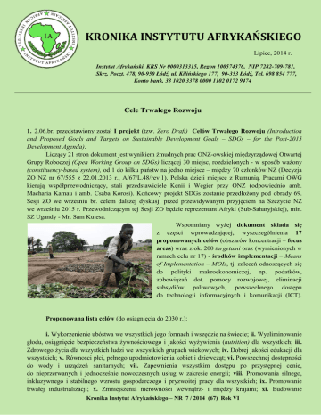 KRONIKA INSTYTUTU AFRYKAŃSKIEGO Lipiec, 2014 r. Instytut Afrykański, KRS Nr 0000313315, Regon 100574376, NIP 7282-709-781, Skrz. Poczt. 478, 90-950 Łódź, ul. Kilińskiego 177, 90-353 Łódź, Tel. 698 854 777, Konto bank. 33 1020 3378 0000 1102 0172 9474 Cele Trwałego Rozwoju 1. 2.06.br. przedstawiony został I projekt (tzw. Zero Draft) Celów Trwałego Rozwoju (Introduction and Proposed Goals and Targets on Sustainable Development Goals – SDGs – for the Post-2015 Development Agenda). Liczący 21 stron dokument jest wynikiem żmudnych prac ONZ-owskiej międzyrządowej Otwartej Grupy Roboczej (Open Working Group on SDGs) liczącej 30 miejsc, rozdzielonych - w sposób ważony (constituency-based system), od 1 do kilku państw na jedno miejsce – między 70 członków NZ (Decyzja ZO NZ nr 67/555 z 22.01.2013 r., A/67/L.48/rev.1). Polska dzieli miejsce z Rumunią. Pracami OWG kierują współprzewodniczący, stali przedstawiciele Kenii i Wegier przy ONZ (odpowiednio amb. Macharia Kamau i amb. Csaba Korosi). Końcowy projekt SDGs zostanie przedłożony pod obrady 69. Sesji ZO we wrześniu br. celem dalszej dyskusji przed przewidywanym przyjęciem na Szczycie NZ we wrześniu 2015 r. Przewodniczącym tej Sesji ZO będzie reprezentant Afryki (Sub-Saharyjskiej), min. SZ Ugandy - Mr. Sam Kutesa. Wspomniany wyżej dokument składa się z części wprowadzającej, wyszczególnienia 17 proponowanych celów (obszarów koncentracji – focus areas) wraz z ok. 200 targetami oraz (wymienionych w ramach celu nr 17) - środków implementacji – Means of Implementation – MOIs, tj. zaleceń odnoszących się do polityki makroekonomiczej, np. podatków, zobowiązań dot. pomocy rozwojowej, eliminacji subsydiów paliwowych, powszechnego dostępu do technologii informacyjnych i komunikacji (ICT). Proponowana lista celów (do osiagnięcia do 2030 r.): i. Wykorzenienie ubóstwa we wszystkich jego formach i wszędzie na świecie; ii. Wyeliminowanie głodu, osiągnięcie bezpieczeństwa żywnościowego i jakości wyżywienia (nutrition) dla wszystkich; iii. Zdrowego życia dla wszystkich ludzi we wszystkich grupach wiekowych; iv. Dobrej jakości edukacji dla wszystkich; v. Równości płci, pełnego upodmiotowienia kobiet i dziewcząt; vi. Powszechnej dostępności do wody i urządzeń sanitarnych; vii. Zapewnienia wszystkim dostępu po przystępnej cenie, do nieprzerwanych i jednocześnie nowoczesnych usług w zakresie energii; viii. Promowania silnego, inkluzywnego i stabilnego wzrostu gospodarczego i pryzwoitej pracy dla wszystkich; ix. Promowanie trwałej industrializacji; x. Zmniejszenia nierówności wewnątrz- i między krajami; xi. Budowanie Kronika Instytut Afrykańskiego – NR 7 / 2014 (67) Rok VI inkluzywnych, bezpiecznych i trwałych miast i osiedli ludzkich; xii. Propagowanie oszczędnych wzorców konsumpcji i produkcji; xiii. Promowanie działań na wszystkich szczeblach zapobiegających zmianom klimatu; xiv. Racjonalne gospodarowanie rybołówstwem, tudzież innymi zasobami mórz i ocenaów; xv. Ochrona i odbudowa ekosystemów ziemskich i powstrzymanie strat w bioróżnorodności; xvi. Osiągnięcie w sposób pokojowy spójnych społeczności, rządów prawa, efektywnych i sprawnych instytucji; xvii. Wzmocnienie i uwydatnienie środów implementacji (MOIs) i globalnego partnerstwa na rzecz trwałego rozwoju. W piśmie z 2.06.br. przedstawiającym Zero Draft, współprzewodniczący OWG podkreślili m.in., że zgodnie z Rio+20 Outcome Document „The Future We Want” z czerwca 2012 r.(para. 247), cele SDGs powinny być: zorientowane na działanie, treściwe, ograniczone liczbowo, łatwe do zrozumienia, wyrażające ludzkie aspiracje, posiadać globalny zasięg i zdolność uniwersalnego zastosowania we wszystkich krajach, z uwzględnieniem zróżnicowanych realiów narodowych, organizacyjnych, stopnia rozwoju, jak też narodowych polityk i priorytetów. Prace nad finalizacją Celów SDGs przypadają na trudny okres w stosunkach międzynarodowych i wewnętrznych wielu państw i regionów geograficznych, w tym w Afryce. Tym bardziej zasługują one, jak i zastosowana metodologia na wnikliwe przeanalizowanie i wzięcie pod uwagę we wszystkich krajach. www.devex.com/news/why-agreeing-on-new-post-2015-develeopment-goals-is-‘complicated. 23. Szczyt Unii Afrykańskiej 2. Podczas odbywającego się w Malamo (Gwinea Równikowa) 23. Szczytu Unii Afrykańskiej, 26.06.br. – w 69. rocznicę przyjęcia Karty NZ na Konferencji w San Francisco w 1945 r. – głos zabrał Sekr.Gen. NZ Ban Ki-moon. Podkreślił on poparcie ONZ dla wspólnego z UA działania na rzecz rozwiązywania i zapobiegania konfliktom, jak również zwiększenia produktywności rolnej, industrializacji i równouprawnienia kobiet, a także dla przyjętej przez UA w 2013 r. Agendy 2063 propagującej pokój, prawa człowieka i trwały rozwój. Scenariusz nadziei uległ w ciągu ubiegłego roku umocnieniu w większej części Afryki, podobnie jak stabilizacji, wzrostu gospodarczego i postępu w realizacji Milenijnych Celów Rozwoju (MDGs). A tam gdzie wystąpiły konflikty, UA i partnerzy regionalni pierwsi podjęli inicjatywy dla ich zażegnania. Wchodzące w okres rocznicy 70-lecia powstania ONZ w 1945 r. (wtedy na 51 członków założycieli, w tym Polski, jedynie 4 pochodziło z Afryki; obecnie na 193 państwa członkowskie, 54 wywodzi się z Afryki), Narody Zjednoczone są dumne z bycia kluczowym partnerem Afryki. Na marginesie Szczytu, Ban Ki-moon odbył rozmowy m.in. z przywódcami Sudanu Płd., Republiki Środkowo-Afrykańskiej, Mali i Egiptu. Przy innej okazji w Malamo, Sekr. Gen. z uznaniem wypowiedział się o utworzonym w 2013 r., a zarządzanym przez FAO, Africa Solidarity (Food Security) Trust Fund, z którego na kolejne 4 projekty dla 24 krajow afrykańskich przeznaczono właśnie $16ml, głównie na sprawy zatrudnienia młodzieży, zwalczania niedożywiania, transgranicznego przenoszenia się chorób zwierzęcych, a