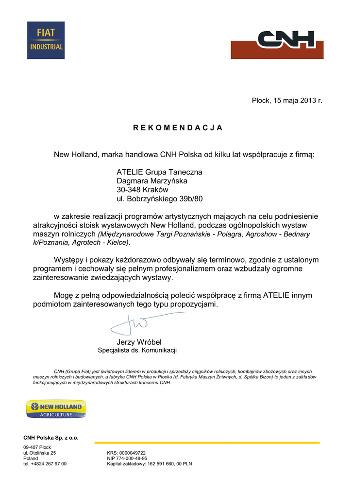 Płock, 15 maja 2013 r. REKOMENDACJA New Holland, marka handlowa CNH Polska od kilku lat współpracuje z firmą: ATELIE Grupa Taneczna Dagmara Marzyńska 30-348 Kraków ul. Bobrzyńskiego 39b/80 w zakresie realizacji programów artystycznych mających na celu podniesienie atrakcyjności stoisk wystawowych New Holland, podczas ogólnopolskich wystaw maszyn rolniczych (Międzynarodowe Targi Poznańskie - Polagra, Agroshow - Bednary k/Poznania, Agrotech - Kielce). Występy i pokazy każdorazowo odbywały się terminowo, zgodnie z ustalonym programem i cechowały się pełnym profesjonalizmem oraz wzbudzały ogromne zainteresowanie zwiedzających wystawy. Mogę z pełną odpowiedzialnością polecić współpracę z firmą ATELIE innym podmiotom zainteresowanych tego typu propozycjami. Jerzy Wróbel Specjalista ds. Komunikacji CNH (Grupa Fiat) jest światowym liderem w produkcji i sprzedaży ciągników rolniczych, kombajnów zbożowych oraz innych maszyn rolniczych i budowlanych, a fabryka CNH Polska w Płocku (d. Fabryka Maszyn Żniwnych, d. Spółka Bizon) to jeden z zakła dów funkcjonujących w międzynarodowych strukturach koncernu CNH. CNH Polska Sp. z o.o. 09-407 Płock ul. Otolińska 25 Poland tel. +4824 267 97 00 ___________________ KRS: 0000049722 NIP 774-000-48-95 Kapitał zakładowy: 162 591 660, 00 PLN