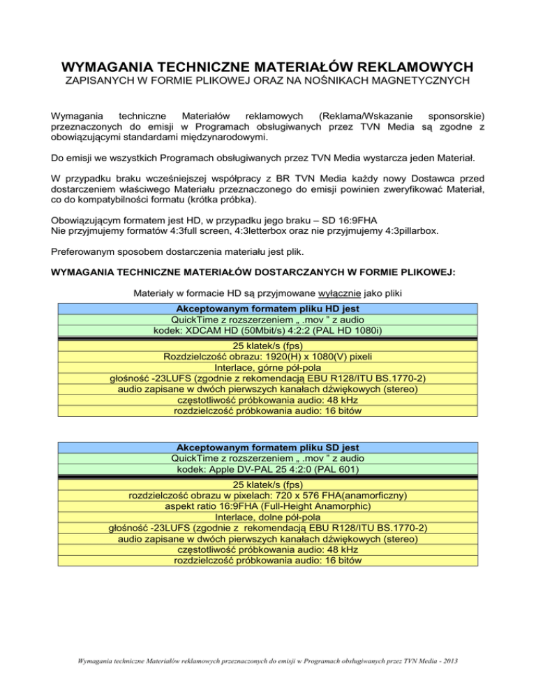 WYMAGANIA TECHNICZNE MATERIAŁÓW REKLAMOWYCH ZAPISANYCH W FORMIE PLIKOWEJ ORAZ NA NOŚNIKACH MAGNETYCZNYCH Wymagania techniczne Materiałów reklamowych (Reklama/Wskazanie sponsorskie) przeznaczonych do emisji w Programach obsługiwanych przez TVN Media są zgodne z obowiązującymi standardami międzynarodowymi. Do emisji we wszystkich Programach obsługiwanych przez TVN Media wystarcza jeden Materiał. W przypadku braku wcześniejszej współpracy z BR TVN Media każdy nowy Dostawca przed dostarczeniem właściwego Materiału przeznaczonego do emisji powinien zweryfikować Materiał, co do kompatybilności formatu (krótka próbka). Obowiązującym formatem jest HD, w przypadku jego braku – SD 16:9FHA Nie przyjmujemy formatów 4:3full screen, 4:3letterbox oraz nie przyjmujemy 4:3pillarbox. Preferowanym sposobem dostarczenia materiału jest plik. WYMAGANIA TECHNICZNE MATERIAŁÓW DOSTARCZANYCH W FORMIE PLIKOWEJ: Materiały w formacie HD są przyjmowane wyłącznie jako pliki Akceptowanym formatem pliku HD jest QuickTime z rozszerzeniem „ .mov ” z audio kodek: XDCAM HD (50Mbit/s) 4:2:2 (PAL HD 1080i) 25 klatek/s (fps) Rozdzielczość obrazu: 1920(H) x 1080(V) pixeli Interlace, górne pół-pola głośność -23LUFS (zgodnie z rekomendacją EBU R128/ITU BS.1770-2) audio zapisane w dwóch pierwszych kanałach dźwiękowych (stereo) częstotliwość próbkowania audio: 48 kHz rozdzielczość próbkowania audio: 16 bitów Akceptowanym formatem pliku SD jest QuickTime z rozszerzeniem „ .mov ” z audio kodek: Apple DV-PAL 25 4:2:0 (PAL 601) 25 klatek/s (fps) rozdzielczość obrazu w pixelach: 720 x 576 FHA(anamorficzny) aspekt ratio 16:9FHA (Full-Height Anamorphic) Interlace, dolne pół-pola głośność -23LUFS (zgodnie z rekomendacją EBU R128/ITU BS.1770-2) audio zapisane w dwóch pierwszych kanałach dźwiękowych (stereo) częstotliwość próbkowania audio: 48 kHz rozdzielczość próbkowania audio: 16 bitów Wymagania techniczne Materiałów reklamowych przeznaczonych do emisji w Programach obsługiwanych przez TVN Media - 2013 DOSTARCZENIE: W celu otrzymania danych do połączenia FTP prosimy o kontakt: [email protected] lub udostępnić nam dane do swojego serwera zawierającego materiał. FTP – prosimy utworzyć katalog Producenta lub Produktu Plik - powinien dokładnie opisywać: Produkt, Długość, Format, przypuszczalną Datę emisji. Razem z Materiałem reklamowym powinna zostać przesłana Metryczka Praw Autorskich z pieczątką i podpisem - jako plik graficzny, PDF, DOC lub faxem +48 (22) 856-64-95 bądź też oddzielnie drogą mailową. Po wgraniu Materiału na Serwer prosimy o informacyjnego maila na adres: [email protected] Istnieje możliwość skorzystania z usług dostawców zewnętrznych www.adtoox.com www.imdonline.co.uk www.mediabin.pl KASETA / PŁYTA DVD/CD (nośnik danych) dostarczone tradycyjną drogą Alternatywnym sposobem dostarczenia Materiału jest przekazanie go stacji na nośniku danych. Za dostarczenie Materiału na nośniku danych (kaseta, płyta) pobierana jest opłata w wysokości 100zł/szt (plus VAT), pokrywająca koszty stacji związane z magazynowaniem i archiwizowaniem nośników. Adres TVN Media Biuro Reklamy Traffic Ul. Wiertnicza 166 02-952 Warszawa Opakowanie musi zawierać kartę nagrania, metryczkę praw autorskich nazwę firmy i siedzibę producenta audycji nazwę oraz typ materiału (reklama/billboard) oraz format obrazu długość, początek i koniec audycji w kodzie czasowym nr telefonu do osoby odpowiadającej za materiał potwierdzenie opłaty za magazynowanie nośnika wypełnioną Kartę Dostarczenia Kasety W wypadku niezałączenia potwierdzenia opłaty za magazynowanie nośnika i/lub wypełnionej Karty Dostarczenia Kasety Materiał może być przyjęty do emisji warunkowo, po naliczeniu kary 1000zł (plus VAT). VIDEO: Sygnał wizji winien być nagrany w systemie PAL HD 1080i lub PAL SD 576i zgodnie z międzynarodowymi zaleceniami CCIR Wszystkie ważne elementy graficzne muszą być umieszczone w obszarze „Safe Area” dla systemu PAL. Nie zastosowanie się do tego może spowodować ich przycięcie na krawędziach ekranu odbiornika TV. Poziom całkowitego sygnału wideo (po odtworzeniu pliku i konwersji do postaci sygnału użytecznego na potrzeby TV) nie może w żadnym przypadku przekroczyć poziomu 107 % b/w, to jest 750 mV i wartości -25% b/w, to znaczy 175 mV ponad i poniżej impulsu wygaszania. Zakłada się, że 700 mV jest równe 100% b/w sygnału wizji. Niedopuszczalne jest zapisywanie Materiału do postaci pliku „pełnopolowo” (bez tzw. międzyliniowości) AUDIO: Poziom dźwięku powinien spełniać normy EBU R128 oraz ITU BS.1770-2 Wymagania techniczne Materiałów reklamowych przeznaczonych do emisji w Programach obsługiwanych przez TVN Media - 2013 Dla cyfrowego sygnału audio PCM stereo, głośność powinna wynosić -23LUFS (odpowiednio 0LU) dla okna pomiarowego wynoszącego 30 sekund. Jednostki pomiarowe: LUFS – loudness full scale; wymiennie LKFS – loudness K-weighting full scale LU – loudness unit, jednostki względne w stosunku po poziomu referencyjnego zgodnego z rekomendacją - EBU R128 oraz ITU BS.1770-2 Dźwięk odniesienia o częstotliwości 1 kHz musi być zapisany zgodnie z zaleceniami wytwórcy urządzenia analizującego poziom audio (np. TSL AMU1-BD) przy czym należy zachować poziom 4dB (0,775V) wskaźnika VU jako referencyjny (skuteczny poziom głośności programu). Poziom referencyjny dźwięku (1KHz) mierzony miernikiem szczytowym (PPM), powinien wynosić -18dBFs. Wartości sygnału modulacji audycji mierzone za pomocą wskaźnika VU nie powinny przekraczać zalecanego poziomu referencyjnego o więcej niż +3 dB. Dla wskaźnika szczytowego (PPM) szczyty modulacji nie powinny przekraczać zalecanego poziomu referencyjnego o więcej niż +9 dB, czyli do -9dBFs skali. UWAGA !!! Materiały zawierające zarówno muzykę jak i mowę muszą uwzględniać zrównoważony, fizjologiczn