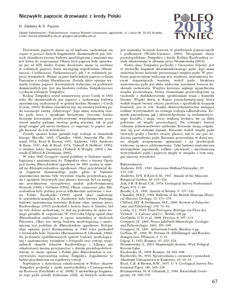 Niezwykłe paprocie drzewiaste z kredy Polski D. Zdebska & G. Pacyna Zakład Paleobotaniki i Paleoherbarium, Instytut Botaniki Uniwersytet Jagielloński, ul. Lubicz 46, 31-512 Kraków; e-mail: [email protected], [email protected] Drzewiaste paprocie znane są od karbonu, zachowując się często w postaci dużych fragmentów skamieniałych pni, których charakterystyczna budowa morfologiczna i anatomiczna jest łatwa do rozpoznania. Okazy tych paproci były opisywane już od XIX wieku. Formy drzewiaste znane są zarówno w rodzinach paproci, które występują współcześnie (Marattiaceae, Cyatheaceae, Dicksoniaceae), jak i w rodzinach paproci wymarłych. Słynne są pnie karbońskich paproci rodzaju Psaronius z rodziny Marattiaceae. Została także opisana wymarła rodzina paproci drzewiastych wyłącznie na podstawie skamieniałych pni. Jest nią kredowa rodzina Tempskyaceace z jednym rodzajem Tempskya. Rodzaj Tempskya został ustanowiony przez Cordę w 1845 roku dla skamieniałych pni paproci z zachowaną budową anatomiczną znalezionych w górnej kredzie Niemiec i Czech (Corda, 1845). Roślina charakteryzuje się swoistą budową pędu noszącego nazwę „fałszywego”. Jego masę stanowią cienkie pędy wraz z ogonkami liściowymi, otoczone bardzo licznymi korzeniami przybyszowymi wypełniającymi przestrzeń między pędami, tworząc grubą warstwę, tak że pęd mógł osiągać pół metra średnicy, co sugeruje, że paproć mogła dorastać do 6 m wysokości. Zostały opisane liczne gatunki tego rodzaju ze stanowisk Europy (Boodle, 1895; Chandler, 1968), Ameryki Płn. (Seward, 1924; Read & Brown, 1937; Andrews, 1943; Andrews & Kern, 1947; Ash & Read, 1976; Tidwell & Hebbert, 1992), a ostatnio także Argentyny (Tidwell & Wright; 2003) i Australii (Clifford & Dettmann, 2005). W roku 1865 Goeppert opisał podobny w budowie morfologicznej i anatomicznej do Tempskya okaz z turonu Opola pod nazwą Rhizodendron oppoliense (w 1881 nazwę tę zmienił na Rhizopterodendron oppoliense). Okaz przedstawiał duży fragment skamieniałego pędu, gdzie w budowie anatomicznej można było wyróżnić wiązkę przewodzącą pędu i ogonków liściowych oraz płaszcz korzeni, był on następnie przedmiotem szczegółowej analizy paleobotanicznej Stenzela (1886) i Gothana (1904). Okazy oznaczone jako Rhizodendron były później jeszcze kilkakrotnie notowane z terenu Polski. Raciborski (1909) opisał okaz znaleziony w senońskich marglach w Zaszkowie koło Lwowa ilustrując budowę anatomiczną korzenia. Kolejny okaz opisany przez Raciborskiego (1915) pochodził z koryta Sanu w Sanoku, był na tyle dobrze zachowany, ze stał się podstawą do opisu nowego gatunku R. carpaticum. W 1922 roku Lilpop opisał okaz Rhizodendron znaleziony w opoce senońskiej w okolicach Pińczowa. Okaz ten swoją budową morfologiczną i anatomiczną jest podobny do Rhizodendron oppoliense. Kolejny okaz opisany przez Reymanówną w 1966 roku pochodził z Szynwałdu koło Tarnowa (Reymanówna & Urbaniak, 1966). Na podstawie opublikowanych opisów budowy morfologicznej i anatomicznej, rysunków i fotografii oraz rewizji oryginalnych okazów (okazów Raciborskiego i Lilpopa nie odnaleziono) można przypuszczać z dużym prawdopodobieństwem, że okazy opisane z Polski jako Rhizodendron w rzeczywistości reprezentują rodzaj Tempskya. Zagadnienie to będzie przedmiotem szczegółowej rewizji. Największy z dotychczas odnalezionych w Polsce okazów Tempskya pochodzi z opoki mastrychtckiej z Czarnegostoku na Roztoczu (Gierliński et al., 2008). Z niewielkiego fragmentu tego pędu zostały wykonane szlify, na których widoczna jest anatomia licznych korzeni, w przekrojach poprzecznych i podłużnych (Wcisło-Luraniec, 2001). Nieopisane okazy prawdopodobnie Tempskya z kredy Kotliny Raciborskiej zostały zilustrowane w albumie przez Niemirowską (2013). Nowy okaz Tempskya pochodzi z Groszowic (Opole), jest to niewielki fragment skrzemionkowanego pędu. Jego masę stanowią liczne korzenie przerastające miękisz pędu. W przekroju poprzecznym widoczna jest struktura anatomiczna korzeni stanowiących warstwę wokół pędu. Struktura anatomiczna pędu jest słabo widoczna, natomiast korzeni doskonale zachowana. Wnętrze korzenia zajmuje egzarchiczna wiązka przewodząca, której elementami przewodzącymi są tracheidy z drabinkowatymi zgrubieniami ścian i komórki floemu. Wiązki tkwią w tkance parenchymatycznej, która wokół wiązek tworzy zwarty pierścień o zgrubiałych ścianach komórek, jest to tzw. tkanka sklerenchymatyczna nadająca roślinie wytrzymałość na różnego rodzaju odkształcenia. Komórki parenchymy jak i sklerenchychymy są izodiametrycznego kształtu i mają coraz większą średnicę im są dalej położone od wiązki przewodzącej. Na zewnątrz korzeń ochrania jednowarstwowa epiderma. Korzenie mogą rozgałęziać się pod różnymi kątami. Korzenie wokół wiązki pędu tworzyły gruby i bardzo zwarty płaszcz, tak że nie jest widoczna parenchyma pędu. Korzenie przyrastając w dużej masie ulegały wzajemnemu zgniataniu i na przekrojach widoczne są nieco zdeformowane. Taka budowa anatomiczna niewątpliwie zapewniała roślinie sztywność i mechaniczną wytrzymałość pędu i paprocie mogły w związku z tym osiągać znaczne wysokości. Bibliografia: Andrews, H.N., 1943. American Midland Naturalist, 29: 133–136. Andrews, H.N. & Kern E.M., 1947. Annals of the Missouri Botanical Garden, 34: 119–156. Ash, S.R. & Read, C.B., 1976. Geological Survey Professional Paper, 874: 1–40. Boodle, L.A., 1895. Annals of Botany, 9: 137–141. Chandler, M.E.J., 1968. Bulletin of the British Museum (Natural History) Geology, 15: 171–179. Clifford, H.T. & Dettmann, M.E., 2005. Review of Palaeobotany and Palynology, 134: 71–84. Corda, A.J., 1845. Flora Protogaea. Beiträge zur Flora der Vorwelt. S. Calvary and Co., Berlin, 128 pp. Gierliński, G.D. et al., 2008. Oryctos, 8: 107–113. Goeppert, H.,
