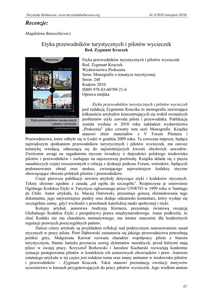 Turystyka Kulturowa, www.turystykakulturowa.org Nr 8/2010 (sierpień 2010) Recenzje: Magdalena Banaszkiewicz Etyka przewodników turystycznych i pilotów wycieczek Red. Zygmunt Kruczek Etyka przewodników turystycznych i pilotów wycieczek Red. Zygmunt Kruczek Wydawnictwo Proksenia Seria: Monografie o tematyce turystycznej Stron: 248 Kraków 2010 ISBN 978-83-60789-21-6 Oprawa miękka Etyka przewodników turystycznych i pilotów wycieczek pod redakcją Zygmunta Kruczka to monografia zawierająca kilkanaście artykułów koncentrujących się wokół rozmaitych problemów etyki zawodu pilota i przewodnika. Publikacja została wydana w 2010 roku nakładem wydawnictwa „Proksenia” jako czwarty tom serii Monografie. Książka stanowi zbiór materiałów z V Forum Pilotażu i Przewodnictwa, które odbyło się w Łodzi w grudniu 2009 roku. Ta coroczna impreza, będąca największym spotkaniem przewodników turystycznych i pilotów wycieczek, ma zawsze tematykę wiodącą, odnoszącą się do najistotniejszych kwestii obydwóch zawodów. Zwrócenie uwagi na zagadnienia etyczne świadczy o dojrzałości polskiego środowiska pilotów i przewodników i zasługuje na najszczerszą pochwałę. Książka składa się z pięciu zasadniczych części rozszerzonych o relację z dyskusji podczas Forum, wniosków, będących podsumowanie obrad oraz aneksu, zwierającego najważniejsze kodeksy etyczne obowiązujące obecnie polskich pilotów i przewodników. Część pierwsza publikacji zawiera artykuły dotyczące etyki i kodeksów etycznych. Teksty ułożono zgodnie z zasadą „od ogółu do szczegółu”. Rozpoczyna je omówienie Ogólnego Kodeksu Etyki w Turystyce ogłoszonego przez UNWTO w 1999 roku w Santiago de Chile. Autor artykułu, ks. Maciej Ostrowski, prezentuje genezę sformułowania tego dokumentu, jego najważniejsze punkty oraz dodaje odautorski komentarz, który wydaje się szczególnie cenny, gdyż wychodzi z przesłanek katolickiej nauki społecznej i etyki. Kolejny artykuł, autorstwa Andrzeja Kremera, prezentuje światową recepcję Globalnego Kodeksu Etyki z perspektywy prawa międzynarodowego. Autor podkreśla, że choć Kodeks nie ma charakteru normatywnego, ma istotne znaczenie dla konkretnych regulacji prawnych poszczególnych państw. Dalsze cztery artykuły są przykładem refleksji nad praktycznym zastosowaniem zasad etycznych w pracy pilota. Piotr Dąbrowski zastanawia się jakiego przewodnictwa potrzebują polskie góry, Małgorzata Karwat rozważa charakter współpracy pilota z biurem turystycznym, Hanna Janicka przytacza szereg dylematów moralnych, przed którymi stają piloci w swojej pracy. Krzysztof Borkowski i Jarosław Kucharski rozważają konkretne sytuacje postępowania pilotów w kontekście ich ustawowych obowiązków i praw. Autorem ostatniego artykułu w tej części jest redaktor tomu oraz znany animator w środowisku pilotów i przewodników – Zygmunt Kruczek. Tekst stanowi prezentację ewolucji motywów uczestnictwa w kursach przygotowujących do pracy pilotów wycieczek. Jego wielkim atutem 42 Turystyka Kulturowa, www.turystykakulturowa.org Nr 8/2010 (sierpień 2010) jest osadzenie w realiach szkoleń i stworzenie profilu pilota, będącego odzwierciedleniem kilkuletnich badań w środowisku kursantów. Druga część monografii dotyczy kształcenia, egzaminowania i doskonalenia przewodników i pilotów wycieczek. Znakomite studium rozwoju form i programów kształcenia przewodników i pilotów przygotowane przez Andrzeja Stasiaka i Roberta Wilusia to przykłada rzetelnej analizy, mogącej być punktem wyjścia do propozycji zmiany o charakterze systemowym. Nieco zbliżony charakter ma artykuł Piotra Szymanowskiego poświęcony ustawie o usługach turystycznych i rozporządzeniach wykonawczych odnoszących się do niej. Autor nie tylko poddaje krytyce niektóre zapisy, lecz proponuje konkretne zmiany mogące przyczynić się do poprawy jakości aktywności zawodowej pilotów i przewodników. Drugą część książki zamyka artykuł Anny Boguckiej poświęcony ścieżkom rozwoju zawodowego przewodników w województwie podlaskim. Na wzmiankę zasługuje fakt oparcia analizy na badaniach sondażowych przeprowadzonych w 2008 roku. Na trzecią część publikacji składają się artykuły prezentujące walory i produkty turystyczne Łodzi, Ziemi Łódzkiej i Świętokrzyskiej. Duża ilość ilustracji bardzo wzbogaca percepcję tej części monografii i pozwala dostrzec potencjał turystyczny regionu, w którym odbywało się V Forum Pilotażu i Przewodnictwa. Czwarta część książki to zapis wypowiedzi ekspertów turystyki kulturowej: Izabeli Wyszowskiej, Janusza Hochleitnera, Armina Mikosa von Rohrscheidta, Agnieszki Matusiak, Kazimiery Orzechowskiej-Kowalskiej i Zygmunta Kruczka. Odpowiedzieli oni na pytanie: „Jakie nowe umiejętności i nowy zakres wiedzy jest niezbędny dla przewodnika lub pilota obsługującego turystów kulturowych, w jakim kierunku powinna iść ewolucja programów kształcenia i form przygotowania zawodu przewodnika turystycznego i pilota wycieczek?” Komentarze specjalistów, na co dzień zajmujących się turystyką kulturową, zarówno od strony teoretycznej, jak i praktycznej to bogaty i inspirujący materiał, który stanowić może znakomitą podstawę do kreowania nowych form szkoleń doskonalenia zawodowego. Na ostatni tematyczny zbiór artykułów, będący piątą częścią monografii składają się dwie relacje z pracy pilota, rezydenta i animatora. Autorka pierwszego tekstu, Patrycja Litwicka opisuje swoje doświadczenia zawodowe z pobytu na Krecie. Agnieszka Gaj dzieli się doświadczeniami przewodnika polskich grup w Turcji. Teksty obydwóch pań, choć nie są typowymi artykułami naukowymi, wnoszą świeży powiew do całego zbioru, dodając wątki nierzadko tragikomiczne, a przecież tak charakterystyczne w tej pracy zawodowej. Do największych zalet publikacji należy proporcjonalne połączenie roz