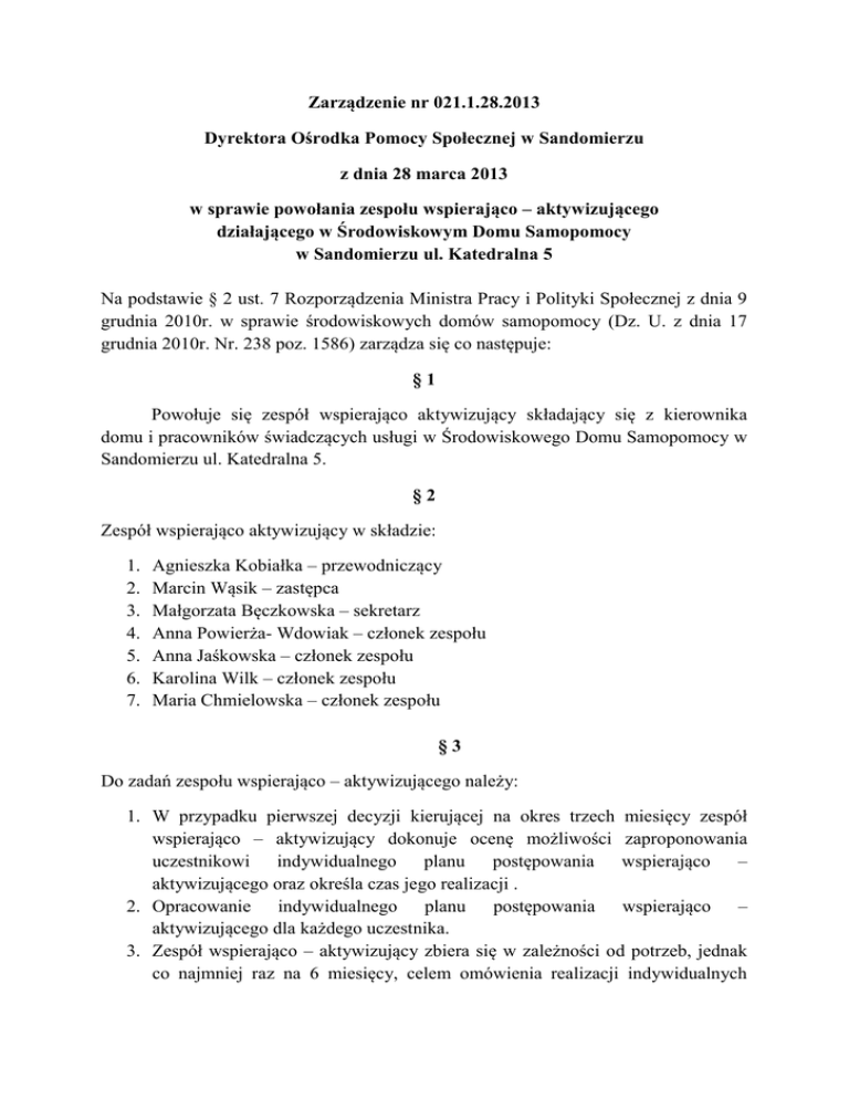 Zarządzenie nr 021.1.28.2013 Dyrektora Ośrodka Pomocy Społecznej w Sandomierzu z dnia 28 marca 2013 w sprawie powołania zespołu wspierająco – aktywizującego działającego w Środowiskowym Domu Samopomocy w Sandomierzu ul. Katedralna 5 Na podstawie § 2 ust. 7 Rozporządzenia Ministra Pracy i Polityki Społecznej z dnia 9 grudnia 2010r. w sprawie środowiskowych domów samopomocy (Dz. U. z dnia 17 grudnia 2010r. Nr. 238 poz. 1586) zarządza się co następuje: §1 Powołuje się zespół wspierająco aktywizujący składający się z kierownika domu i pracowników świadczących usługi w Środowiskowego Domu Samopomocy w Sandomierzu ul. Katedralna 5. §2 Zespół wspierająco aktywizujący w składzie: 1. 2. 3. 4. 5. 6. 7. Agnieszka Kobiałka – przewodniczący Marcin Wąsik – zastępca Małgorzata Bęczkowska – sekretarz Anna Powierża- Wdowiak – członek zespołu Anna Jaśkowska – członek zespołu Karolina Wilk – członek zespołu Maria Chmielowska – członek zespołu §3 Do zadań zespołu wspierająco – aktywizującego należy: 1. W przypadku pierwszej decyzji kierującej na okres trzech miesięcy zespół wspierająco – aktywizujący dokonuje ocenę możliwości zaproponowania uczestnikowi indywidualnego planu postępowania wspierająco – aktywizującego oraz określa czas jego realizacji . 2. Opracowanie indywidualnego planu postępowania wspierająco – aktywizującego dla każdego uczestnika. 3. Zespół wspierająco – aktywizujący zbiera się w zależności od potrzeb, jednak co najmniej raz na 6 miesięcy, celem omówienia realizacji indywidualnych 4. 5. 6. 7. planów postępowania wspierająco – aktywizującego i osiągniętych rezultatów, a także ewentualnej możliwości ich modyfikacji. W przypadku osiągnięcia przez uczestnika poziomu samodzielności umożliwiającego uczestnictwo w innych formach wsparcia, zespół wspierająco – aktywizujący wnioskuje do jednostki prowadzącej lub jednostki zlecającej o umożliwienie uczestnikowi korzystania z innych form wsparcia w celu kontynuacji procesu usamodzielnienia, w szczególności poprzez odpowiednie formy rehabilitacji zawodowej lub zatrudnienia. Ze spotkań zespołu wspierająco – aktywizującego sporządzany jest protokół podpisany przez wszystkich członków zespołu. Członkowie zespołu wspierająco – aktywizującego dokumentują swoją codzienną pracę w dziennikach pracy własnej. Członkowie zespołu wspierająco – aktywizującego uprawnieni do opracowywania indywidualnych planów postępowania wspierająco – aktywizującego mają wgląd do dokumentacji domu. §4 Wykonanie zarządzenie powierza się kierownikowi ŚDS. §5 Zarządzenie wchodzi w życie z dniem podpisania.