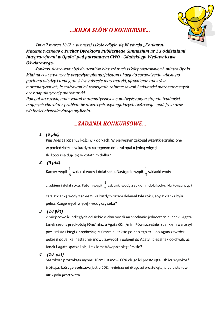 …KILKA SŁÓW O KONKURSIE… Dnia 7 marca 2012 r. w naszej szkole odbyła się XI edycja „Konkursu Matematycznego o Puchar Dyrektora Publicznego Gimnazjum nr 1 z Oddziałami Integracyjnymi w Opolu” pod patronatem GWO - Gdańskiego Wydawnictwa Oświatowego. Konkurs skierowany był do uczniów klas szóstych szkół podstawowych miasta Opola. Miał na celu stworzenie przyszłym gimnazjalistom okazji do sprawdzenia własnego poziomu wiedzy i umiejętności w zakresie matematyki, ujawnienie talentów matematycznych, kształtowanie i rozwijanie zainteresowań i zdolności matematycznych oraz popularyzację matematyki. Polegał na rozwiązaniu zadań matematycznych o podwyższonym stopniu trudności, mających charakter problemów otwartych, wymagających twórczego podejścia oraz zdolności abstrakcyjnego myślenia. …ZADANIA KONKURSOWE… 1. (5 pkt) Pies Ares zakopał 63 kości w 7 dołkach. W pierwszym zakopał wszystkie znalezione w poniedziałek a w każdym następnym dniu zakopał o jedną więcej. Ile kości znajduje się w ostatnim dołku? 2. (5 pkt) Kacper wypił 1 1 szklanki wody i dolał soku. Następnie wypił szklanki wody 6 3 z sokiem i dolał soku. Potem wypił 1 szklanki wody z sokiem i dolał soku. Na końcu wypił 2 całą szklankę wody z sokiem. Za każdym razem dolewał tyle soku, aby szklanka była pełna. Czego wypił więcej - wody czy soku? 3. (10 pkt) Z miejscowości odległych od siebie o 2km wyszli na spotkanie jednocześnie Janek i Agata. Janek szedł z prędkością 90m/min., a Agata 60m/min. Równocześnie z Jankiem wyruszył pies Reksio i biegł z prędkością 300m/min. Reksio po dobiegnięciu do Agaty zawrócił i pobiegł do Janka, następnie znowu zawrócił i pobiegł do Agaty i biegał tak do chwili, aż Janek i Agata spotkali się. Ile kilometrów przebiegł Reksio? 4. (10 pkt) Szerokość prostokąta wynosi 18cm i stanowi 60% długości prostokąta. Oblicz wysokość trójkąta, którego podstawa jest o 20% mniejsza od długości prostokąta, a pole stanowi 40% pola prostokąta. …WYNIKI XI EDYCJI KONKURSU… Nazwa szkoły Suma zdobytych punktów drużyny Zajęte miejsce w konkursie PSP 15 PKSP SPSK PSP 11 PSP 5 PSP 20 PSP 14 PSP 21 PSP 29 54p 49p 38p 30p 27p 24p 19p 8p I II III IV V VI VII VII Każda 2-osobowa drużyna mogła zdobyć maksymalnie 60 punktów (2 x 30p). Zwyciężyła drużyna z PSP15. Wśród wszystkich uczestników konkursu na szczególne gratulacje zasługuje Michał Passon – uczeń PKSP SPSK który indywidualnie zdobył maksymalną ilość punktów (30p). Gratulujemy najlepszym i wszystkim uczestnikom konkursu. …KILKA SŁÓW O NAGRODACH… Puchar Dyrektora Publicznego Gimnazjum nr 1 z Oddziałami Integracyjnymi w Opolu otrzyma zwycięska drużyna z PSP 15. Nagrody rzeczowe – ufundowane przez Wydawnictwo NOWIK, GWO, ING BANK ŚLĄSKI – otrzymają członkowie zwycięskiej drużyny : Łysiak Agnieszka i Metelska Marta oraz uczestnik konkursu , który uzyskał maksymalną ilość punktów: Michał Passon. Uroczyste rozdanie nagród odbędzie się dnia 27 marca 2012r. podczas V edycji Dni Nauki i Kultury w Publicznym Gimnazjum nr 1 z O.I. w Opolu – zwycięzcy zostaną zaproszeni na uroczyste rozdanie nagród odrębnym pismem. …PODZIEKOWANIA… Składamy serdeczne podziękowania Dla wszystkich uczestników konkursu oraz nauczycieli przygotowujących uczniów do konkursu Dla Wydawnictwa Nowik - www.nowik.com.pl, dla GWO i dla Banku Śląskiego oraz Rady Rodziców za ufundowanie nagród rzeczowych dla zwycięzców Dla uczniów 1D – klasy matematyczno – informatycznej naszej szkoły – Weroniki Kukli, Magdaleny Kędziory, Wojciecha Boguckiego, Jarosława Kmieć, Marcina Chrabąszcza, Tadeusza Olechnowicza za ogromną pomoc w organizacji konkursu. Komisja konkursowa: Kulpińska Honorata – przewodnicząca Anna Matyaszczuk