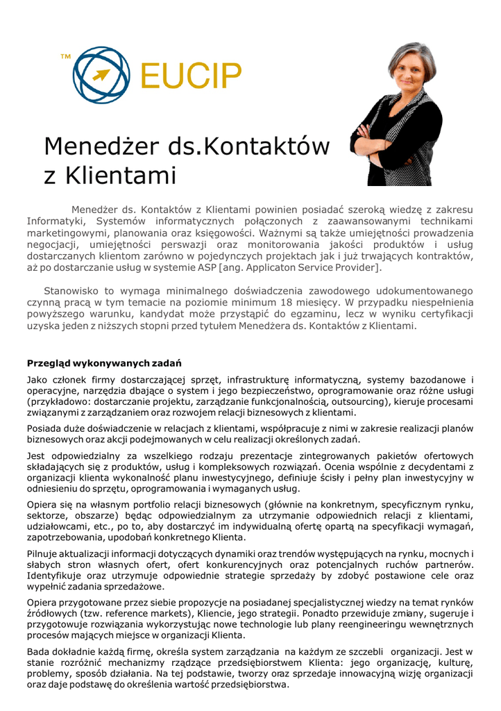 Mened¿er ds.Kontaktów z Klientami Mened¿er ds. Kontaktów z Klientami powinien posiadaæ szerok¹ wiedzê z zakresu Informatyki, Systemów informatycznych po³¹czonych z zaawansowanymi technikami marketingowymi, planowania oraz ksiêgowoœci. Wa¿nymi s¹ tak¿e umiejêtnoœci prowadzenia negocjacji, umiejêtnoœci perswazji oraz monitorowania jakoœci produktów i us³ug dostarczanych klientom zarówno w pojedynczych projektach jak i ju¿ trwaj¹cych kontraktów, a¿ po dostarczanie us³ug w systemie ASP [ang. Applicaton Service Provider]. Stanowisko to wymaga minimalnego doœwiadczenia zawodowego udokumentowanego czynn¹ prac¹ w tym temacie na poziomie minimum 18 miesiêcy. W przypadku niespe³nienia powy¿szego warunku, kandydat mo¿e przyst¹piæ do egzaminu, lecz w wyniku certyfikacji uzyska jeden z ni¿szych stopni przed tytu³em Mened¿era ds. Kontaktów z Klientami. Przegl¹d wykonywanych zadañ Jako cz³onek firmy dostarczaj¹cej sprzêt, infrastrukturê informatyczn¹, systemy bazodanowe i operacyjne, narzêdzia dbaj¹ce o system i jego bezpieczeñstwo, oprogramowanie oraz ró¿ne us³ugi (przyk³adowo: dostarczanie projektu, zarz¹dzanie funkcjonalnoœci¹, outsourcing), kieruje procesami zwi¹zanymi z zarz¹dzaniem oraz rozwojem relacji biznesowych z klientami. Posiada du¿e doœwiadczenie w relacjach z klientami, wspó³pracuje z nimi w zakresie realizacji planów biznesowych oraz akcji podejmowanych w celu realizacji okreœlonych zadañ. Jest odpowiedzialny za wszelkiego rodzaju prezentacje zintegrowanych pakietów ofertowych sk³adaj¹cych siê z produktów, us³ug i kompleksowych rozwi¹zañ. Ocenia wspólnie z decydentami z organizacji klienta wykonalnoœæ planu inwestycyjnego, definiuje œcis³y i pe³ny plan inwestycyjny w odniesieniu do sprzêtu, oprogramowania i wymaganych us³ug. Opiera siê na w³asnym portfolio relacji biznesowych (g³ównie na konkretnym, specyficznym rynku, sektorze, obszarze) bêd¹c odpowiedzialnym za utrzymanie odpowiednich relacji z klientami, udzia³owcami, etc., po to, aby dostarczyæ im indywidualn¹ ofertê opart¹ na specyfikacji wymagañ, zapotrzebowania, upodobañ konkretnego Klienta. Pilnuje aktualizacji informacji dotycz¹cych dynamiki oraz trendów wystêpuj¹cych na rynku, mocnych i s³abych stron w³asnych ofert, ofert konkurencyjnych oraz potencjalnych ruchów partnerów. Identyfikuje oraz utrzymuje odpowiednie strategie sprzeda¿y by zdobyæ postawione cele oraz wype³niæ zadania sprzeda¿owe. Opiera przygotowane przez siebie propozycje na posiadanej specjalistycznej wiedzy na temat rynków Ÿród³owych (tzw. reference markets), Kliencie, jego strategii. Ponadto przewiduje zmiany, sugeruje i przygotowuje rozwi¹zania wykorzystuj¹c nowe technologie lub plany reengineeringu wewnêtrznych procesów maj¹cych miejsce w organizacji Klienta. Bada dok³adnie ka¿d¹ firmê, okreœla system zarz¹dzania na ka¿dym ze szczebli organizacji. Jest w stanie rozró¿niæ mechanizmy rz¹dz¹ce przedsiêbiorstwem Klienta: jego organizacjê, kulturê, problemy, sposób dzia³ania. Na tej podstawie, tworzy oraz sprzedaje innowacyjn¹ wizjê organizacji oraz daje podstawê do okreœlenia wartoœæ przedsiêbiorstwa. Wykorzystuje pe³en potencja³ zarówno w³asnej organizacji jak i organizacji partnerów, aby jej w³adze pojê³y ³atwo istotê krótko i d³ugookresowego prowadzenia dzia³alnoœci gospodarczej, w tym tak¿e finansow¹ wartoœæ wynikaj¹c¹ ze stosunków z dostawc¹. Identyfikuje mo¿liwoœci wynikaj¹ce z nowych projektów, konserwuje ju¿ istniej¹ce systemy, zarz¹dza aplikacjami dzia³aj¹cych systemów. Pracuje pod kierownictwem mened¿erów posiadaj¹cych specjalistyczne kompetencje zwi¹zane z rozwi¹zaniami aplikacyjnymi, architektur¹ systemów informacyjnych, systemami sieciowymi, utrzymaniem, konserwacja centrów informacyjnych, etc. Anga¿uje zasoby sprzeda¿owe i partnerów, tworzy i rozwija grupy, które dostarczaj¹ dla Klienta wartoœciowe ekspertyzy w odpowiednim czasie. Posiada szerok¹ wiedzê z zakresu ofert proponowanych przez konkurencjê, ich strategii i planów, skutecznie rozró¿nia oferty konkurentów, by stworzyæ ofertê opart¹ na preferencjach klienta dla w³asnej organizacji. Pracuje z innymi konsultantami ze sfery informatycznej i biznesowej. Rozumie znaczenie wykorzystywania Informatyki w kwestiach strategii biznesowych, ma opanowan¹ wiedzê z zakresu planowania, kontroli zarz¹dzania. Definiuje wp³yw zmian regulacyjnych w zakresie prawa, w³asnoœci, bezpieczeñstwa na systemy informacyjne. Promuje zmiany w dzia³aniach podejmowanych przez zarz¹d organizacji Klienta by zapewniæ efektywnoœæ projektów systemów informacyjnych. Wykorzystuje techniki planowania, bud¿etowania oraz kontroli, u¿ywa zaawansowanych technik sprzeda¿y, zaanga¿owania, praktyk negocjacyjnych. Wskazuje na relacje miêdzy oferowanymi technologiami oraz potrzebami biznesowymi klienta, proponuje wiarygodne rozwi¹zania oraz sposoby dochodzenia do nich. Kluczowe umiejêtnoœci behawioralne Rola jak¹ pe³ni Mened¿er ds. Kontaktów z Klientami wymaga od niego bycia inicjatorem wiêkszoœci czynnoœci, osob¹ dyspozycyjn¹, posiadaj¹c¹ wyj¹tkowe zdolnoœci w porozumiewaniu siê (zarówno w mowie jak i w piœmie) z Klientami, wspó³pracownikami, u¿ytkownikami, mened¿erami. Umiejêtnoœci te powinny byæ równie¿ wzbogacone o wra¿liwoœæ organizacyjn¹ (z ang. organisation sensitivity), przewodzenie w zbieraniu informacji oraz umiejêtnoœci planowania, organizowania, podejmowania decyzji i nakreœlania innym celów, do których nale¿y d¹¿yæ. Kolejn¹ wa¿n¹ grupa umiejêtnoœci, któr¹ kandydat na to stanowisko powinien posiadaæ, s¹ umiejêtnoœci zwi¹zane z pozyskiwaniem zaufania przysz³ych klientów, partnerów, wspó³pracowników, definiowania priorytetów, wp³ywania na ich decyzje oraz negocjacji, szczególnie w stresuj¹cych warunkach. Wytrwa³oœæ w d¹¿eniu do celów w dalszej persp