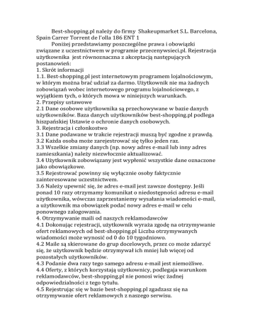 Best-shopping.plnależydofirmyShakeupmarketS.L.Barcelona, SpainCarrerTorrentdel’olla186ENT1 Poniżejprzedstawiamyposzczególneprawaiobowiązki związanezuczestnictwemwprogramieprzecenywsieci.pl.Rejestracja użytkownikajestrównoznacznazakceptacjąnastępujących postanowień: 1.Skrótinformacji 1.1.Best-shopping.pljestinternetowymprogramemlojalnościowym, wktórymmożnabraćudziałzadarmo.Użytkownikniemażadnych zobowiązańwobecinternetowegoprogramulojalnościowego,z wyjątkiemtych,októrychmowawniniejszychwarunkach. 2.Przepisyustawowe 2.1Daneosoboweużytkownikasąprzechowywanewbaziedanych użytkowników.Bazadanychużytkownikówbest-shopping.plpodlega hiszpańskiejUstawieoochroniedanychosobowych. 3.Rejestracjaiczłonkostwo 3.1Danepodawanewtrakcierejestracjimusząbyćzgodnezprawdą. 3.2Każdaosobamożezarejestrowaćsiętylkojedenraz. 3.3Wszelkiezmianydanych(np.nowyadrese-maillubinnyadres zamieszkania)należyniezwłocznieaktualizować. 3.4Użytkownikzobowiązanyjestwypłenićwszystkiedaneoznaczone jakoobowiązkowe. 3.5Rejestrowaćpowinnysięwyłącznieosobyfaktycznie zainteresowaneuczestnictwem. 3.6Należyupewnićsię,żeadrese-mailjestzawszedostępny.Jeśli ponad10razyotrzymamykomunikatoniedostępnościadresue-mail użytkownika,wówczaszaprzestaniemywysałaniawiadomoście-mail, aużytkownikmaobowiązekpodaćnowyadrese-mailwcelu ponownegozalogowania. 4.Otrzymywaniemailiodnaszychreklamodawców 4.1Dokonującrejestracji,użytkownikwyrażazgodęnaotrzymywanie ofertreklamowychodbest-shopping.plLiczbaotrzymywanych wiadomościmożewynosićod0do10tygodniowo. 4.2Mailesąskierowanedogrupdocelowych,przezcomożezdarzyć się,żeużytkownikbędzieotrzymywałichmniejlubwięcejod pozostałychużytkowników. 4.3Podaniedwarazytegosamegoadresue-mailjestniemożliwe. 4.4Oferty,zktórychkorzystająużytkownicy,podlegajawarunkom reklamodawców,best-shopping.plnieponosiwięcżadnej odpowiedzialnościztegotytułu. 4.5Rejestrującsięwbaziebest-shopping.plzgadzaszsięna otrzymywanieofertreklamowychznaszegoserwisu. 5.Zakończenieuczestnictwa 5.1Użytkownikmożewdowolnymmomenciezrezygnowaćzudziału wprogramiebest-shopping.plOdnośnikdorezygnacjizudziału znajdujesięnadolekażdegowysłanegoe-maila. 5.2WprzypadkuwyrejestrowaniawszystkiedanezbazyBestshopping.plzostająusunięte(zodniezprzepisamidotyczącymi ochronydanychosobowychmamyobowiązekusuwaćwszystkiedane osobowe). 5.3Usuniętekontomożeszprzywrócićrejestrującsięponowniew naszymserwisię. 6.Informacjeogólne 6.1Best-shopping.plmaprawowdowolnymmomenciewprowadzać zmianywtreścininiejszychwarunkówogólnych,oczymwmiarę możliwościpowiadomiużytkowników.Aktualnawersjewarunków ogólnychmożnaznaleźćnaportalubest-shopping.plPowprowadzeniu zmianwtreścininiejszychwarunkówogólnychpoprzedniewarunki przestająobowiązywać.Ewentualnesporyrozstrzyganebędą wyłącznieprzedwłaściwymsademwHiszpanii.Wzakresię internetowegoprogramulojalnościowegoininiejszychwarunków ogólnychobowiązujeprawohiszpańskie. 6.2Best-shopping.plmożewkażdejchwiliwprowadzaćzmiany dotyczącetegointernetowegoprogramulojalnościowego. 6.3Jeśliużytkowniknieakceptujeewentualnychzmianwarunków ogólnych,powinienonsamodzielniewyrejestrowaćsię.Pozostanie użytkownikiemoznaczaautomatycznąakceptacjęewentualnychzmian warunków. 7.Informacjekońcowe 7.1Best-shopping.plniewysyławiadomościniepożądanych,które możesztraktowaćjakospam.Posiadamywewnętrznąpolitykę antyspamowąorazdobrepraktykitak,abykażdyużytkownikmógł otrzymywaćnajciekawszeofertyżeświataonline. 7.2Umieszczanieniepożądanychwiadomościlubwysałanie wiadomościbezwymaganejzgodyodbiorcytraktowanejestjako SPAM.
