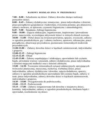 RAMOWY ROZKŁAD DNIA W PRZEDSZKOLU 7.00 – 8.00 – Schodzenie się dzieci. Zabawy dowolne służące realizacji pomysłów dzieci. 8.00 – 8.45 – Zabawy dydaktyczne, tematyczne, praca indywidualna z dziećmi, prace porządkowo-gospodarcze i hodowlane, ćwiczenia poranne, gry planszowe, zabawy ruchowe, ze śpiewem, czynności higieniczne i samoobsługowe. 8.45 – 9.00 – Śniadanie. Zabiegi higieniczne. 9.00 – 10.00 – Zajęcia edukacyjne, organizowane, inspirowane i prowadzone przez nauczyciela, wyzwalające aktywność dzieci w różnych sferach rozwoju. 10.00 – 11.00 – Pobyt dzieci na świeżym powietrzu, spacery, wycieczki, zabawy w ogrodzie przedszkolnym, gry i zabawy ruchowe, sportowe, rekreacyjne, prace porządkowe, obserwacje przyrodnicze, poznawanie różnorodnych środowisk przyrodniczych. 11.00-12.00 – Zabawy dowolne dzieci w kącikach zainteresowań, indywidualne i grupowe. 12.00-12.15 – Zabiegi higieniczne 12.15-12.45 - Obiad 12.45-13.00 – Zabawy uspokajające i relaksujące, opowiadanie lub czytanie bajek, utrwalanie wierszy i piosenek, zabawy dydaktyczne, praca indywidualna z dziećmi mającymi trudności oraz z dziećmi zdolnymi. 13.00 – 14.30– Tworzenie różnorodnych sytuacji edukacyjnych, sprzyjających twórczości plastycznej, muzycznej, ruchowej, werbalnej dzieci, praca indywidualna, zabawy dydaktyczne i dowolne, zajęcia dodatkowe, spacery, zabawy w ogrodzie przedszkolnym opowiadanie lub czytanie bajek, zabawy w teatr, praca indywidualna, zabawy dowolne dzieci w kącikach zainteresowań, indywidualne i grupowe, 14.45 – 15.00 – Przygotowanie do podwieczorku, 15.00 – 15.15 - Podwieczorek 15.15 – 17.00 – Zabawy zorganizowane lub dowolne z inicjatywy dzieci, kontakty indywidualne, zabawy w ogrodzie przedszkolnym, słuchanie bajek i opowiadań, rozchodzenie się dzieci.