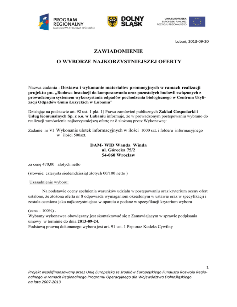 Lubań, 2013-09-20 ZAWIADOMIENIE O WYBORZE NAJKORZYSTNIEJSZEJ OFERTY Nazwa zadania : Dostawa i wykonanie materiałów promocyjnych w ramach realizacji projektu pn. „Budowa instalacji do kompostowania oraz pozostałych budowli związanych z prowadzonym systemem wykorzystania odpadów pochodzenia biologicznego w Centrum Utylizacji Odpadów Gmin Łużyckich w Lubaniu” Działając na podstawie art. 92 ust. 1 pkt. 1) Prawa zamówień publicznych Zakład Gospodarki i Usług Komunalnych Sp. z o.o. w Lubaniu informuje, że w prowadzonym postępowaniu wybrano do realizacji zamówienia najkorzystniejszą ofertę nr 8 złożoną przez Wykonawcę: Zadanie nr VI Wykonanie ulotek informacyjnych w ilości 1000 szt. i folderu informacyjnego w ilości 500szt. DAM- WID Wanda Winda ul. Górecka 75/2 54-060 Wrocław za cenę 470,00 złotych netto (słownie: czterysta siedemdziesiąt złotych 00/100 netto ) Uzasadnienie wyboru: Na podstawie oceny spełnienia warunków udziału w postępowaniu oraz kryterium oceny ofert ustalono, że złożona oferta nr 8 odpowiada wymaganiom określonym w ustawie oraz w specyfikacji i została oceniona jako najkorzystniejsza w oparciu o podane w specyfikacji kryterium wyboru (cena – 100%) . Wybrany wykonawca obowiązany jest skontaktować się z Zamawiającym w sprawie podpisania umowy w terminie do dnia 2013-09-24. Podstawą prawną dokonanego wyboru jest art. 91 ust. 1 Pzp oraz Kodeks Cywilny 1 Projekt współfinansowany przez Unię Europejską ze środków Europejskiego Funduszu Rozwoju Regionalnego w ramach Regionalnego Programu Operacyjnego dla Województwa Dolnośląskiego na lata 2007-2013 1a.Wykaz ,ocena i porównanie ofert złożonych w prowadzonym postępowaniu Numer oferty 6 7 8 10 Nazwa Oferenta Wielkareklama.eu P.P.H.U. Janusz Ciosek Wielka Reklama Ul. Wojska Polskiego 45 98-300 Wieluń Agencja Reklamy i Promocji „DAMI” sp. z o.o. ul. Kilińskiego 4 58-500 Jelenia Góra DAM- WID Wanda Winda ul. Górecka 75/2 54-060 Wrocław POLIGRAFIA T. DUMA ul. Armii Krajowej 4 A 59-800 Lubań Kryterium ceny za realizację zamówieniaŁączna punktacja Kolejność ofert wg kryterium ceny za realizacje zamówienia 76,22 III w kolejności 45,48 IV w kolejności 300,00 I w kolejności 102,55 II w kolejności 2. Działając na podstawie art. 92 ust. 1 pkt. 2) Prawa zamówień publicznych Zamawiający informuje, że w prowadzonym postępowaniu nie zostały odrzucone żadne oferty. 3. Działając na podstawie art. 92 ust. 1 pkt. 3) Prawa zamówień publicznych Zamawiający informuje, że w prowadzonym postępowaniu nie zostali wykluczeni żadni wykonawcy. 4. Działając na podstawie art. 92 ust. 1 pkt. 4) Prawa zamówień publicznych Zamawiający informuje, że podpisanie umowy z wyłonionym wykonawcą możliwe będzie niezwłocznie po dopełnieniu wszelkich formalności w trybie określonym w art. 94 ust. 2 pkt. 3 lit. a Ustawy Pzp. Środki ochrony prawnej Od niniejszej decyzji Zamawiającego, Wykonawcy przysługują środki ochrony prawnej (Odwołanie, Skarga do Sądu) wobec czynności: 1) wykluczenia wykonawcy z postępowania o udzielenie zamówienia; 2) odrzucenia oferty wykonawcy W pozostałych przypadkach odwołanie nie przysługuje. Wykonawca może w terminie przewidzianym do wniesienia odwołania złożyć Zamawiającego informację zgodnie i w trybie art. 181 ust.1 Ustawy Pzp. Informacje dotyczące środków ochrony prawnej znajdują się Specyfikacji istotnych warunków zamówienia oraz w Dziale VI Prawa zamówień publicznych „Środki ochrony prawnej", art. od 179 do 198g Prezes Zarządu Michał Turkiewicz 2 Projekt współfinansowany przez Unię Europejską ze środków Europejskiego Funduszu Rozwoju Regionalnego w ramach Regionalnego Programu Operacyjnego dla Województwa Dolnośląskiego na lata 2007-2013