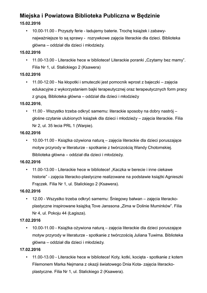 Miejska i Powiatowa Biblioteka Publiczna w Będzinie 15.02.2016 • 10.00-11.00 - Przyszły ferie - ładujemy baterie. Trochę książek i zabawynajważniejsze to są sprawy - rozrywkowe zajęcia literackie dla dzieci. Biblioteka główna – oddział dla dzieci i młodzieży. 15.02.2016 • 11.00-13.00 - Literackie hece w bibliotece! Literackie poranki „Czytamy bez mamy”. Filia Nr 1, ul. Stalickiego 2 (Ksawera) 15.02.2016 • 11.00-12.00 - Na kłopotki i smuteczki jest pomocnik wprost z bajeczki – zajęcia edukacyjne z wykorzystaniem bajki terapeutycznej oraz terapeutycznych form pracy z grupą. Biblioteka główna – oddział dla dzieci i młodzieży 15.02.2016, • 11.00 - Wszystko trzeba odkryć samemu: literackie sposoby na dobry nastrój – głośne czytanie ulubionych książek dla dzieci i młodzieży – zajęcia literackie. Filia Nr 2, ul. 35 lecia PRL 1 (Warpie). 16.02.2016 • 10.00-11.00 - Książka ożywiona naturą – zajęcia literackie dla dzieci poruszające motyw przyrody w literaturze - spotkanie z twórczością Wandy Chotomskiej. Biblioteka główna – oddział dla dzieci i młodzieży. 16.02.2016 • 11.00-13.00 - Literackie hece w bibliotece! „Kaczka w berecie i inne ciekawe historie” - zajęcia literacko-plastyczne realizowane na podstawie książki Agnieszki Frączek. Filia Nr 1, ul. Stalickiego 2 (Ksawera). 16.02.2016 • 12.00 - Wszystko trzeba odkryć samemu: Śniegowy bałwan – zajęcia literackoplastyczne inspirowane książką Tove Janssona „Zima w Dolinie Muminków”. Filia Nr 4, ul. Pokoju 44 (Łagisza). 17.02.2016 • 10.00-11.00 - Książka ożywiona naturą – zajęcia literackie dla dzieci poruszające motyw przyrody w literaturze - spotkanie z twórczością Juliana Tuwima. Biblioteka główna – oddział dla dzieci i młodzieży. 17.02.2016 • 11.00-13.00 - Literackie hece w bibliotece! Koty, kotki, kocięta - spotkanie z kotem Filemonem Marka Nejmana z okazji światowego Dnia Kota- zajęcia literackoplastyczne. Filia Nr 1, ul. Stalickiego 2 (Ksawera). 17.02.2016 • 11.00 - Wszystko trzeba odkryć samemu: twórcze rymy i rytmy – jak napisać wiersz - zajęcia literackie dla dzieci.Filia Nr 2, ul. 35 lecia PRL 1 (Warpie) 17.02.2016 • 11.00 - „Zimowe impresje” – zajęcia plastyczne tworzenia collage inspirowane zimowym pejzażem miasta. Filia Nr 7, ul. Rycerska 2 (Zamkowe). 18.02.2016 • 10.00 - Wszystko trzeba odkryć samemu: Balon show - budowa i animacja kukiełek - zajęcia plastyczne dla dzieci i młodzieży. Filia Nr 2, ul. 35 lecia PRL 1 (Warpie). 18.02.2016 • 10.00-11.00 - Książka ożywiona naturą – zajęcia literackie dla dzieci poruszające motyw przyrody w literaturze - spotkanie z twórczością Jana Brzechwy. Biblioteka główna – oddział dla dzieci i młodzieży. 18.02.2016 • 12.00 - Wszystko trzeba odkryć samemu: Zima w przysłowiach i zagadkach – zajęcia literackie inspirowane książką Tove Janssona „Zima w Dolinie Muminków”. Filia Nr 4, ul. Pokoju 44 (Łagisza) 19.02.2016 • 11.00-13.00 - Literackie hece w bibliotece! W pałacu królowej śniegu – zimowe opowieści- zajęcia literacko-plastyczne dla dzieci. Filia Nr 1, ul. Stalickiego 2 (Ksawera) 22.02.2016 • 10.00-11.00 - Przyszły ferie - ładujemy baterie. Trochę książek i zabawynajważniejsze to są sprawy - rozrywkowe zajęcia literackie dla dzieci. Biblioteka główna – oddział dla dzieci i młodzieży 22.02.2016 • 11.00-13.00 - Literackie hece w bibliotece! Dobrze jest mieć przyjaciela – zajęcia literackie z elementami biblioterapii na podstawie książki Małgorzaty Musierowicz „Znajomi z zerówki”. Filia Nr 1, ul. Stalickiego 2 (Ksawera). 22.02.2016 • 10.00 - Gdyby w Będzinie mieszkał smok…- konkurs plastyczny dla dzieci. Filia Nr 2, ul. 35 lecia PRL 1 (Warpie) 23.02.2016 • 10.00-11.00 - Pomaganie – co, jak i dlaczego? – zajęcia edukacyjne dla dzieci zorganizowane z okazji Międzynarodowego Dnia Pomocy Potrzebującym. Biblioteka główna – oddział dla dzieci i młodzieży. 23.02.2016 • 10.00 - Wszystko trzeba odkryć samemu: Bałwankowe spotkanie – zajęcia literackie dla dzieci realizowane w oparciu o wiersz W. Chotomskiej „Dziesięć bałwanków”. Filia nr 5, ul. Słowackiego 2 (Grodziec) 23.02.2016 • 11.00-13.00 - Literackie hece w bibliotece! Dobrze jest mieć przyjaciela – zajęcia literackie z elementami biblioterapii na podstawie książki Małgorzaty Musierewicz „Znajomi z zerówki”. Filia Nr 1, ul. Stalickiego 2 (Ksawera). 23.02.2016 • 12.00 - Wszystko trzeba odkryć samemu: Zimowe lepy z masy solnej – zajęcia plastyczne inspirowane książką Tove Janssona „Zima w Dolinie Muminków”. Filia Nr 4 – Łagisza, ul. Pokoju 44 (Łagisza) 25.02.2016 • 10.00-11.00 - Na naukę czas nadchodzi. Koniec ferii – nic nie szkodzi. Bo po szkole dla wytchnienia czeka na nas biblioteka – rozrywkowe zajęcia literackie dla dzieci. Biblioteka główna – oddział dla dzieci i młodzieży 25.02.2016, • 10.00 - Wszystko trzeba odkryć samemu: decoupage dla kreatywnych - zajęcia plastyczne dla dzieci i młodzieży. Filia Nr 2, ul. 35 lecia PRL 1 (Warpie). 25.02.2016 • 10.00 - Wszystko trzeba odkryć samemu: Zimowy zawrót głowy, czyli misz-masz – gry, łamigłówki, krzyżówki dla dzieci. Filia nr 5, ul. Słowackiego 2 (Grodziec) 25.02.2016 • 12.00 - Wszystko trzeba odkryć samemu: zimowy turniej gier planszowych. Filia Nr 4, ul. Pokoju 44 (Łagisza). 26.02.2016 • 11.00-13.00 - Literackie hece w bibliotece! – zakończenie Biblioferii wspólną zabawą. Filia Nr 1, ul. Stalickiego 2 (Ksawera). 26.02.2016 • 11.00 - „Dziecięcy ogród najpiękniejszych bajek” – zajęcia literackie dla dzieci. Filia Nr 7, ul. Rycerska 2 (Zamkowe). W czasie ferii: w oddziale dla dzieci i młodzieży dostępny będzie kącik rozrywki: bezpieczna kawiarenka internetowa, gry edukacyjne, w tym na x-boxie gry i zabawy planszowe. w oddziale dla dzieci i młodzieży ora