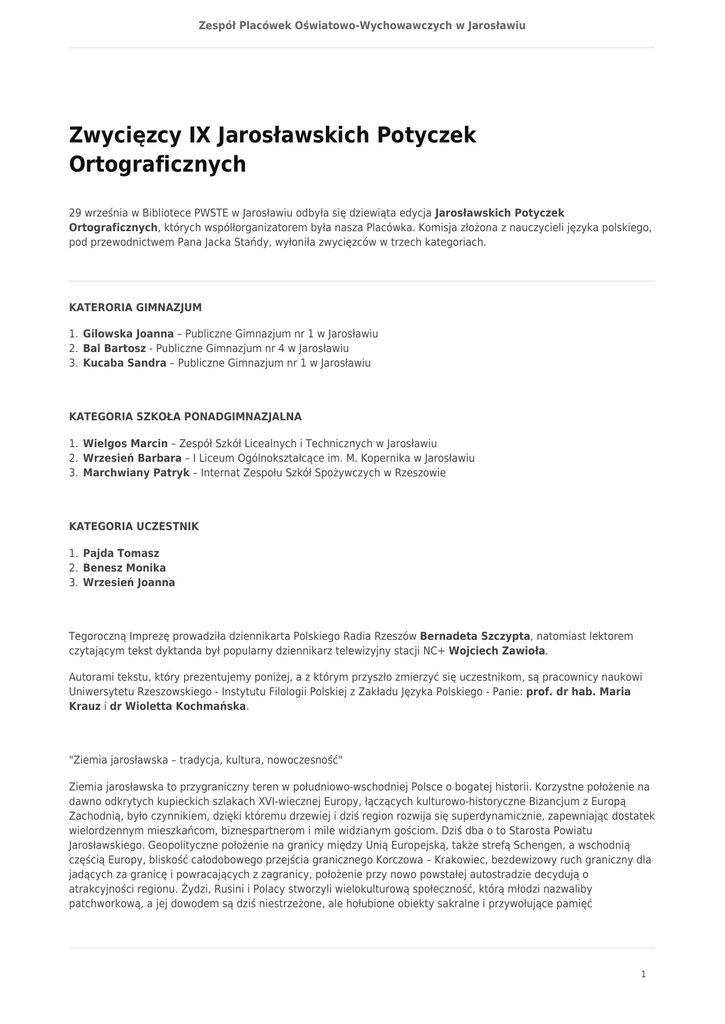 Zespół Placówek Oświatowo-Wychowawczych w Jarosławiu Zwycięzcy IX Jarosławskich Potyczek Ortograficznych 29 września w Bibliotece PWSTE w Jarosławiu odbyła się dziewiąta edycja Jarosławskich Potyczek Ortograficznych, których wspólłorganizatorem była nasza Placówka. Komisja złożona z nauczycieli języka polskiego, pod przewodnictwem Pana Jacka Stańdy, wyłoniła zwycięzców w trzech kategoriach. KATERORIA GIMNAZJUM 1. Gilowska Joanna – Publiczne Gimnazjum nr 1 w Jarosławiu 2. Bal Bartosz - Publiczne Gimnazjum nr 4 w Jarosławiu 3. Kucaba Sandra – Publiczne Gimnazjum nr 1 w Jarosławiu KATEGORIA SZKOŁA PONADGIMNAZJALNA 1. Wielgos Marcin – Zespół Szkół Licealnych i Technicznych w Jarosławiu 2. Wrzesień Barbara – I Liceum Ogólnokształcące im. M. Kopernika w Jarosławiu 3. Marchwiany Patryk – Internat Zespołu Szkół Spożywczych w Rzeszowie KATEGORIA UCZESTNIK 1. Pajda Tomasz 2. Benesz Monika 3. Wrzesień Joanna Tegoroczną Imprezę prowadziła dziennikarta Polskiego Radia Rzeszów Bernadeta Szczypta, natomiast lektorem czytającym tekst dyktanda był popularny dziennikarz telewizyjny stacji NC+ Wojciech Zawioła. Autorami tekstu, który prezentujemy poniżej, a z którym przyszło zmierzyć się uczestnikom, są pracownicy naukowi Uniwersytetu Rzeszowskiego - Instytutu Filologii Polskiej z Zakładu Języka Polskiego - Panie: prof. dr hab. Maria Krauz i dr Wioletta Kochmańska. "Ziemia jarosławska – tradycja, kultura, nowoczesność" Ziemia jarosławska to przygraniczny teren w południowo-wschodniej Polsce o bogatej historii. Korzystne położenie na dawno odkrytych kupieckich szlakach XVI-wiecznej Europy, łączących kulturowo-historyczne Bizancjum z Europą Zachodnią, było czynnikiem, dzięki któremu drzewiej i dziś region rozwija się superdynamicznie, zapewniając dostatek wielordzennym mieszkańcom, biznespartnerom i mile widzianym gościom. Dziś dba o to Starosta Powiatu Jarosławskiego. Geopolityczne położenie na granicy między Unią Europejską, także strefą Schengen, a wschodnią częścią Europy, bliskość całodobowego przejścia granicznego Korczowa – Krakowiec, bezdewizowy ruch graniczny dla jadących za granicę i powracających z zagranicy, położenie przy nowo powstałej autostradzie decydują o atrakcyjności regionu. Żydzi, Rusini i Polacy stworzyli wielokulturową społeczność, którą młodzi nazwaliby patchworkową, a jej dowodem są dziś niestrzeżone, ale hołubione obiekty sakralne i przywołujące pamięć 1 Zespół Placówek Oświatowo-Wychowawczych w Jarosławiu charyzmatycznych przodków nekropolie, w tym XIX-wieczna cerkiew pod wezwaniem Przemienienia Pańskiego powstała na odłamkach rozkruszonych murów zamku Tarnowskich i Jarosławskich, długowiekowy cmentarz żydowski przy ul. Kruhel Pawłosiowski, archaiczne opactwo sióstr benedyktynek z Czarną Kaplicą, noszące dziś nazwę Klasztor Sióstr Benedyktynek w Jarosławiu. Popularność etnoturystyki sprawia, że nie odchodzą w niepamięć również tradycje kulinarne. Obok bałabuchów i wachlarza wysokoprocentowych nalewek, obżarciuch spróbować może świeżo wynalezionych dań takich jak: risotto z bakłażanem, chili con carne, grillowane warzywa, croissanty ze śliwkami i czekoladowe fondue. Przekąski mogą zadowolić dojrzałych i ledwo opierzonych jarosławian oraz Europejczyków. Gród można by obejrzeć na e-stronach. Wirtualny spacer po jarosławskiej starówce skusi przede wszystkim fana nowych technologii, który rozkoszuje się surfowaniem w cyberprzestrzeni. Krótkotrwały postój przy placu św. Michała Archanioła pozwala zauważyć przecudną, miodowożółtą budowlę. Przy ul. Rynek wzbudza zachwyt kamienica Orsettich, w której wnętrzach jaśnieją wizerunki hardych właścicieli Jarosławia. Uwagę zwraca czerwono-ceglana u podstawy studnia, z brunatnoszarym, niespróchniałym dachem, czterokondygnacyjny, archaiczny, wielokrotnie przebudowywany ratusz, centralnie ulokowany pośrodku rynku, umieszczona we wschodniej pierzei późnorenesansowa kamienica zwana Rydzikową, w której piwnicach mieści się Podziemna Trasa Turystyczna im. Feliksa Zalewskiego. À propos, Jarosław zaistniał także na Facebooku nie tylko poprzez lajkowanie stron miasta, ale i hejterskie, niepoprawne językowo wpisy, które nie mają wpływu na rzetelny image miasta. W Dniu Patrona Powiatu Jarosławskiego – Archanioła Michała zaprosić by warto do Jarosławia, Pruchnika, Dinozekolandii w Radymnie i odurzających zmysły miejsc o nieskażonej, dzikiej przyrodzie. 2