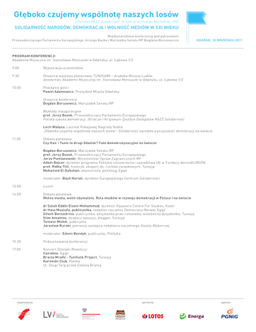 Głęboko czujemy wspólnotę naszych losów z Posłania NSZZ „Solidarność” do ludzi pracy Europy Wschodniej, 1981 SOLIDARNOŚĆ NARODÓW, DEMOKRACJA I WOLNOŚĆ MEDIÓW W XXI WIEKU Międzynarodowa konferencja pod patronatem Przewodniczącego Parlamentu Europejskiego Jerzego Buzka i Marszałka Senatu RP Bogdana Borusewicza Gdańsk, 10 września 2011 PROGRAM KONFERENCJI Akademia Muzyczna im. Stanisława Moniuszki w Gdańsku, ul. Łąkowa 1/2 9:00 Rejestracja uczestników 9:30 Otwarcie wystawy plenerowej TUNISAMI – Arabska Wiosna Ludów dziedziniec Akademii Muzycznej im. Stanisława Moniuszki w Gdańsku, ul. Łąkowa 1/2 10:00 Powitanie gości Paweł Adamowicz, Prezydent Miasta Gdańska Otwarcie konferencji Bogdan Borusewicz, Marszałek Senatu RP Wykłady inauguracyjne prof. Jerzy Buzek, Przewodniczący Parlamentu Europejskiego Polska szkoła demokracji. 30 lat po I Krajowym Zjeździe Delegatów NSZZ Solidarność Lech Wałęsa, Laureat Pokojowej Nagrody Nobla „Głęboko czujemy wspólnotę naszych losów”. Solidarność narodów a przyszłość demokracji na świecie 11:30 Debata panelowa Czy Kair i Tunis to drugi Gdańsk? Fale demokratyzacyjne na świecie Bogdan Borusewicz, Marszałek Senatu RP prof. Jerzy Buzek, Przewodniczący Parlamentu Europejskiego Jerzy Pomianowski, Wiceminister Spraw Zagranicznych RP Adam Balcer, dyrektor programu Polityka rozszerzenia i sąsiedztwa UE w Fundacji demosEUROPA prof. Ridha Tlili, historyk, ekspert ds. ruchów związkowych, Tunezja Mohamed El Dahshan, ekonomista, politolog, Egipt moderator: Basil Kerski, dyrektor Europejskiego Centrum Solidarności 13:00 Lunch 14:00 Debata panelowa Wolne media, wolni obywatele. Rola mediów w rozwoju demokracji w Polsce i na świecie dr Salah Eddin Elzein Mohammed, dyrektor Aljazeera Centre For Studies, Katar dr Hala Mustafa, publicystka, redaktor naczelna Democracy Review, Egipt Sihem Bensedrine, publicystka, aktywistka praw człowieka, wieloletnia dysydentka, Tunezja Slim Amamou, działacz opozycji, blogger, Tunezja Tomasz Wołek, publicysta Jarosław Kurski, pierwszy zastępca redaktora naczelnego Gazety Wyborczej moderator: Edwin Bendyk, publicysta, Polityka 15:30 Podsumowanie konferencji 17:00 Koncert Dźwięki Rewolucji Cairokee, Egipt Bracia Mraihi - Tunifunk Project, Tunezja Karimski Club, Polska Ul. Długi Targ przed Zieloną Bramą organizatorzy partnerzy Rzeczpospolita Polska Ministerstwo Spraw Zagranicznych sponsor