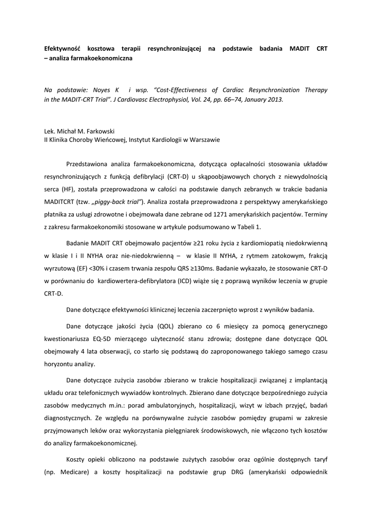 Efektywność kosztowa terapii – analiza farmakoekonomiczna resynchronizującej na podstawie badania MADIT CRT Na podstawie: Noyes K i wsp. “Cost-Effectiveness of Cardiac Resynchronization Therapy in the MADIT-CRT Trial”. J Cardiovasc Electrophysiol, Vol. 24, pp. 66–74, January 2013. Lek. Michał M. Farkowski II Klinika Choroby Wieńcowej, Instytut Kardiologii w Warszawie Przedstawiona analiza farmakoekonomiczna, dotycząca opłacalności stosowania układów resynchronizujących z funkcją defibrylacji (CRT-D) u skąpoobjawowych chorych z niewydolnością serca (HF), została przeprowadzona w całości na podstawie danych zebranych w trakcie badania MADITCRT (tzw. „piggy-back trial”). Analiza została przeprowadzona z perspektywy amerykańskiego płatnika za usługi zdrowotne i obejmowała dane zebrane od 1271 amerykańskich pacjentów. Terminy z zakresu farmakoekonomiki stosowane w artykule podsumowano w Tabeli 1. Badanie MADIT CRT obejmowało pacjentów ≥21 roku życia z kardiomiopatią niedokrwienną w klasie I i II NYHA oraz nie-niedokrwienną – w klasie II NYHA, z rytmem zatokowym, frakcją wyrzutową (EF) <30% i czasem trwania zespołu QRS ≥130ms. Badanie wykazało, że stosowanie CRT-D w porównaniu do kardiowertera-defibrylatora (ICD) wiąże się z poprawą wyników leczenia w grupie CRT-D. Dane dotyczące efektywności klinicznej leczenia zaczerpnięto wprost z wyników badania. Dane dotyczące jakości życia (QOL) zbierano co 6 miesięcy za pomocą generycznego kwestionariusza EQ-5D mierzącego użyteczność stanu zdrowia; dostępne dane dotyczące QOL obejmowały 4 lata obserwacji, co starło się podstawą do zaproponowanego takiego samego czasu horyzontu analizy. Dane dotyczące zużycia zasobów zbierano w trakcie hospitalizacji związanej z implantacją układu oraz telefonicznych wywiadów kontrolnych. Zbierano dane dotyczące bezpośredniego zużycia zasobów medycznych m.in.: porad ambulatoryjnych, hospitalizacji, wizyt w izbach przyjęć, badań diagnostycznych. Ze względu na porównywalne zużycie zasobów pomiędzy grupami w zakresie przyjmowanych leków oraz wykorzystania pielęgniarek środowiskowych, nie włączono tych kosztów do analizy farmakoekonomicznej. Koszty opieki obliczono na podstawie zużytych zasobów oraz ogólnie dostępnych taryf (np. Medicare) a koszty hospitalizacji na podstawie grup DRG (amerykański odpowiednik Jednorodnych Grup Pacjentów). Dodatkowy koszt implantacji CRT-D zamiast ICD oszacowano na podstawie wartości dostarczonych przez producenta. Wszystkie wyniki wyrażono w dolarach amerykańskich. Nie brano pod uwagę kosztów pośrednich leczenia (np. koszt utraconej produktywności w związku ze zwolnieniem chorobowym po zabiegu). Przeprowadzono podstawowe analizy efektywności kosztów (LY), użyteczności kosztów (QALY) oraz analizę dla pacjentów z blokiem lewej odnogi pęczka Hisa (LBBB) z wydzieleniem podgrup: płeć, grupy wiekowe ≤65 roku życia, 65-74 i ≥75 lat. Przeprowadzono analizę wrażliwości wyników badania. Koszt stosowania CRT-D był wyższy od kosztu ICD, zarówno w zakresie samej implantacji (ok. 37 tys USD vs 30 tys USD), jak i ogólnego kosztu terapii (48 tys USD vs 41,6 tys USD) natomiast istotną przewagę w jakości życia zanotowano jedynie u pacjentów z LBBB – poprawa o 0,2 QALY. Próg opłacalności przyjęto na poziomie 50 tys USD/QALY. W populacji ogólnej pacjentów badania MADIT CRT, stosowanie CRT-D zamiast ICD wiązało się z inkrementalnym wskaźnikiem efektywności kosztów (ICER) ok. 81 tys USD/LY oraz inkrementalnym wskaźnikiem użyteczności kosztów (ICUR) ok. 58 tys USD/QALY. Dla przyjętego progu opłacalności, prawdopodobieństwo opłacalności zastąpienia ICD przez CRT-D wyliczono na 40%. W populacji pacjentów z LBBB uzyskano znacznie lepsze wskaźniki opłacalności: ICER 23 tys USD/LY a ICUR 16,6tys USD/QALY. Dla badanych podgrup pacjentów z LBBB < 75 roku życia, ICUR nie przekraczał 25 tys USD/QALY. Wskaźniki farmakoekonomiczne poprawiały się wraz z wydłużeniem horyzontu analizy. Uwzględnienie w analizie problematyki unikniętej chorobowości związanej z HF poprawiło wyniki analizy: ok. 23 tys USD/QALY bez HF w grupie ogólnej i ok. 7,3 tys USD/QALY bez HF wśród pacjentów z LBBB. Badanie miało kilka ograniczeń: wyniki efektywności klinicznej pochodziły z jednego badania klinicznego a nie przeglądu systematycznego, autorzy raportowali braki w danych dot. zużycia zasobów sięgające 30% oraz ogólne problemy z metodyką QALY wspólne dla wszystkich analiz farmakoekonomicznych wykorzystujących to narzędzie. Podsumowując, pomimo wymienionych ograniczeń, analiza farmakoekonomiczna danych z badania MADIT CRT wykazała, że w warunkach USA stosowanie CRT-D zamiast ICD u mało objawowych pacjentów z HF i LBBB jest postępowaniem opłacalnym już w horyzoncie 4 lat dla przyjętego progu opłacalności 50 tys USD/QALY. Wynik ten był podobny w badanych podgrupach <75 roku życia. Finansowanie badania: grant badawczy ufundowany przez Boston Scientific. Tabela 1. Terminy z zakresu farmakoekonomiki stosowane w artykule. Termin Skrót Opis miara efektywności opisująca Zyskane lata życia LY wpływ terapii na poprawę ogólnego przeżycia miara efektywności obejmująca Zyskane lata życia skorygowane o jakość wpływ QALY terapii na poprawę przeżycia oraz na jakość życia pacjenta – 1 QALY to 1 rok przeżyty w pełnym zdrowiu Inkrementalny wskaźnik kosztowej efektywności Inkrementalny wskaźnik kosztowej użyteczności miara ICER opłacalności terapii wyrażona jako koszt uzyskania 1 LY miara ICUR opłacalności terapii wyrażona jako koszt uzyskania 1 QALY