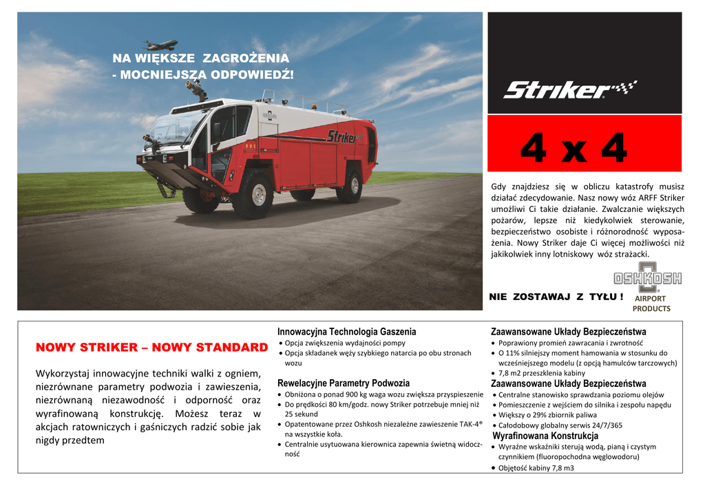 NA WIĘKSZE ZAGROŻENIA - MOCNIEJSZA ODPOWIEDŹ! 4x4 Gdy znajdziesz się w obliczu katastrofy musisz działać zdecydowanie. Nasz nowy wóz ARFF Striker umożliwi Ci takie działanie. Zwalczanie większych pożarów, lepsze niż kiedykolwiek sterowanie, bezpieczeństwo osobiste i różnorodność wyposażenia. Nowy Striker daje Ci więcej możliwości niż jakikolwiek inny lotniskowy wóz strażacki. NIE ZOSTAWAJ Z TYŁU ! NOWY STRIKER – NOWY STANDARD Wykorzystaj innowacyjne techniki walki z ogniem, niezrównane parametry podwozia i zawieszenia, niezrównaną niezawodność i odporność oraz wyrafinowaną konstrukcję. Możesz teraz w akcjach ratowniczych i gaśniczych radzić sobie jak nigdy przedtem AIRPORT PRODUCTS Innowacyjna Technologia Gaszenia Zaawansowane Układy Bezpieczeństwa Opcja zwiększenia wydajności pompy Opcja składanek węży szybkiego natarcia po obu stronach wozu Poprawiony promień zawracania i zwrotność O 11% silniejszy moment hamowania w stosunku do wcześniejszego modelu (z opcją hamulców tarczowych) 7,8 m2 przeszklenia kabiny Rewelacyjne Parametry Podwozia Zaawansowane Układy Bezpieczeństwa Obniżona o ponad 900 kg waga wozu zwiększa przyspieszenie Centralne stanowisko sprawdzania poziomu olejów Do prędkości 80 km/godz. nowy Striker potrzebuje mniej niż Pomieszczenie z wejściem do silnika i zespołu napędu 25 sekund Większy o 29% zbiornik paliwa Opatentowane przez Oshkosh niezależne zawieszenie TAK-4® Całodobowy globalny serwis 24/7/365 na wszystkie koła. Wyrafinowana Konstrukcja Centralnie usytuowana kierownica zapewnia świetną widocz- Wyraźne wskaźniki sterują wodą, pianą i czystym ność czynnikiem (fluoropochodna węglowodoru) Objętość kabiny 7,8 m3 TO NOWY STRIKER ZMIENIA TWOJE SPOSOBY DZIAŁANIA PARAMETRY 4x4 Wasz przedstawiciel w Polsce: NAVIMOR OXER, Sopot www.navox.pl 58 550 78 02 AIRPORT PRODUCTS Podane parametry są częściowe i przykładowe. Dalsze opcje na zamówienie. Striker 4x4 spełnia i przewyższa wymagania National Fire Protection Association NFPA 414, Federal Aviation Administration FAA i International Civil Aviation Organization ICAO wobec lotniskowych wozów ARFF klasy 1 500 gal (5.678 litrów) Prędkość maksymalna: ponad 113 km/godz. Stabilność Poprzeczna (Statyczna): ≥ 30° Pokonywanie pochyleń: Podjazd / zjazd – pochylenie 50% Średnica zawracania: 25,75 m Wymiary: 1.082 cm długość 300 cm szerokość 356 cm max wysokość bez HRET (z pełnym zbiornikiem wody) PODWOZIE Silnik: Deutz TCD 16.0 L V8, moc 697 KM, moment obrotowy 2.650 Nm przy 1.400 obr/min, zgodność z normami emisyjnymi Tier4i/Euro5 Anti-Lock Braking System (ABS) Przeniesienie napędu: Automatyczna, elektroniczna, 7-biegowa skrzynia Allison 4800 EVS Kabina: Konstrukcja z ram aluminiowych, do 5 siedzeń, centralna pozycja kierowcy, dookólna deska instrumentów, wyraźne podświetlane wskaźniki i zegary Klimatyzacja: wydajność 63.300 kJ Ogrzewanie kabiny: wydajność 84.400 kJ Skrzynia transmisji: Oshkosh, niezależnie zwieszona, dyferencjał automatycznej proporcji momentu obrotowego, blokowana przez kierowcę Oś przednia: Oshkosh 14.061 kg, podwójna kątowa przekładnia różnicowa, włączana przez kierowcę blokadą różnicową, poprzecznie i osobno przód/tył Hamulce przednie: W standardzie bębnowe Rockwell® z podwójnym siłownikiem powietrznym. Jako opcja hamulce tarczowe 17” Rotor Bendix® SN7 Oś tylna: 14.061 kg z podwójną, kątową przekładnią różnicową firmy Oshkosh i włączaną przez kierowcę blokadą. Hamulce tylne: Typu S-cam, sprężynowanie pneumatyczno-mechaniczne, opcja hamulce tarczowe Zawieszenie: System niezależnego zawieszenia TAK-4 ® firmy Oshkosh z podwójnymi dźwigniami kierującymi i pojedynczymi resorami sprężynowymi zapewniającymi sprężynowanie kół (skok) do 40,6 cm, doskonałą jezdność, zwrotność i wygodę kierowania na wszystkich rodzajach terenu. Ogumienie: Michelin® 24R21 XZL Dopuszczalna masa całkowita GVWR: 28.123 kg Rozstaw osi: 556 cm WYPOSAŻENIE GAŚNICZE Działko dachowe: Opcje niezasysające i zasysające, sterowane elektrycznym joystickiem, 1.420/2.839 l/min. Opcje do 6.000 l/min Działko zderzakowe: Opcje niezasysające i zasysające, sterowane joystickiem, 1.136 l/min. Opcje wyższych wydajności. Zbiornik wodny: Pojemność 5.678 l, odporny na korozję i promienie UV, polipropylen Zbiornik piany: Pojemność 795 l, materiał odporny na korozję i promienie UV, polipropylen Autopompa: Napęd z rozdzielacza mocy, Waterous® CRQB, odśrodkowa, jednostopniowa, korpus żeliwny, wirnik mosiądz, wał ze stali nierdzewnej, do pracy w jeździe, 7.511 l/min Opcja wysokowydajnej pompy Waterous® CRUQB 10.031 l/min. Opcja pompy wykonanej z brązu i mosiądzu Zwijadła stałe: Linia 30 m woda/piana lub 46 m z linią proszkową System dozowania piany: Obiegowy typu around-the-pump Zaawansowana Technologia Gaszenia Ultra-wysokie ciśnienie wody UHP 83 bar Wysokowydajne pompy wody 4 czynniki gaśnicze (woda, piana, proszek, Halotron™ czynnik „czysty” fluoropochodny) System Sprężonej Piany CAFS a OPCJE Wychylane zwijadła: Linia 30 m woda/piana lub 46 m z linią proszkową Hamulce tarczowe o konstrukcji outboard mounting Centralny System Pompowania Kół Pakiet niskotemperaturowy dla operacji w temperaturach do -40°C Dodatkowa pompa hydrauliczna Opcje 10 i 15 kW Oświetlenia dodatkowe Działko na Dalekosiężnym Wysięgniku HRET Snozzle Wysokowydajne Działko Zderzakowe montaż stały lub na opuszczanym ramieniu niskiego ataku 4.732 l/min System Proszkowy: linie pojedynczego i podwójnego czynnika i/lub przez działko dachowe System Centralnego Smarowania Bezpośredni Wtrysk Hydro-Chem™ Dachowe działko proszkowe lub linia ręczna na 2 czynniki System „Czystego” Czynnika: linie pojedynczego i podwójnego czynnika i/lub przez HRET Elektroniczny System Proporcji Piany ©2012 Oshkosh Corporation, Navimor Oxer. Oshkosh, the Oshkosh logo, oraz TAK-4 są 