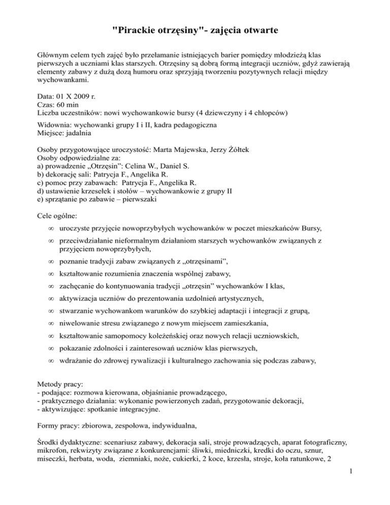 "Pirackie otrzęsiny"- zajęcia otwarte Głównym celem tych zajęć było przełamanie istniejących barier pomiędzy młodzieżą klas pierwszych a uczniami klas starszych. Otrzęsiny są dobrą formą integracji uczniów, gdyż zawierają elementy zabawy z dużą dozą humoru oraz sprzyjają tworzeniu pozytywnych relacji między wychowankami. Data: 01 X 2009 r. Czas: 60 min Liczba uczestników: nowi wychowankowie bursy (4 dziewczyny i 4 chłopców) Widownia: wychowanki grupy I i II, kadra pedagogiczna Miejsce: jadalnia Osoby przygotowujące uroczystość: Marta Majewska, Jerzy Żółtek Osoby odpowiedzialne za: a) prowadzenie „Otrzęsin”: Celina W., Daniel S. b) dekorację sali: Patrycja F., Angelika R. c) pomoc przy zabawach: Patrycja F., Angelika R. d) ustawienie krzesełek i stołów – wychowankowie z grupy II e) sprzątanie po zabawie – pierwszaki Cele ogólne: • uroczyste przyjęcie nowoprzybyłych wychowanków w poczet mieszkańców Bursy, • przeciwdziałanie nieformalnym działaniom starszych wychowanków związanych z przyjęciem nowoprzybyłych, • poznanie tradycji zabaw związanych z „otrzęsinami”, • kształtowanie rozumienia znaczenia wspólnej zabawy, • zachęcanie do kontynuowania tradycji „otrzęsin” wychowanków I klas, • aktywizacja uczniów do prezentowania uzdolnień artystycznych, • stwarzanie wychowankom warunków do szybkiej adaptacji i integracji z grupą, • niwelowanie stresu związanego z nowym miejscem zamieszkania, • kształtowanie samopomocy koleżeńskiej oraz nowych relacji uczniowskich, • pokazanie zdolności i zainteresowań uczniów klas pierwszych, • wdrażanie do zdrowej rywalizacji i kulturalnego zachowania się podczas zabawy, Metody pracy: - podające: rozmowa kierowana, objaśnianie prowadzącego, - praktycznego działania: wykonanie powierzonych zadań, przygotowanie dekoracji, - aktywizujące: spotkanie integracyjne. Formy pracy: zbiorowa, zespołowa, indywidualna, Środki dydaktyczne: scenariusz zabawy, dekoracja sali, stroje prowadzących, aparat fotograficzny, mikrofon, rekwizyty związane z konkurencjami: śliwki, miedniczki, kredki do oczu, sznur, miseczki, herbata, woda, ziemniaki, noże, cukierki, 2 koce, krzesła, stroje, koła ratunkowe, 2 1 miotły, piłeczki do tenisa, kreda, mapy, karteczki z instrukcjami, krzesła, minutnik, butelka po winie. Sceneria uroczystości: Przednia część sali przedstawia wyspę piratów. Sala udekorowana palmami, roślinami, flagą piracką, siatka rybacką, papuga i beczka z rumem. Osoby prowadzące w strojach pirackich. Realne wytwory: - zdjęcia w kronice bursy i na strony internetowej, - wystawa zdjęć z uroczystości w gablocie, Przebieg otrzęsin: I. Powitanie przybyłych osób przez prowadzących otrzęsiny. Celina: Dobry Wieczór. Chciałabym serdecznie powitać wszystkich przybyłych na dzisiejszą uroczystość: Panią wicedyrektor, wychowawców, a przede wszystkim Was - Pierwszoroczniaki, którzy wstąpiliście w progi naszej bursy i zaprosić na spotkanie z Piratami, zgodnie z regułą, że śmiech łagodzi obyczaje i hasłem, które nam przyświeca: ,,Miło jest być dowcipnym we właściwym miejscu". Przybyliście na naszą WYSPĘ PIRATÓW nielegalnie. Szczęśliwe życie, które wiodą tu Piraci zakłóciliście swoja obecnością. Kłótnie i spory trwają zwykle krótko, bo je nasz Kapitan swą potęgą rozstrzyga i ucisza. Daniel: Dziękujemy odważnym za podjęcie wyzwania i stawienia się na naszym piekielnym pokładzie. Wnet i Wy zawrzecie bliższą tu z nami znajomość. Towarzyszyć Wam i dodawać otuchy będą nasi Piraci. Niektórzy będą wyjątkowo okrutni. Nie sprzeciwiajcie się ich woli. Posłusznie przyjmujcie ich wyroki, a zapewniamy, że nic złego Was nie spotka i wkrótce staniecie się nieśmiertelni. A jeżeli nie będziecie przestrzegać pirackiego regulaminu dobrego wychowania, to zrobią z Wami porządek. Najbardziej wytrwałych czeka nagroda. Czas zmierzyć się i podjąć walkę o przetrwanie. Poznaliście już nas. Czas by wszyscy tu obecni poznali Was! Podzielimy was teraz na 2 grupy, które będą ze sobą konkurować. II. Konkurencje: 1) Tatuaż: sprawdzanie umiejętności manualnych – rysowanie Celina: Pierwsza konkurencja nazwana „Tatuaż” – sprawi, że będziecie piękni i urokliwi. Wnet odmienimy wasze twarze. Każdego Pirata charakteryzuje – tatuaż. Zadanie polega na tym, aby przy użyciu kredek do oczu, zrobić jak najzabawniejszy tatuaż grupa I maluje twarze grupie II, a następnie zamiana. Na wykonanie tatuażu macie 2 minuty. Start. Proszę zaprezentować się widowni, która zadecyduje o wygranej. 2) Piracki posiłek – sprawdzanie umiejętności manualnych - obieranie ziemniaków na czas. Daniel: Wiadomo, że każdy majtek pokładowy pomaga w kuchni i wy też dzisiaj macie takie zadanie. Będziecie obierać ziemniaki, tylko ładnie i dokładnie proszę, bo nasz kapitan nie lubi kwadratowych ziemniaków. Wygrywa drużyna, która obierze najwięcej ziemniaków w ciągu 1 min. Gotowi? Start. Dziękujemy 3) Rum ulubiony napój piratów: sprawdzanie umiejętności „kocich” – picie herbaty z miseczki. Celina: W tej jakże podniosłej i jakże ważnej w waszym życiu chwili, warto by wznieść za nią toast. Z tej właśnie okazji mamy dla was Rum, które wypadałoby wypić za zdrowie naszych gospodarzy, ale pamiętajcie, że jest to pierwszy i ostatni raz kiedy możecie wypić trochę rumu w bursie. Ustawcie się w szeregu, ręce do tyłu i spróbujcie w jak najszybszym czasie wypić 2 rum z miseczki, bez użycia rąk. Gotowi? Zaczynamy. Poszło wam świetnie, podejrzewam, że od dziś będziecie abstynentami. 4) Pirackie zawody - sprawdzanie umiejętności fizycznych. Daniel: Posileni powinniście być teraz bardzo silni, a to wam się teraz przyda, bo zaczynamy pirackie zawody. Każdy pirat charakteryzuje się dobrą sprawnością i tężyzną fizyczną, więc teraz sprawdzimy czy wy ją posia