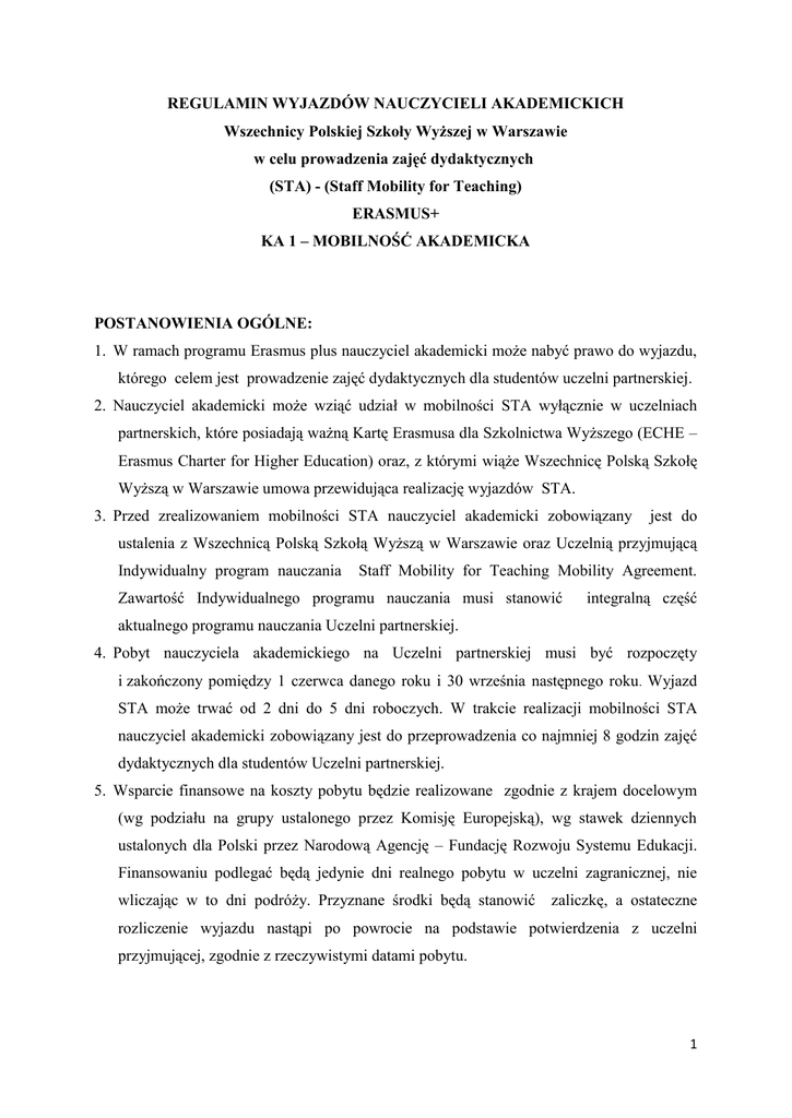 REGULAMIN WYJAZDÓW NAUCZYCIELI AKADEMICKICH Wszechnicy Polskiej Szkoły Wyższej w Warszawie w celu prowadzenia zajęć dydaktycznych (STA) - (Staff Mobility for Teaching) ERASMUS+ KA 1 – MOBILNOŚĆ AKADEMICKA POSTANOWIENIA OGÓLNE: 1. W ramach programu Erasmus plus nauczyciel akademicki może nabyć prawo do wyjazdu, którego celem jest prowadzenie zajęć dydaktycznych dla studentów uczelni partnerskiej. 2. Nauczyciel akademicki może wziąć udział w mobilności STA wyłącznie w uczelniach partnerskich, które posiadają ważną Kartę Erasmusa dla Szkolnictwa Wyższego (ECHE – Erasmus Charter for Higher Education) oraz, z którymi wiąże Wszechnicę Polską Szkołę Wyższą w Warszawie umowa przewidująca realizację wyjazdów STA. 3. Przed zrealizowaniem mobilności STA nauczyciel akademicki zobowiązany jest do ustalenia z Wszechnicą Polską Szkołą Wyższą w Warszawie oraz Uczelnią przyjmującą Indywidualny program nauczania Staff Mobility for Teaching Mobility Agreement. Zawartość Indywidualnego programu nauczania musi stanowić integralną część aktualnego programu nauczania Uczelni partnerskiej. 4. Pobyt nauczyciela akademickiego na Uczelni partnerskiej musi być rozpoczęty i zakończony pomiędzy 1 czerwca danego roku i 30 września następnego roku. Wyjazd STA może trwać od 2 dni do 5 dni roboczych. W trakcie realizacji mobilności STA nauczyciel akademicki zobowiązany jest do przeprowadzenia co najmniej 8 godzin zajęć dydaktycznych dla studentów Uczelni partnerskiej. 5. Wsparcie finansowe na koszty pobytu będzie realizowane zgodnie z krajem docelowym (wg podziału na grupy ustalonego przez Komisję Europejską), wg stawek dziennych ustalonych dla Polski przez Narodową Agencję – Fundację Rozwoju Systemu Edukacji. Finansowaniu podlegać będą jedynie dni realnego pobytu w uczelni zagranicznej, nie wliczając w to dni podróży. Przyznane środki będą stanowić zaliczkę, a ostateczne rozliczenie wyjazdu nastąpi po powrocie na podstawie potwierdzenia z uczelni przyjmującej, zgodnie z rzeczywistymi datami pobytu. 1 Dzienna wartość stypendium w euro przy wyjazdach trwających do 14 dni* Kraje wchodzące w skład grupy Dania, Holandia, Irlandia, Szwecja, 130€ Wielka Brytania Austria, Belgia, Bułgaria, Cypr, Czechy, Finlandia, Francja, Grecja, Islandia, Grupa II Liechtenstein, Luksemburg, 110€ Norwegia, Polska, Rumunia, Szwajcaria, Turcja, Węgry, Włochy Hiszpania, Łotwa, Malta, Niemcy, Grupa III 100€ Portugalia, Słowacja Grupa IV Chorwacja, Estonia, Litwa, Słowenia 80€ *Podane w tabeli wartości odnoszą się do pobytów trwających do 14 dni. W przypadku wyjazdów na dłuższe okresy od 15. dnia pobytu wypłacona stawka dzienna wynosi 70% stawki dziennej wypłaconej na pobyt trwający do 14 dni. Grupa I 6. Kwota dofinansowania przekraczająca wysokość diet dziennych określonych w rozporządzeniu Ministra Pracy i Polityki Społecznej z dnia 29 stycznia 2013 roku w sprawie należności przysługujących pracownikowi zatrudnionemu w państwowej lub samorządowej jednostce sfery budżetowej z tytułu podróży służbowej (Dz. U. poz. 167) będzie opodatkowana. 7. Z nauczycielem akademickim zakwalifikowanym do wyjazdu typu STA zawierana jest umowa finansowa KRYTERIA FORMALNE 1. Do ubiegania się o wyjazd w ramach programu Erasmus plus uprawnieni są nauczyciele akademiccy, którzy są pracownikami Wszechnicy Polskiej Szkoły Wyższej w Warszawie. 2. Nauczyciele akademiccy ubiegający się o wyjazd STA w ramach programu Erasmus plus są zobowiązani do przedłożenia podania o wyjazd w terminie do 30 listopada danego roku akademickiego. Po tym terminie istnieje możliwość przeprowadzenia dodatkowej rekrutacji aż do wyczerpania limitu miejsc. ZASADY REKRUTACJI I REALIZACJI WYJAZDÓW 1. Oceny kandydatów na wyjazd za granicę w celach dydaktycznych dokonuje Prorektor oraz Uczelniany Koordynator Programu Erasmus 2 2. O wynikach oceny kandydaci zostaną poinformowani drogą elektroniczną lub telefoniczną. 3. Kandydatom nie zakwalifikowanym na wyjazd przysługuje odwołanie sporządzone na piśmie i kierowane do komisji odwoławczej, której skład zatwierdzi Rektor Wszechnicy Polskiej w Warszawie. Odwołanie należy złożyć w ciągu 5 dni od ogłoszenia wyników. 4. Od decyzji Komisji Odwoławczej nie przysługuje odwołanie. 5. Nauczyciel akademicki zobowiązany jest do wykupienia właściwego ubezpieczenia na czas podróży oraz pobytu w uczelni partnerskiej oraz od kosztów leczenia oraz następstw nieszczęśliwych wypadków. 6. Po zrealizowaniu mobilności typu STA nauczyciel akademicki zobowiązany jest do złożenia w Biurze Współpracy z Zagranicą zaświadczenia o pobycie w uczelni partnerskiej wskazującego daty rozpoczęcia i zakończenia pobytu oraz potwierdzającego liczbę godzin przeprowadzonych zajęć dydaktycznych. - sprawozdania z pobytu, - wypełnienia on-line Ankiety Stypendysty Erasmusa. 3