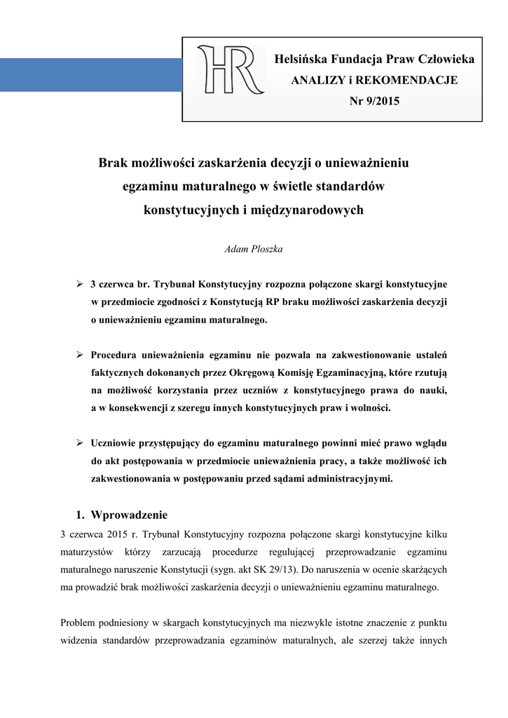 Helsińska Fundacja Praw Człowieka ANALIZY i REKOMENDACJE Nr 9/2015 Brak możliwości zaskarżenia decyzji o unieważnieniu egzaminu maturalnego w świetle standardów konstytucyjnych i międzynarodowych Adam Ploszka 3 czerwca br. Trybunał Konstytucyjny rozpozna połączone skargi konstytucyjne w przedmiocie zgodności z Konstytucją RP braku możliwości zaskarżenia decyzji o unieważnieniu egzaminu maturalnego. Procedura unieważnienia egzaminu nie pozwala na zakwestionowanie ustaleń faktycznych dokonanych przez Okręgową Komisję Egzaminacyjną, które rzutują na możliwość korzystania przez uczniów z konstytucyjnego prawa do nauki, a w konsekwencji z szeregu innych konstytucyjnych praw i wolności. Uczniowie przystępujący do egzaminu maturalnego powinni mieć prawo wglądu do akt postępowania w przedmiocie unieważnienia pracy, a także możliwość ich zakwestionowania w postępowaniu przed sądami administracyjnymi. 1. Wprowadzenie 3 czerwca 2015 r. Trybunał Konstytucyjny rozpozna połączone skargi konstytucyjne kilku maturzystów którzy zarzucają procedurze regulującej przeprowadzanie egzaminu maturalnego naruszenie Konstytucji (sygn. akt SK 29/13). Do naruszenia w ocenie skarżących ma prowadzić brak możliwości zaskarżenia decyzji o unieważnieniu egzaminu maturalnego. Problem podniesiony w skargach konstytucyjnych ma niezwykle istotne znaczenie z punktu widzenia standardów przeprowadzania egzaminów maturalnych, ale szerzej także innych Brak możliwości zaskarżenia decyzji o unieważnieniu egzaminu maturalnego w świetle standardów konstytucyjnych i międzynarodowych państwowych egzaminów wieńczących kolejne etapy edukacji szkolnej czy zawodowej. Z tego względu warto na niego spojrzeć z szerszej perspektywy poszanowania praw i wolności jednostki, co jest celem niniejszego opracowania. 2. Stan faktyczny Skargi do Trybunału Konstytucyjnego zostały wniesione w związku z następującym stanem faktycznym. 18 maja 2011 r. skarżący, absolwenci Liceum Ogólnokształcącego w Ostrowcu Świętokrzyskim (dalej: „Liceum”) przystąpili do ogólnokrajowego pisemnego egzaminu maturalnego z chemii na poziomie rozszerzonym. Egzamin przeprowadzony w Liceum przebiegł bez zakłóceń, a arkusze egzaminacyjne skarżących zostały przesłane Okręgowej Komisji Egzaminacyjnej w Łodzi (dalej: „OKE” lub „OKE w Łodzi”) celem jego sprawdzenia. Skarżący 30 czerwca 2011 r. otrzymali od Dyrektora Liceum informację o tym, że ich egzamin został unieważniony przez Dyrektora OKE w Łodzi, z uwagi na fakt, że w ich arkuszach dopatrzono się elementów świadczących o niesamodzielnym rozwiązaniu zadań egzaminacyjnych. Informację tę przekazano skarżącym ustnie na podstawie listu od OKE do Dyrektora Liceum z dnia 27 czerwca 2011 r. W piśmie tym nie zawarto szczegółowych informacji odnośnie nieprawidłowości w zakwestionowanych pracach maturalnych. Zarzut niesamodzielności dotyczył łącznie 54 uczniów zdających egzamin maturalny z chemii w Liceum Ogólnokształcącym nr II i nr III w Ostrowcu Świętokrzyskim, a więc około 50% zdających. Skarżący wnieśli odwołanie do organu wyższej instancji, tj. Ministra Edukacji Narodowej (dalej: MEN), który jak wynika ze stanowiska MEN, nie rozpatrzył odwołania. Niezależnie od złożenia odwołania, na podstawie art. 52 § 3 ustawy z dnia 30 sierpnia 2002 r. – Prawo o postępowaniu przed sądami administracyjnymi 1 (dalej: „p.p.s.a.”), skarżący wezwali Dyrektora OKE do usunięcia naruszenia prawa poprzez uchylenie zaskarżonej decyzji i merytoryczne sprawdzenie pracy egzaminacyjnej, podnosząc m.in., że egzamin w Liceum przebiegł bez żadnych zakłóceń. 1 Dz.U. z 2012 r., poz. 270 ze zm. 2 Brak możliwości zaskarżenia decyzji o unieważnieniu egzaminu maturalnego w świetle standardów konstytucyjnych i międzynarodowych W odpowiedzi na to żądanie, Dyrektor OKE w Łodzi, podtrzymał swoje stanowisko. Dyrektor OKE w Łodzi podniósł m.in. że praca maturalna skarżących poddawana była kilkukrotnej analizie przez uprawnione osoby oraz to, że proces sprawdzania pracy był zgodny z obowiązującą w OKE w Łodzi „Instrukcją postępowania w przypadku stwierdzenia niesamodzielności rozwiązań zadań egzaminacyjnych” (niepubl.). Organ nie udostępnił skarżącym protokołów czy też innego rodzaju dokumentacji sprawdzania pracy maturalnej, w tym opisów kryteriów oceny prac. Skarżący nie mieli dostępu do prac innych osób, które miałyby wskazywać na ich rzekomą niesamodzielność podczas egzaminu, a także nie mieli możliwości by zapoznać się z ww. instrukcją, będącą aktem wewnętrznym. Skarżący stwierdzili natomiast, porównując treść różnych dokumentów OKE do których mieli dostęp, że zachodzą rozbieżności w opisie zakresów zadań, które rzekomo osoby zdające egzamin maturalny w Ostrowcu Świętokrzyskim miały rozwiązać niesamodzielnie. Dopiero po licznych pismach skarżących, Centralna Komisja Egzaminacyjna przesłała do właściwych liceów, pismem z dnia 7 lipca 2011 r., informację o numerach zadań, w których rzekomo miały pojawić się przypadki niesamodzielności. Postępowanie w przedmiocie unieważnienia egzaminów maturalnych z chemii wobec uczniów z Ostrowca Świętokrzyskiego skierowane zostało przez skarżących do Najwyższej Izby Kontroli (dalej: „NIK”). W wystąpieniu Pokontrolnym do Dyrektor Okręgowej Komisji Egzaminacyjnej w Łodzi z dnia 21 marca 2012 r., NIK negatywnie oceniła unieważnienie części pisemnej egzaminów maturalnych z chemii na poziomie rozszerzonym 53 uczniom II i III Liceum Ogólnokształcącego w Ostrowcu Świętokrzyskim, co stanowiło 47% zdających z tego przedmiotu w ww. szkołach. Wystąpienie pokontrolne wskazuje na nieprawidłowości polegające m.in. na: braku odpowiednich procedur postępowania w zakresie unieważnienia części pisemnej egzaminów maturalnych w przypadku st