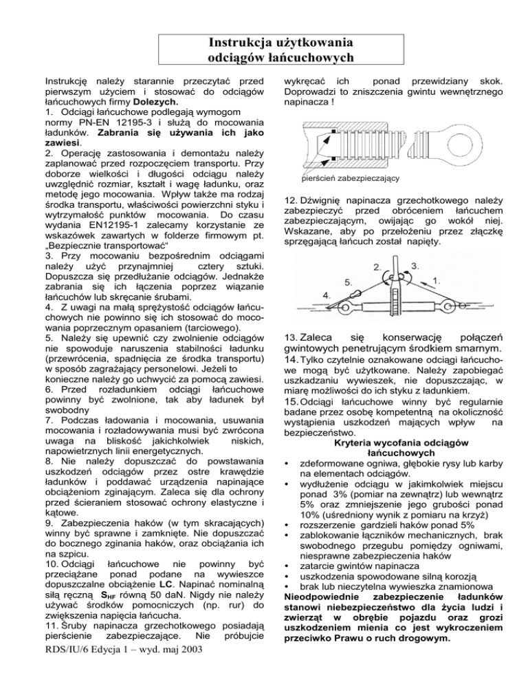 Instrukcja uŜytkowania odciągów łańcuchowych Instrukcję naleŜy starannie przeczytać przed pierwszym uŜyciem i stosować do odciągów łańcuchowych firmy Dolezych. 1. Odciągi łańcuchowe podlegają wymogom normy PN-EN 12195-3 i słuŜą do mocowania ładunków. Zabrania się uŜywania ich jako zawiesi. 2. Operację zastosowania i demontaŜu naleŜy zaplanować przed rozpoczęciem transportu. Przy doborze wielkości i długości odciągu naleŜy uwzględnić rozmiar, kształt i wagę ładunku, oraz metodę jego mocowania. Wpływ takŜe ma rodzaj środka transportu, właściwości powierzchni styku i wytrzymałość punktów mocowania. Do czasu wydania EN12195-1 zalecamy korzystanie ze wskazówek zawartych w folderze firmowym pt. „Bezpiecznie transportować“ 3. Przy mocowaniu bezpośrednim odciągami naleŜy uŜyć przynajmniej cztery sztuki. Dopuszcza się przedłuŜanie odciągów. JednakŜe zabrania się ich łączenia poprzez wiązanie łańcuchów lub skręcanie śrubami. 4. Z uwagi na małą spręŜystość odciągów łańcuchowych nie powinno się ich stosować do mocowania poprzecznym opasaniem (tarciowego). 5. NaleŜy się upewnić czy zwolnienie odciągów nie spowoduje naruszenia stabilności ładunku (przewrócenia, spadnięcia ze środka transportu) w sposób zagraŜający personelowi. JeŜeli to konieczne naleŜy go uchwycić za pomocą zawiesi. 6. Przed rozładunkiem odciągi łańcuchowe powinny być zwolnione, tak aby ładunek był swobodny 7. Podczas ładowania i mocowania, usuwania mocowania i rozładowywania musi być zwrócona uwaga na bliskość jakichkolwiek niskich, napowietrznych linii energetycznych. 8. Nie naleŜy dopuszczać do powstawania uszkodzeń odciągów przez ostre krawędzie ładunków i poddawać urządzenia napinające obciąŜeniom zginającym. Zaleca się dla ochrony przed ścieraniem stosować ochrony elastyczne i kątowe. 9. Zabezpieczenia haków (w tym skracających) winny być sprawne i zamknięte. Nie dopuszczać do bocznego zginania haków, oraz obciąŜania ich na szpicu. 10. Odciągi łańcuchowe nie powinny być przeciąŜane ponad podane na wywieszce dopuszczalne obciąŜenie LC. Napinać nominalną siłą ręczną SHF równą 50 daN. Nigdy nie naleŜy uŜywać środków pomocniczych (np. rur) do zwiększenia napięcia łańcucha. 11. Śruby napinacza grzechotkowego posiadają pierścienie zabezpieczające. Nie próbujcie RDS/IU/6 Edycja 1 – wyd. maj 2003 wykręcać ich ponad przewidziany skok. Doprowadzi to zniszczenia gwintu wewnętrznego napinacza ! pierścień zabezpieczający 12. Dźwignię napinacza grzechotkowego naleŜy zabezpieczyć przed obróceniem łańcuchem zabezpieczającym, owijając go wokół niej. Wskazane, aby po przełoŜeniu przez złączkę sprzęgającą łańcuch został napięty. 13. Zaleca się konserwację połączeń gwintowych penetrującym środkiem smarnym. 14. Tylko czytelnie oznakowane odciągi łańcuchowe mogą być uŜytkowane. NaleŜy zapobiegać uszkadzaniu wywieszek, nie dopuszczając, w miarę moŜliwości do ich styku z ładunkiem. 15. Odciągi łańcuchowe winny być regularnie badane przez osobę kompetentną na okoliczność wystąpienia uszkodzeń mających wpływ na bezpieczeństwo. Kryteria wycofania odciągów łańcuchowych zdeformowane ogniwa, głębokie rysy lub karby na elementach odciągów. wydłuŜenie odciągu w jakimkolwiek miejscu ponad 3% (pomiar na zewnątrz) lub wewnątrz 5% oraz zmniejszenie jego grubości ponad 10% (uśredniony wynik z pomiaru na krzyŜ) rozszerzenie gardzieli haków ponad 5% zablokowanie łączników mechanicznych, brak swobodnego przegubu pomiędzy ogniwami, niesprawne zabezpieczenia haków zatarcie gwintów napinacza uszkodzenia spowodowane silną korozją brak lub nieczytelna wywieszka znamionowa Nieodpowiednie zabezpieczenie ładunków stanowi niebezpieczeństwo dla Ŝycia ludzi i zwierząt w obrębie pojazdu oraz grozi uszkodzeniem mienia co jest wykroczeniem przeciwko Prawu o ruch drogowym.
