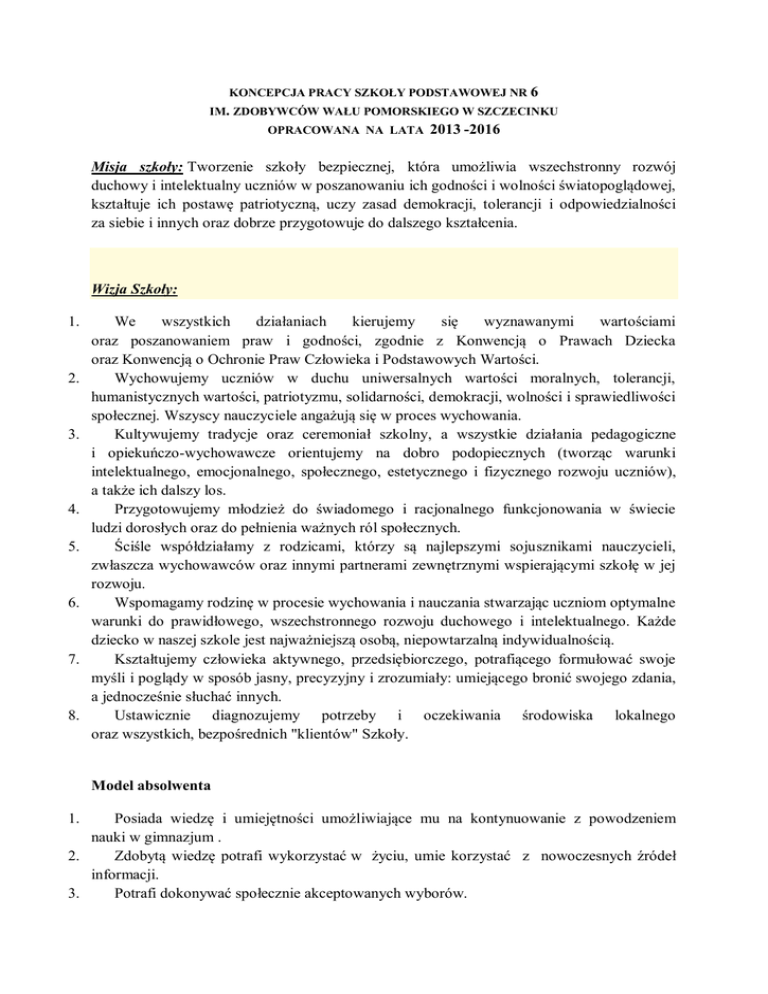 KONCEPCJA PRACY SZKOŁY PODSTAWOWEJ NR 6 IM. ZDOBYWCÓW WAŁU POMORSKIEGO W SZCZECINKU OPRACOWANA NA LATA 2013 -2016 Misja szkoły: Tworzenie szkoły bezpiecznej, która umożliwia wszechstronny rozwój duchowy i intelektualny uczniów w poszanowaniu ich godności i wolności światopoglądowej, kształtuje ich postawę patriotyczną, uczy zasad demokracji, tolerancji i odpowiedzialności za siebie i innych oraz dobrze przygotowuje do dalszego kształcenia. Wizja Szkoły: 1. 2. 3. 4. 5. 6. 7. 8. We wszystkich działaniach kierujemy się wyznawanymi wartościami oraz poszanowaniem praw i godności, zgodnie z Konwencją o Prawach Dziecka oraz Konwencją o Ochronie Praw Człowieka i Podstawowych Wartości. Wychowujemy uczniów w duchu uniwersalnych wartości moralnych, tolerancji, humanistycznych wartości, patriotyzmu, solidarności, demokracji, wolności i sprawiedliwości społecznej. Wszyscy nauczyciele angażują się w proces wychowania. Kultywujemy tradycje oraz ceremoniał szkolny, a wszystkie działania pedagogiczne i opiekuńczo-wychowawcze orientujemy na dobro podopiecznych (tworząc warunki intelektualnego, emocjonalnego, społecznego, estetycznego i fizycznego rozwoju uczniów), a także ich dalszy los. Przygotowujemy młodzież do świadomego i racjonalnego funkcjonowania w świecie ludzi dorosłych oraz do pełnienia ważnych ról społecznych. Ściśle współdziałamy z rodzicami, którzy są najlepszymi sojusznikami nauczycieli, zwłaszcza wychowawców oraz innymi partnerami zewnętrznymi wspierającymi szkołę w jej rozwoju. Wspomagamy rodzinę w procesie wychowania i nauczania stwarzając uczniom optymalne warunki do prawidłowego, wszechstronnego rozwoju duchowego i intelektualnego. Każde dziecko w naszej szkole jest najważniejszą osobą, niepowtarzalną indywidualnością. Kształtujemy człowieka aktywnego, przedsiębiorczego, potrafiącego formułować swoje myśli i poglądy w sposób jasny, precyzyjny i zrozumiały: umiejącego bronić swojego zdania, a jednocześnie słuchać innych. Ustawicznie diagnozujemy potrzeby i oczekiwania środowiska lokalnego oraz wszystkich, bezpośrednich "klientów" Szkoły. Model absolwenta Posiada wiedzę i umiejętności umożliwiające mu na kontynuowanie z powodzeniem nauki w gimnazjum . 2. Zdobytą wiedzę potrafi wykorzystać w życiu, umie korzystać z nowoczesnych źródeł informacji. 3. Potrafi dokonywać społecznie akceptowanych wyborów. 1. Dokonuje samooceny swoich osiągnięć w nauce. Sprawnie posługuje się językiem obcym. Dba o zdrowie, środowisko i bezpieczeństwo. Jest tolerancyjny i wrażliwy na potrzeby innych. Jest emocjonalnie związany z rodziną, szkołą, regionem. Przestrzega zasad dobrych obyczajów. Zna swoje prawa i obowiązki. Ma szacunek dla wartości takich jak dobro, piękno, prawda. Śmiało patrzy w przyszłość 4. 5. 6. 7. 8. 9. 10. 11. 12. Działania zawarte w Koncepcji Pracy Szkoły zmierzają do wyrabiania u uczniów cech potrzebnych w dorosłym życiu na rynku pracy: -umiejętność pracy w zespole, -odpowiedzialność za własny rozwój i bezpieczeństwo, -odpowiedzialność za innych ,środowisko lokalne, ojczyznę, -inicjatywność, -samorządność, -krytyczne myślenie, -kreatywność, -umiejętność oceny ryzyka, -rozwiązywanie problemów, -podejmowanie decyzji, -konstruktywne kierowanie emocjami, -kultura bycia, -umiejętność rozpoznawania własnych predyspozycji i dróg osiągania celu. Najważniejsze założenia Koncepcji Pracy Szkoły na lata 2013-2016 Tworzenie koncepcji pracy szkoły. Oferta edukacyjna. Lp 1 2 Zadanie Koncepcja pracy szkoły została przygotowana, zmodyfikowana w 2013 r. i realizowana we współpracy nauczycieli z uczniami, rodzicami i pracownikami szkoły (analiza SWOT- ocena działań szkoły ,propozycje zmian, model absolwenta, misja, wizja). Koncepcja jest modyfikowana przez organa szkoły w miarę potrzeb, na ostatnim spotkaniu rodziców z nauczycielami każdego roku szkolnego oraz co 3 lata za pomocą analizy SWOT. Motto szkoły brzmi – „Każdy ma szansę na sukces” Szkoła dba o wysoki poziom nauczania oraz rozwijanie zdolności i talentów uczniów na różnego typu zajęciach dodatkowych. W szkole funkcjonuje Program Rozwijania uzdolnień uczniów. Uczniowie prezentują swoje talenty na Festiwalu Talentów w szkole oraz na terenie miasta. Uczniowie osiągają liczne sukcesy w konkursach przedmiotowych na szczeblu miejskim, wojewódzkim i ogólnopolskim. Każdy uczeń osiąga sukcesy na miarę swoich możliwości. Jakości pracy szkoły służy opracowany przez nauczycieli Program Podnoszenia 3 4 5. Efektywności Kształcenia. Oferta edukacyjna szkoły wychodzi naprzeciw zapotrzebowaniu rodziców i uczniów, jest tworzona wspólnie przez wszystkie organa szkolne . Szkoła wykorzystuje możliwości środowiska do rozwijania zainteresowań uczniów, ich wszechstronnego rozwoju. Szkoła oferuje uczniom ,oprócz programowych, dodatkowe innowacyjne zajęcia: m,in. Taniec, fitness gimnastyczny, tenis ziemny, akrobatykę sportową, gry i zabawy, gra na instrumencie, koła j. angielskiego, klasy sportowe o różnorodnych ukierunkowaniach, zajęcia rozwijające umiejętności matematyczne i wiele innych. Uczniowie rozpoczynający naukę w wieku lat 6 otrzymują wsparcie w postaci dodatkowych zajęć wspierających. Realizacja podstawy programowej. Lp 1 Zadania W szkole realizuje się podstawę programową z wykorzystaniem zalecanych warunków i sposobów jej realizacji, m.in. są to : kąciki tematyczne w klasach, wycieczki krajoznawcze i poglądowe, wyjścia do kina, teatru, do muzeum, udział w koncertach muzycznych, preorientacja zawodowa, realizacja projektów, doświadczeń i eksperymentów ,zajęcia z wykorzystaniem audiowizualnych środków nauczania i.in. Wprowadza się w miesiącu czerwcu Trzy Dni Ucznia w celu uzupełnienia, wymienionych wyżej, niezrealizowanych w ciągu roku wymagań oraz dla realizacji zajęć edukacyjnych, których m