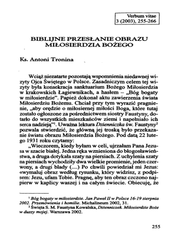 Verbum vitae 3 (2003), 255-266 BIBLIJNE PRZESŁANIE OBRAZU MIŁOSIERDZIA BOŻEGO Ks. Antoni Tronina Wciąż niezaqme pozostają wspomnienia niedawnej wizyty Ojca Świętego w Polsce. Zasadniczym celem tej wizyty była końsekracja sanktuarium Bożego Miłosierdzia w krakowskich Łagiewnikach, a hasłem - "Bóg bogaty w miłosierdzie". Papież dokonał aktu zawierzenia świata Miłosierdziu Bożemu. Chciał przy tym wyrazić pragnienie, "aby orędzie o miłosiernej miłości Boga, które tutaj zostało ogłoszone za pośrednictwem siostry Faustyny, dotarło do wszystkich mieszkańców ziemi i napełniało ich serca nadzieją'' 1 • Uważna lektura Dzienniczka św. Faustyny2 pozwala stwierdzić, że główną jej troską było przekazanie światu obrazu Miłosierdzia Bożego. Pod datą 22 lutego 1931 roku czytamy: "Wieczorem, kiedy byłam w celi, ujrzałam Pana Jezusa w szacie białej. Jedna ręka wzniesiona do błogosławień stwa, a druga dotykała szaty na piersiach. Z uchylenia szaty na piersiach wychodziły dwa wielkie promienie, jeden czerwony, a drugi blady (....) Po chwili powiedział mi Jezus: «wymaluj obraz według rysunku, który widzisz, z podpisem: Jezu, ufam Tobie. Pragnę, aby ten obraz czczono najpierw w kaplicy waszej i na całym świecie. Obiecuję, że Bóg bogaty w miłosierdzie. Jan Paweł II w Polsce 16-19 sierpnia 2002. Przemówienia i homilie. Michalineum 2002, 31 . 2 Święta S. M. Faustyna Kowalska, Dzienniczek. Miłosierdzie Boże w duszy mojej. Warszawa 2002. 1 255 dusza, która czcić będzie ten obraz, nie zginie. Obiecuję także, już tu na ziemi zwycięstwo nad nieprzyjaciółmi, a szczególnie w godzinę śmierci. Ja sam bronić ją będę jako Swej chwały))" (Dz. 47n). Odpowiedzią Świętej na tę wizjęjest wiersz umieszczony na początku Dzienniczka, a zaczynający się taką oto prostą strofką: "0 Miłości Wiekuista, każesz malować obraz swój święty I odsłaniasz nam zdrój miłosierdzia niepojęty, Błogosławisz kto się zbliży do Twych promieni, A dusza czarna w śnieg się zamieni" (Dz. l). Jak dziś wiadomo, odtworzenie wewnętrznej wizji na malarskim płótnie napotykało na liczne trudności. Dopiero po trzech latach (w czetWcu 1934 r.), artysta malarz Eugeniusz Kazimirowski w Wilni~ wykonał obraz Miłosierdzia Bożego według wskazań św. Faustyny. Na widok płótna dobrego przecież malarza, Święta przeżyła wielki ból, iż nie zdołał on oddać piękna rzeczywistej postaci Jezusa. Jezus odpowiedział jej wtedy: ,,nie w piękności farby ani pędz la jest wielkość tego obrazu, ale w łasce Mojej" (Dz. 313). Już po śmierci Faustyny powstały inne wersje obrazu, w oparciu o dzieło Kazimirowskiego. Decyzją kard. Sapiehy, w kaplicy Sióstr w Krakowie został umieszczony obraz wykonany jako wotum w r. 1943 przez Adolfa Hyłę. Kopie tego obrazu, słynącego łaskami, są obecnie najbardziej rozpowszechnione w świecie~ przewyższając sławą nawet późniejsze dzieło Adama Styki (1957). l. SYMBOLIKA STROJU ARCYKAPŁANA W niniejszym opracowaniu chcę się zatrzymać nad teologiczną wymową orędzia o Bożym Miłosierdziu, którego ilustracjąjest obraz przekazany św. Faustynie. W odróżnie niu od klasycznych ikon wschodnich, obraz ten charakteryzuje niezwykła dynamika. Jezus ,,nadchodzi z przyszłości", zgodnie z wizją Apokalipsy św. Jana. Biała suknia do stóp, 256 z rękawami, "przepasana na piersiach złotym pasem" (Ap l, 13), to uroczysty strój arcykapłana w Starym Testamencie. Księga Wyjścia szczegółowo mówi o nakazie Bożym, doty.czącym szat kapłańskich (Wj 28), a następnie o wykonaniu tego nakazu (Wj 39). Strój arcykapłana odróżniał się od sukni zwykłych kapłanów dodatkowymi dystynkcjami; najważ niejsze z nich to ozdobny efod i pektorał. Efod był ozdobiony dwoma szlachetnymi kamieniami (hebr. 'abne-soham, gr. sardion), na których wyryto ,,imiona synów Izraela. Sześć imion na jednym kamieniu i sześć imion pozostałych na kamieniu drugim, według porządku ich urodzenia(....) Te dwa kamienie umieścisz na obu naramiennikach efodu jako kamienie pamięci o synach Izraela. I będzie nosił Aaron ich imiona na obu ramionach dla pamięci przed Jahwe" (Wj 28,9n.12). Drugi ornament, zapożyczony z dawnego stroju królewskiego, stanowił pektorał, wysadzany dwunastu drogimi kamieniami, na których także wyryto imiona pokoleń Izraela. Umieszczone wewnątrz pektorału święte losy (urim i tummim) miały również spą_czywać na sercu Aarona, "gdy będzie wchodził do Miejsca Świętego, na wieczną pamiątkę przed Jahwe" (Wj 28,29). Ani św. Faustyna, ani malarze utrwalający jej wizje na płótnie, nie mogli znać szczegółowo opisu biblijnego. Stary Testament nie był wówczas tak powszechnie znany jak dzisiaj, toteż w Dzienniczku brak zupełnie odniesień biblijnych. Jest to jednak szczegół istotny dla zrozumienia nacisku, z jakim Święta ciągle przywołuje w swych wizjach dwa promienie, wychodzące z Serca Jezusa (Dz. 87. 299. 336. 344. 368 itd.). Aby zrozumieć ich symbolikę, musimy odwołać się do starożytnej tradycji żydowskiej . Rabini łączą mianowicie dwa kamienie efodu arcykapłana z wyrocznią · urim i tummim, umieszczoną w pektorale na sercu Aarona. Gdy ktoś przychodził zasięgnąć rady wyroczni, odpowiedź objawiał blask liter wyrytych na świętych klejnotach. Warto przytoczyć tu świadectwo dziejopisarza żydowskiego z koń ca I w. po Chrystusie, a więc współczesnego Ewangelistom. JózefFlawiusz, opisując w Dawnych dziejach Izraela strój arcykapłański, przytacza taką legendę: 257 "Otóż z owymi drogocennymi kamieniami, które ( ...) arcykapłan nosił na ramionach (...), działo się tak, że ilekroć Bóg uczestniczył w świętych obrzędach, ten (kamień), który spinał szatę na prawym ramieniu, zaczynał błyszczeć: promieniowało zeń światło, widoczne nawet z najdalszej odległości, a którego przedtem zupełnie w nim nie było