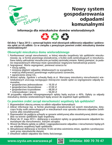 Nowy system gospodarowania odpadami komunalnymi Informacja dla mieszkańców domów wielorodzinnych Od dnia 1 lipca 2013 r. samorząd będzie miał obowiązek odbierania odpadów i pobierania opłat za ich odbiór. Co w związku z powyższym powinni zrobić mieszkańcy domów wielorodzinnych? Obowiązki mieszkańca domu wielorodzinnego 1. Poinformować zarząd nieruchomości, w której mieszka (wspólnoty lub spółdzielni mieszkaniowej), np. w formie pisemnego oświadczenia, o liczbie osób zamieszkujących w mieszkaniu. Dane należy uaktualniać niezwłocznie po każdej zaistniałej zmianie. Należy pamiętać, że podanie nieprawdziwych informacji może spowodować negatywne konsekwencje prawne. 2. Segregować. Warto segregować, ponieważ oznacza to: • niższą opłatę, • mniejszą objętość odpadów składowanych na wysypiskach, • większą efektywność powtórnego wykorzystania surowców, • ograniczenie emisji CO2. 3. Wnosić opłatę. Zgodnie z uchwałą Rady m.st. Warszawy mieszkańcy nieruchomości wielolokalowych uiszczają następujące miesięczne stawki opłat za segregowane odpady komunalne: • gospodarstwo jednoosobowe – 19,50 zł • gospodarstwo dwuosobowe – 37,00 zł • gospodarstwo trzyosobowe – 48,00 zł • czteroosobowe i więcej – 56,00 zł W przypadku odpadów niesegregowanych opłaty będą wyższe o 40%. Opłaty za odpady mieszkańcy domów wielorodzinnych będą wnosić do wspólnot bądź spółdzielni. Co powinien zrobić zarząd nieruchomości wspólnoty lub spółdzielni? 1. Wypowiedzieć obecną umowę na odbiór odpadów komunalnych. 2. Zebrać informacje (np. w formie pisemnego oświadczenia) od swoich mieszkańców, dotyczące liczby osób zamieszkujących w mieszkaniach oraz sposobu zbierania odpadów (selektywnie albo nieselektywnie). 3. Doprowadzić do podjęcia uchwały w sprawie selektywnej albo nieselektywnej zbiórki odpadów na terenie spółdzielni bądź wspólnoty. 4. Złożyć do 31 maja 2013 r. deklarację o wysokości opłaty za gospodarowanie odpadami komunalnymi dla nieruchomości, którymi zarządza. 5. Wnosić do Miasta opłatę za odbiór i zagospodarowanie odpadów z nieruchomości będących we władaniu wspólnoty bądź spółdzielni. 6. A ktualizować deklarację w terminie 14 dni od dnia zaistnienia zmian, zgodnie z przekazywanymi przez mieszkańców danymi. 7. Umożliwić odbiór odpadów bez limitu ilościowego. www.czysta.um.warszawa.pl Infolinia: 800 70 70 47 Jak segregować odpady? Czerwone worki SEGREGOWANE SUCHE TAK: papier, np. gazety, książki, katalogi, zeszyty, torby, worki, kartony i tektura pokryte folią aluminiową, opakowania po mleku, napojach, kosmetykach i środkach czystości; skóra, drobne wyroby, np. paski, torebki, rękawiczki, piłki; drewno, drobne wyroby, np. łyżki, zabawki, klocki, deski kuchenne; tworzywa sztuczne, np. zgniecione butelki po napojach, nakrętki z butelek, długopisy, linijki, opakowania po żywności (jogurtach, serkach, kefirach, margarynach), opakowania po środkach czystości, płyty CD; metal, np. puszki po napojach, konserwach, drobny złom żelazny i metali kolorowych, zabawki, nożyczki, kapsle, folia aluminiowa, garnki. NIE: papier tłusty i zabrudzony (np. opakowania po maśle, margarynie, twarogu), kalki, papier termiczny i faksowy, tapety, artykuły higieniczne (np. waciki, podpaski, pieluchy); opakowania z zawartością, butelki po olejach spożywczych i samochodowych, opakowania po olejach silnikowych, smarach, styropian, guma i produkty z gumy, puszki po farbach, baterie, opakowania po aerozolach, opakowania po środkach chwastobójczych i owadobójczych. PUNKTY SELEKTYWNEGO ZBIERANIA ODPADÓW KOMUNALNYCH TAK: elektrośmieci, np. sprzęt elektryczny i elektroniczny AGD i RTV, komputery, baterie, żarówki, akumulatory; tekstylia, np. ubrania, firanki, narzuty, ręczniki; leki; niebezpieczne odpady, np. farby, lakiery do paznokci, oleje silnikowe, termometry rtęciowe; odpady zielone; odpady budowlane i remontowe, np. wanny, umywalki, deski, płytki, grzejniki. ODPADY ZIELONE TAK: części roślin, np. liście, połamane gałęzie. www.czysta.um.warszawa.pl Zielone worki SZKŁO OPAKOWANIOWE TAK: szklane opakowania, np. butelki i słoiki po napojach, żywności, kosmetykach. NIE: żarówki, lampy neonowe, fluorescencyjne i rtęciowe, termometry rtęciowe, reflektory, szkło stołowe, okularowe, żaroodporne, ekrany i lampy telewizyjne, lustra, szyby samochodowe i okienne, porcelana i ceramika, doniczki. Pojemnik czarny/ciemnoszary albo oznakowany ODPADY ZMIESZANE TAK: wrzucamy wszystko to, czego nie możemy wrzucić do czerwonego i zielonego worka ani do kompostownika, czego nie musimy oddać do punktu selektywnej zbiórki, np. zabrudzone opakowania plastikowe, porcelanę, talerze, opakowania po dezodorantach, styropian opakowaniowy, guma, artykuły higieniczne (patyczki, wata, pieluchy, itp.), potłuczone szyby, szkło stołowe. NIE: odpady niebezpieczne, opakowania po lekach, leki, farby, oleje i ich opakowania, opakowania po środkach ochrony roślin, zużyty sprzęt elektryczny i elektroniczny (np. żarówki, lampy, kineskopy, świetlówki, baterie, akumulatory), sprzęt AGD i RTV, komputery, odpady wielkogabarytowe. ODPADY WIELKOGABARYTOWE TAK: meble, np. stoły, szafki, krzesła, kanapy, sprzęty domowe, np. dywany, wózki dziecięce, materace, rowery, zabawki dużych rozmiarów, duże szyby, lustra. NIE: materiały i odpady budowlane, remontowe, sanitarne, deski drewniane, panele, ramy okienne, drzwi, płoty, wanny, umywalki, muszle toaletowe, spłuczki, grzejniki, płytki, rolety, części samochodowe, motorowery, kosiarki, odpady ogrodowe. Infolinia: 800 70 70 47