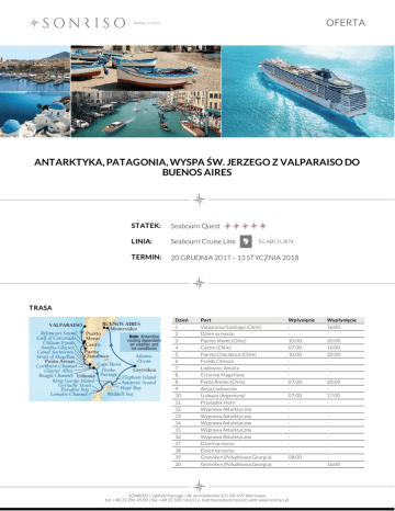 OFERTA ANTARKTYKA, PATAGONIA, WYSPA ŚW. JERZEGO Z VALPARAISO DO BUENOS AIRES STATEK: Seabourn Quest LINIA: Seabourn Cruise Line TERMIN: 20 GRUDNIA 2017 – 13 STYCZNIA 2018 TRASA Dzień 1 2 3 4 5 6 7 8 8 9 10 11 12 13 14 15 16 17 18 19 20 Port Valparaiso/Santiago (Chile) Dzień na morzu Puerto Montt (Chile) Castro (Chile) Puerto Chacabuco (Chile) Fiordy Chilean Lodowiec Amalia Cieśnina Magellana Punta Arenas (Chile) Aleja Lodowców Ushuaia (Argentyna) Przylądek Horn Wyprawa Antarktyczna Wyprawa Antarktyczna Wyprawa Antarktyczna Wyprawa Antarktyczna Wyprawa Antarktyczna Dzień na morzu Dzień na morzu Grytviken (Południowa Georgia) Grytviken (Południowa Georgia) Wpłynięcie 10:00 07:00 10:00 07:00 07:00 08:00 - SONRISO | Lipiński Passage | Al. Jero zo limskie 61 | 00-697 Warszawa tel. +48 22 206 45 00 | fax. +48 22 100 14 61 | e-mail: biuro @so nriso .pl | web: www.so nriso .pl Wypłynięcie 16:00 20:00 16:00 20:00 20:00 17:00 16:00 OFERTA Dzień Port Wpłynięcie Wypłynięcie 21 22 Dzień na morzu Dzień na morzu - - 23 Dzień na morzu - - 24 Montevideo (Urugwaj) 12:00 19:00 25 Buenos Aires (Argentyna) 07:00 - CENA Typ kabiny Cena z osobę Seabourn Suite od 17 500 EUR Veranda Suite od 20 000 EUR Penthouse Suite od 33 500 EUR CENA ZAWIERA DOTATKOWE OPŁATY zakwaterowanie w 2-os. apartamencie wybranej kategorii pełne wyżywienie: 3 posiłki, przekąski między posiłakmi, bufet o północy open bar: wybrane wina i szampany, alkohole premium, różnorodne kawy i herbaty, wody mineralne butelkowane, napoje bezalkoholowe oraz soki dostępne w barach i restauracjach korzystanie z minibaru w apartamencie serwis bagażowy podczas wejścia i zejścia ze statku obsługa kamerdynerska 24 godzinny serwis kabinowy korzystanie z urządzeń sportowo-rekreacyjnych dostępnych na pokładzie (baseny, jacuzzi, boiska sportowe, kluby dla dzieci i młodzieży itp.) udział we wszystkich imprezach organizowanych na pokładzie (przedstawienia, pokazy, aukcje, animacje i inne) opłaty serwisowe (napiwki) dla obsługi statku obowiązkowe opłaty portowe dojazd/przelot do portu rozpoczęcia i zakończenia rejsu transfery (lotnisko - port - lotnisko) ewentualne noclegi przed lub po rejsie wycieczki fakultatywne korzystanie z usług typu: SPA, salon piękności, pralnia itp. wydatki osobiste tj. zakupy w butikach, internet, kasyno itp. obowiązkowe ubezpieczenie turystyczne koszt wymaganych wiz ewentualna opłata paliwowa (linia w momencie wzrotu cen ropy zastrzega sobie prawo do dodania oplaty paliwowej do każdej rezerwacji) Na życzenie świadczymy dodatkowo usługi: rezerwacje hotelowe na całym świecie rezerwacje biletów lotniczych, trasferów oraz parkingu w porcie rezerwacje wycieczek fakultatywnych i innych atrakcji SONRISO | Lipiński Passage | Al. Jero zo limskie 61 | 00-697 Warszawa tel. +48 22 206 45 00 | fax. +48 22 100 14 61 | e-mail: biuro @so nriso .pl | web: www.so nriso .pl