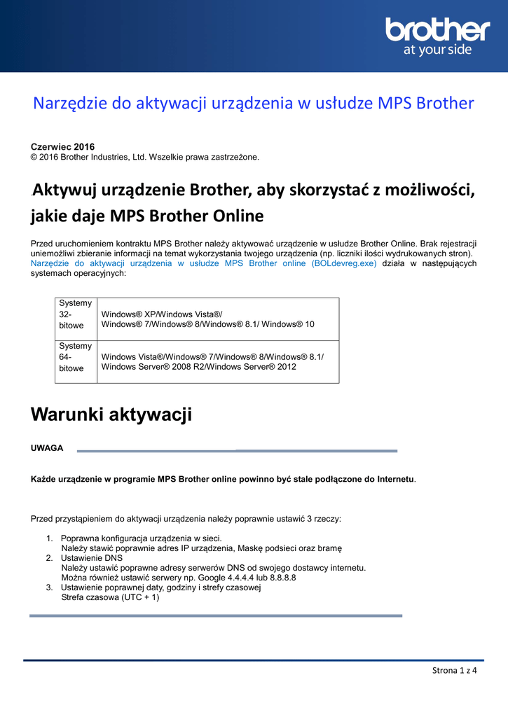 Narzędzie do aktywacji urządzenia w usłudze MPS Brother Czerwiec 2016 © 2016 Brother Industries, Ltd. Wszelkie prawa zastrzeżone. Aktywuj urządzenie Brother, aby skorzystać z możliwości, jakie daje MPS Brother Online . Przed uruchomieniem kontraktu MPS Brother należy aktywować urządzenie w usłudze Brother Online. Brak rejestracji uniemożliwi zbieranie informacji na temat wykorzystania twojego urządzenia (np. liczniki ilości wydrukowanych stron). Narzędzie do aktywacji urządzenia w usłudze MPS Brother online (BOLdevreg.exe) działa w następujących systemach operacyjnych: Systemy 32bitowe Windows® XP/Windows Vista®/ Windows® 7/Windows® 8/Windows® 8.1/ Windows® 10 Systemy 64bitowe Windows Vista®/Windows® 7/Windows® 8/Windows® 8.1/ Windows Server® 2008 R2/Windows Server® 2012 Warunki aktywacji UWAGA Każde urządzenie w programie MPS Brother online powinno być stale podłączone do Internetu. Przed przystąpieniem do aktywacji urządzenia należy poprawnie ustawić 3 rzeczy: 1. Poprawna konfiguracja urządzenia w sieci. Należy stawić poprawnie adres IP urządzenia, Maskę podsieci oraz bramę 2. Ustawienie DNS Należy ustawić poprawne adresy serwerów DNS od swojego dostawcy internetu. Można również ustawić serwery np. Google 4.4.4.4 lub 8.8.8.8 3. Ustawienie poprawnej daty, godziny i strefy czasowej Strefa czasowa (UTC + 1) Strona 1 z 4 Aktywacja 1. 2. 3. 4. Pobierz program ze strony : http://www.brother.pl/mps-aktywator Uruchom BOLdevreg.exe. Zaznacz jedno lub więcej niezarejestrowanych urządzeń. Kliknij Register (Zarejestruj). 5. Skopiuj i wklej kod PIN wygenerowany na stronie Brother Online lub otrzymany pocztą elektroniczną do pola PIN Code (Kod PIN). Upewnij się, że ustawienia daty i godziny oraz ustawienia serwera Proxy są prawidłowe, a następnie kliknij Register (Zarejestruj). Strona 2 z 4 6. Sprawdź czy urządzenie zostało pomyślnie zarejestrowane. Uwagi końcowe UWAGA 1 Wprowadź wewnętrzne hasło administratora urządzenia, a następnie po pojawieniu się komunikatu przedstawionego poniżej, kliknij OK. UWAGA 2 Jeśli urządzenia, które chcesz dodać nie ma na liście, naciśnij klawisz Insert na klawiaturze komputera, aby ręcznie określić adres IP lub zakres adresów IP. Aby określić zakres adresów IP, pomiędzy adresami IP należy wstawić myślnik, na przykład 10.244.44.1-10.244.44.255. Strona 3 z 4 UWAGA 3: Aby zresetować kod PIN, skontaktuj się z lokalnym oddziałem firmy Brother. Komunikat błędu Działanie Name resolution failed (Nie udało się rozpoznać nazwy) Upewnij się, że ustawienia serwera DNS twojego urządzenia są prawidłowe. Unable to connect to Brother Online. Please check your network settings. (Nie można połączyć się z Brother Online. Proszę sprawdzić swoje ustawienia sieciowe). Sprawdź ustawienia sieciowe twojego urządzenia lub ustawienia serwera proxy. Zarejestruj więcej urządzeń Można zaznaczyć więcej urządzeń jednocześnie. 1. 2. Kliknij dwukrotnie BOLdevreg.exe. Kliknij Select all unregistered (Zaznacz wszystkie niezarejestrowane urządzenia). 3. Kliknij Register (Zarejestruj). (zobacz Kroki 3 - 5 w poprzednim temacie.) Strona 4 z 4