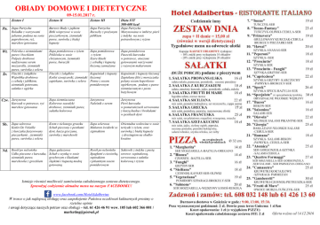 OBIADY DOMOWE I DIETETYCZNE 09-15.01.2017 r. Zestaw I Zestaw II Zestaw III Dieta FIT 500-600 kcal Pn. Zupa Parzycha Roladka z warzywami julienne podana na sosie paprykowym, ryŜ, marchew gotowana Barszcz Biały z jajkiem Bitki wieprzowe w sosie pieczarkowym, ziemniaki puree, surówka z białej kapusty Zupa Parzycha Racuchy z praŜonym jabłkiem Zupa Parzycha Marynowana w imbirze pierś z indyka na sosie potrawkowym z ryŜem Wt. Polewka z ziemniakami puree i boczkiem Pulpety drobiowe nadziewane serem mozzarella, ziemniaki puree, surówka z selera Flaczki z Ŝołądków Wątróbka drobiowa z cebulą i jabłkiem, ziemniaki gotowane, sałatka z ogórka Zupa pomidorowa z ryŜem Peklówka w sosie chrzanowym, ziemniaki puree, buraczki Zupa pomidorowa z ryŜem Szare kluski z cebulką i kapustą kiszoną zasmaŜana Zupa pomidorowa Paseczki kurczaka w potrawce, otoczone gotowanymi warzywami z razowym makaronem Śr. Czw. Jarzynowa Kurczak w potrawce, ryŜ marchew gotowana Sb. Zupa selerowa Kotlet De Volaille z kurczaka faszerowany pieczarkami , ziemniaki puree, surówka z selera Nd. Rosół po nelsońsku Flaczki z Ŝołądków Kapuśniak z kapusty Kotlet szwajcarski, ziemniaki kiszonej zapiekane, surówka z selera Penne z sosem pomidorowym Kapuśniak z kapusty kiszonej Zapiekany filet z morszczuka polany sosem koperkowoogórkowym, podany z puree ziemniaczanym z pesto bazyliowym Zupa ziemniaczana Kolorowe szaszłyki drobiowe, ziemniaki puree, sałatka kolorowa Jarzynowa Naleśnik z serem Jarzynowa Pierś kurczaka w pomarańczach serwowana z kaszą kuskus i brokułami w pestkach dyni Krem z zielonego groszku Schab pieczony z pestkami dyni, kasza gryczana, surówka z marchewki Zupa selerowa Makaron świderki ze szpinakiem Orientalna wołowina w sosie teriyaki z ryŜem, oraz surówką z białej kapusty z dresingiem na słodkokwaśno Rosół po nelsońsku Spaghetti z cieciorką, szpinakiem i pikantnym sosem pomidorowym Sakiewki z indyka z pastą serowo- szpinakową, serwowana z sałatka kolorową i ryŜem Zupa gulaszowa Udko pieczone z kurczaka, Schab z szynką w sosie ziemniaki puree, grzybowym z kluskami marchewka z groszkiem śląskimi i kapustą modrą gotowaną Istnieje równieŜ moŜliwość zamówienia całodziennego zestawu dietetycznego. Sprawdzaj codziennie aktualne menu na naszym FACEBOOKU! www.facebook.com/HotelAdalbertus W trosce o jak najlepszą obsługę oraz zaspokojenie Państwa oczekiwań kulinarnych prosimy o rzetelne opinie i uwagi dotyczące naszych potraw oraz obsługi – tel. 61 426 46 91 wew. 105 lub 602 366 001 / [email protected]