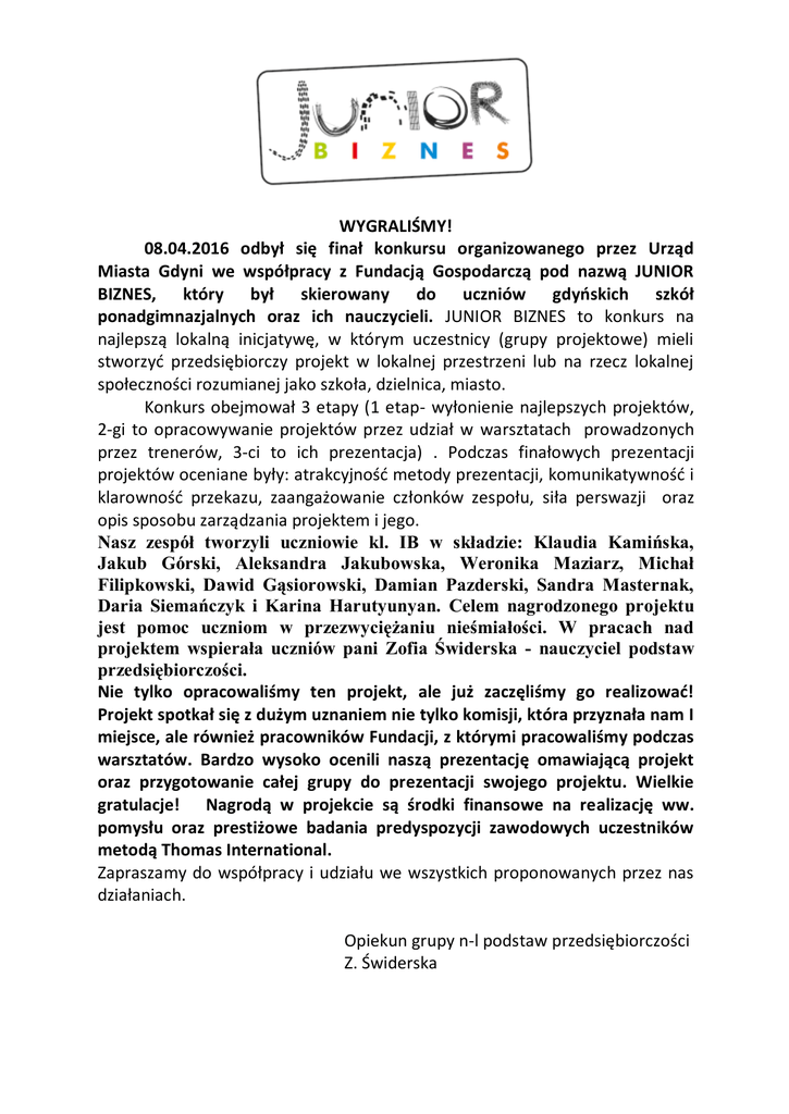 WYGRALIŚMY! 08.04.2016 odbył się finał konkursu organizowanego przez Urząd Miasta Gdyni we współpracy z Fundacją Gospodarczą pod nazwą JUNIOR BIZNES, który był skierowany do uczniów gdyoskich szkół ponadgimnazjalnych oraz ich nauczycieli. JUNIOR BIZNES to konkurs na najlepszą lokalną inicjatywę, w którym uczestnicy (grupy projektowe) mieli stworzyd przedsiębiorczy projekt w lokalnej przestrzeni lub na rzecz lokalnej społeczności rozumianej jako szkoła, dzielnica, miasto. Konkurs obejmował 3 etapy (1 etap- wyłonienie najlepszych projektów, 2-gi to opracowywanie projektów przez udział w warsztatach prowadzonych przez trenerów, 3-ci to ich prezentacja) . Podczas finałowych prezentacji projektów oceniane były: atrakcyjnośd metody prezentacji, komunikatywnośd i klarownośd przekazu, zaangażowanie członków zespołu, siła perswazji oraz opis sposobu zarządzania projektem i jego. Nasz zespół tworzyli uczniowie kl. IB w składzie: Klaudia Kamińska, Jakub Górski, Aleksandra Jakubowska, Weronika Maziarz, Michał Filipkowski, Dawid Gąsiorowski, Damian Pazderski, Sandra Masternak, Daria Siemańczyk i Karina Harutyunyan. Celem nagrodzonego projektu jest pomoc uczniom w przezwyciężaniu nieśmiałości. W pracach nad projektem wspierała uczniów pani Zofia Świderska - nauczyciel podstaw przedsiębiorczości. Nie tylko opracowaliśmy ten projekt, ale już zaczęliśmy go realizowad! Projekt spotkał się z dużym uznaniem nie tylko komisji, która przyznała nam I miejsce, ale również pracowników Fundacji, z którymi pracowaliśmy podczas warsztatów. Bardzo wysoko ocenili naszą prezentację omawiającą projekt oraz przygotowanie całej grupy do prezentacji swojego projektu. Wielkie gratulacje! Nagrodą w projekcie są środki finansowe na realizację ww. pomysłu oraz prestiżowe badania predyspozycji zawodowych uczestników metodą Thomas International. Zapraszamy do współpracy i udziału we wszystkich proponowanych przez nas działaniach. Opiekun grupy n-l podstaw przedsiębiorczości Z. Świderska Informacje zamieszczone są na stronie: http://www.gdyniaprzedsiebiorcza.pl/gdynia-przedsiebiorcza/junior-biznes/ o wynikach konkursu: http://www.gdynia.pl/wydarzenia/70_111404.html Znamy zwycięzców konkursu JUNIOR BIZNES 2016-04-08 Znamy zwycięzców konkursu JUNIOR BIZNES. Finał odbył się w piątek 8 kwietnia 2016 w Gdyńskim Inkubatorze Przedsiębiorczości z udziałem wiceprezydent Katarzyny Gruszeckiej-Spychały, przedstawiciela Pomorskiej Specjalnej Strefy Ekonomicznej, partnerów Konkursu - Fundacji Gospodarczej i firmy Thomson Reuters, dyrektorów szkół oraz zaproszonych gości. W pierwszej części wydarzenia sześć zespołów przedstawiało swoje przedsiębiorcze pomysły wykorzystując wiedzę i doświadczenie zdobyte w trakcie wcześniejszych warsztatów. Podczas prezentacji oceniano atrakcyjność metody prezentacji, komunikatywność i klarowność przekazu, zaangażowanie członków zespołu, siłę perswazji oraz opis sposobu zarządzania projektem i jego realizacji. Wszystkie grupy zyskały duże uznanie jurorów. Poziom prezentacji był wysoce wyrównany. Zwycięzcą konkursu JUNIOR BIZNES za projekt „Cykl warsztatów dla uczniów" został zespół V Liceum Ogólnokształcącego w składzie: Klaudia Kamińska, Jakub Górski, Aleksandra Jakubowska, Weronika Maziarz, Michał Filipkowski, Dawid Gąsiorowski, Damian Pazdreski, Sandra Masternak, Daria Siemańczyk i Karina Harutyunyan. Celem nagrodzonego projektu jest pomoc uczniom w przezwyciężaniu nieśmiałości. W pracach nad projektem wspierała uczniów pani Zofia Świderska - nauczyciel podstaw przedsiębiorczości. II miejsce zajęły cztery uczennice X Liceum Ogólnokształcącego (Marta Raszczyk, Eliza Fronszczyk, Anna-Maria Trendel i Natalia Michalak), które poprzez projekt „Dream Navigation" próbują pomóc rówieśnikom w odkrywaniu ich pasji życiowych. Laureatki wspierała pani Joanna Galińska opiekun grupy. III miejsce z projektem „Podziel się z innymi tym, co już Ci się znudziło" zajęły: Natalia Dworakowska, Nikola Złotek, Patrycja Keslinke i Patrycja Grot - uczennice Zespołu Szkół Administracyjno-Ekonomicznych. Projekt polegający na organizacji giełdy odzieży połączonej z tematycznymi warsztatami pilotowała nauczycie ZSAE - pani Maria Małkowska. Pozostali laureaci Konkursu JUNIOR BIZNES to uczniowie: • Technikum Transportowego (Anna Gajzler, Sandra Kuklińska, Iwona Pyszka i Norman Dorana) za projekt „Wdrażanie osób starszych w nowoczesną technologię" • Zespołu Szkół Administracyjno-Ekonomicznych (Oliwia Mrówka, Aleksandra Michalkiewicz, Sebastian Pranga, Weronika Miotk, Sabina Uzdrowska, Klaudia Krause i Aleksandra Dopke) za projekt „Klub gier" • IX Liceum Ogólnokształcące (Roksana Bona, Paulina Henig, Kacper Polkowski, Emanuel Muszyński, Lila Siluta oraz Marcin Snopek) za projekt „Happy-scientific room" Zwycięzcy trzech pierwszych miejsc otrzymali nagrodę finansową - po 1.000 zł na realizację swoich pomysłów. Dodatkowo wszyscy finaliści mają także możliwość wzięcia udziału w prestiżowych badaniach predyspozycji zawodowych metodą Thomas International. Dziękujemy wszystkim za zainteresowanie, włożony wysiłek i pracę. Gratulujemy i życzymy kolejnych świetnych pomysłów i determinacji w ich realizowaniu. fot. Monika Antkowiak