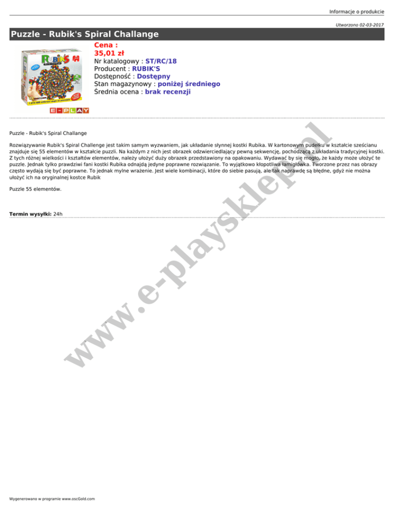 Informacje o produkcie Utworzono 02-03-2017 Puzzle - Rubik's Spiral Challange Cena : 35,01 zł Nr katalogowy : ST/RC/18 Producent : RUBIK'S Dostępność : Dostępny Stan magazynowy : poniżej średniego Średnia ocena : brak recenzji p. pl Puzzle - Rubik's Spiral Challange ay sk le Rozwiązywanie Rubik's Spiral Challenge jest takim samym wyzwaniem, jak układanie słynnej kostki Rubika. W kartonowym pudełku w kształcie sześcianu znajduje się 55 elementów w kształcie puzzli. Na każdym z nich jest obrazek odzwierciedlający pewną sekwencję, pochodzącą z układania tradycyjnej kostki. Z tych różnej wielkości i kształtów elementów, należy ułożyć duży obrazek przedstawiony na opakowaniu. Wydawać by się mogło, że każdy może ułożyć te puzzle. Jednak tylko prawdziwi fani kostki Rubika odnajdą jedyne poprawne rozwiązanie. To wyjątkowo kłopotliwa łamigłówka. Tworzone przez nas obrazy często wydają się być poprawne. To jednak mylne wrażenie. Jest wiele kombinacji, które do siebie pasują, ale tak naprawdę są błędne, gdyż nie można ułożyć ich na oryginalnej kostce Rubik Puzzle 55 elementów. w w w .e - pl Termin wysyłki: 24h Wygenerowano w programie www.oscGold.com