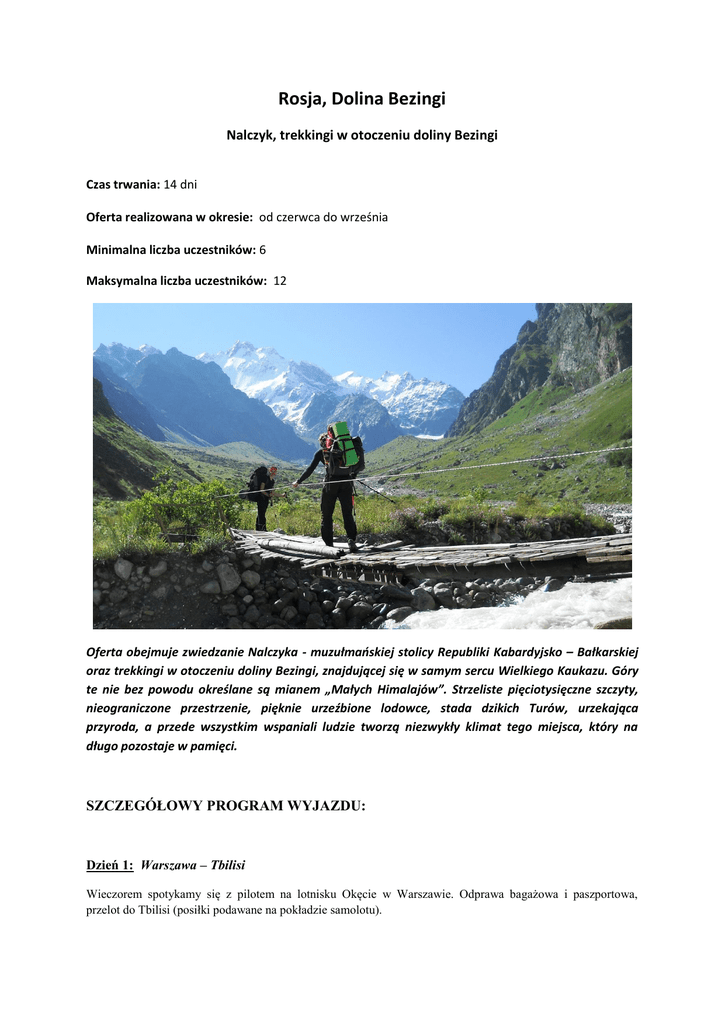 Rosja, Dolina Bezingi Nalczyk, trekkingi w otoczeniu doliny Bezingi Czas trwania: 14 dni Oferta realizowana w okresie: od czerwca do września Minimalna liczba uczestników: 6 Maksymalna liczba uczestników: 12 Oferta obejmuje zwiedzanie Nalczyka - muzułmańskiej stolicy Republiki Kabardyjsko – Bałkarskiej oraz trekkingi w otoczeniu doliny Bezingi, znajdującej się w samym sercu Wielkiego Kaukazu. Góry te nie bez powodu określane są mianem „Małych Himalajów”. Strzeliste pięciotysięczne szczyty, nieograniczone przestrzenie, pięknie urzeźbione lodowce, stada dzikich Turów, urzekająca przyroda, a przede wszystkim wspaniali ludzie tworzą niezwykły klimat tego miejsca, który na długo pozostaje w pamięci. SZCZEGÓŁOWY PROGRAM WYJAZDU: Dzień 1: Warszawa – Tbilisi Wieczorem spotykamy się z pilotem na lotnisku Okęcie w Warszawie. Odprawa bagażowa i paszportowa, przelot do Tbilisi (posiłki podawane na pokładzie samolotu). Dzień 2: Tbilisi - Nalczyk Przylot do Tbilisi wczesnym rankiem. Wynajętymi samochodami udajemy się do Nalczyka. Trasa biegnie Gruzińską Drogą Wojenną, czyli malowniczą trasą przecinającą pasmo górskie Wielkiego Kaukazu. Zakwaterowanie w hotelu. Krótki instruktarz na temat panujących norm i obyczajów oraz charakterystyki górskiego rejonu Kaukazu. Czas wolny. Dzień 3: Nalczyk – baza w dolinie Bezingi Śniadanie w hotelu. Zwiedzanie miasta oraz zakupy na targowisku, które oferuje niezliczoną ilość tradycyjnych wyrobów a także pysznych warzyw i owoców. Transfer do bazy alpinistycznej Bezingi. Noclegi w bazie w dwu osobowych pokojach w różnym standardzie (zależnie od dostępności w dniu rezerwacji). Dzień 4: Aklimatyzacja w bazie Śniadanie w bazowej stołówce (będziemy tu jadać także obiady i kolacje). Spacer do położonego nieopodal bazy wodospadu. Pozostała część dnia przeznaczona na szkolenia i odpoczynek. Dzień 5: Baza – biwak na polanie pod zboczami Piku Brno (4-5 h) Śniadanie w stołówce. Wyruszamy wzdłuż zboczy Piku Brno, następnie w górę lewobrzeżną moreną lodowca Miżirgi. Docieramy do rozległej polany położonej za moreną boczną. Tutaj spędzimy noc w namiotach, zapewne w towarzystwie licznie wypasających się tutaj turów kaukaskich. Po wspięciu się na szczyt moreny podziwiać można piękną panoramę lodowca Miżirgi. Dzień 6: Biwak na polanie – Kursancki Biwak (2-3 h) Tego dnia czeka nas krótkie ale strome podejście do jeziora położonego u stóp niewielkiego lodowca opadającego ze zboczy szczytu Misses Tau. Bardzo zaciszne miejsce. Jeśli starczy sił wybierzemy się na dalszy spacer na lekko. Noc spędzimy w namiotach na platformach nieopodal brzegu jeziora. Dzień 7: Kursancki Biwak – Baza (4-5 h) Powrót do bazy drogą podejścia. Reszta dnia przeznaczona zostanie na odpoczynek i porządki. Dzień 8: Odpoczynek w bazie Poza odpoczynkiem, część dnia przeznaczymy na krótkie szkolenia oraz wspinaczkę skalną dla chętnych. Dzień 9: Baza – Baran Kosz (5-6 h) Po śniadaniu w stołówce ruszamy w górę doliną lodowca Bezingi aż dotrzemy do czoła lodowca. Stąd zacznie się kluczenie po największym lodowcu w górach Kaukazu. Początkowo szlak prowadzi orograficznie prawą stroną lodowca i stopniowo przechodzi na przeciwległą morenę. Po jej przejściu dotrzemy do dużej polany zwanej Baran Kosz. Nocleg w namiotach w pobliżu okresowego jeziorka. Dzień 10: Baran Kosz – Dżangi Kosz (5-6 h) Schodzimy na lodowiec do jego moreny środkowej i idziemy w górę aż do załamania lodowca. W tym miejscu stajemy przed imponującą ścianą Bezingi, czyli 13 kilometrową granią z kilkoma szczytami powyżej pięciu tysięcy, która daje pokaz ogromu przyrody. Załamanie lodowca omijamy zboczami szczytu Siemienowskiego. Po ok. dwóch godzinach marszu wysoką prawobrzeżną moreną docieramy do chatki Dżangi Kosz. Noc spędzamy w namiotach na platformach w pobliżu chatki. Dzień 11: Dżangi Kosz – Baza (6-7 h) Zejście do bazy. Pozostała część dnia przeznaczona na odpoczynek. Dzień:12: Dzień rezerwowy Dzień zapasowy na wypadek niepogody. Może zostać zagospodarowany na szkolenia oraz zajęcia ze wspinaczki bądź spacery w otoczeniu bazy. Pożegnalna kolacja. Dzień 13: Baza Bezingi - Tbilisi Powrót do Nalczyka. Przesiadka do wynajętych samochodów, którymi udamy się do Tbilisi - stolicy Gruzji. Zakwaterowanie w hotelu. Popołudniowe zwiedzanie miasta. Dzień 14: Tbilisi – Warszawa Wczesnym rankiem transfer na lotnisko i bezpośrednim lotem wracamy do Warszawy.