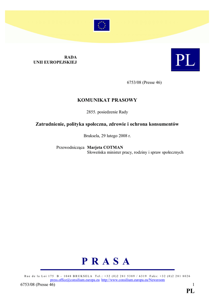 PL RADA UNII EUROPEJSKIEJ 6753/08 (Presse 46) KOMUNIKAT PRASOWY 2855. posiedzenie Rady Zatrudnienie, polityka społeczna, zdrowie i ochrona konsumentów Bruksela, 29 lutego 2008 r. Przewodnicząca Marjeta COTMAN Słoweńska minister pracy, rodziny i spraw społecznych PRASA Rue de la Loi 175 B – 1048 BRUKSELA T el.: +32 (0)2 281 5389 / 6319 Fak s: +32 (0 )2 281 8026 [email protected] http://www.consilium.europa.eu/Newsroom 6753/08 (Presse 46) 1 PL 29.II.2008 Główne wyniki posiedzenia Rady Rada przeprowadziła debatę na temat kierunków polityki zatrudnienia, polityki społecznej i polityki w dziedzinie równości płci i przyjęła główne przesłania, które mają zostać uwzględnione w konkluzjach z wiosennego posiedzenia Rady Europejskiej. Rada wypracowała podejście ogólne co do wytycznych w sprawie polityki zatrudnienia państw członkowskich oraz osiągnęła porozumienie polityczne co do zalecenia Rady na rok 2008 i co do rezolucji w sprawie sytuacji osób niepełnosprawnych w Unii Europejskiej. 6753/08 (Presse 46) 2 PL 29.II.2008 SPIS TREŚCI1 UCZESTNICY .............................................................................................................................. 4 OMAWIANE PUNKTY PRZYGOTOWANIA DO WIOSENNEGO POSIEDZENIA RADY EUROPEJSKIEJ ................... 6 Komunikat Komisji „Utrzymanie tempa zmian”: Sprawozdanie strategiczne na temat odnowionej strategii lizbońskiej na rzecz wzrostu gospodarczego i zatrudnienia: rozpoczęcie nowego etapu (2008–2010) ........................................................................................................... 10 Wspólne sprawozdanie o zatrudnieniu (2007/2008) i wspólne sprawozdanie o ochronie socjalnej i integracji społecznej (2008).......................................................................................... 11 Zintegrowane wytyczne w dziedzinie wzrostu gospodarczego i zatrudnienia (2008–2010): projekt decyzji Rady dotyczącej wytycznych w sprawie polityki zatrudnienia państw członkowskich .............................................................................................................................. 13 Zalecenie Rady w sprawie planowanej na 2008 rok aktualizacji ogólnych wytycznych dotyczących polityki gospodarczej państw członkowskich i Wspólnoty oraz w sprawie realizacji polityki zatrudnienia przez państwa członkowskie ......................................................... 14 Sprawozdanie Komisji na temat równości kobiet i męŜczyzn (2008) ............................................. 14 PRZYGOTOWANIA DO TRÓJSTRONNEGO SZCZYTU SPOŁECZNEGO ............................. 15 PRZEGLĄD JEDNOLITEGO RYNKU........................................................................................ 16 REZOLUCJA W SPRAWIE SYTUACJI OSÓB NIEPEŁNOSPRAWNYCH W UNII EUROPEJSKIEJ........................................................................................................................... 17 SPRAWY RÓśNE........................................................................................................................ 18 INNE ZATWIERDZONE PUNKTY WSPÓLNA POLITYKA ZAGRANICZNA I BEZPIECZEŃSTWA – Demokratyczna Republika Konga – środki ograniczające.................................................................................19 STATYSTYKA – 1 Wolne miejsca pracy we Wspólnocie ...............................................................................................................19 JeŜeli deklaracje, konkluzje lub rezolucje zostały przez Radę formalnie przyjęte, jest to zaznaczone w tytule danego punktu, a tekst jest umieszczony w cudzysłowie. Dokumenty, do których odesłano w tekście, są dostępne na internetowej stronie Rady (http:/www.consilium.europa.eu). Gwiazdką oznaczono akty przyjęte wraz z oświadczeniami do protokołu Rady przeznaczonymi do wiadomości publicznej; oświadczenia te moŜna znaleźć na wyŜej wspomnianej internetowej stronie Rady lub uzyskać z biura prasowego. 6753/08 (Presse 46) 3 PL 29.II.2008 UCZESTNICY Rządy państw członkowskich oraz Komisja Europejska były reprezentowane przez następujące osoby: Belgia: Didier SEEUWS zastępca stałego przedstawiciela Bułgaria: Emilija Radkowa MASŁAROWA Dimityr DIMITROW minister pracy i polityki społecznej wiceminister pracy i polityki społecznej Czechy: Petr NECZAS wicepremier, minister pracy i spraw społecznych Dania: Claus Hjort FREDERIKSEN minister pracy Niemcy: Klaus BRANDNER Estonia: Maret MARIPUU Irlandia: Billy KELLEHER Grecja: Sofia KALANTZAKOU Hiszpania: Jesús CALDERA SÁNCHEZ-CAPITÁN Gerardo CAMPS parlamentarny sekretarz stanu, Federalne Ministerstwo Pracy i Spraw Społecznych minister spraw społecznych wiceminister, Ministerstwo ds. Przedsiębiorstw, Handlu i Zatrudnienia (szczególnie odpowiedzialny za sprawy pracy) sekretarz stanu ds. zatrudnienia i ochrony socjalnej minister pracy i spraw społecznych minister spraw gospodarczych, finansów i zatrudnienia i drugi wiceprzewodniczący rządu Autonomicznej Wspólnoty Walencji Francja: Xavier BERTRAND minister pracy, stosunków pracy i solidarności Włochy: Cesare DAMIANO minister pracy i polityki społecznej Cypr: Leandros NICOLAIDES p.o. stałego sekretarza, Ministerstwo Pracy i Ubezpieczeń Społecznych Łotwa: Iveta PURNE Ingus ALLIKS minister opieki społecznej podsekretarz stanu, Ministerstwo Opieki Społecznej Litwa: Vilija BLINKEVIČIŪTö minister zabezpieczenia społecznego i pracy Luksemburg: François BILTGEN minister pracy i zatrudnienia, minister kultury, minister szkolnictwa wyŜszego i badań naukowych, minister ds. wyznań Węgry: Gábor SIMON sekretarz stanu, Ministerstwo Spraw Społecznych i Pracy Malta: Theresa CUTAJAR zastępca stałego przedstawiciela 6753/08 (Presse 46) 4 PL 29.II.2008 Niderlandy: Peter W. KOK Austria: Erwin BUCHINGER Christine MAREK Polska: Agnieszka CHŁOŃ-DOMIŃCZAK Portugalia: José VIEIRA DA SILVA Rumunia: Denisa-Oana PĂTRAŞCU Słowenia: Ma
