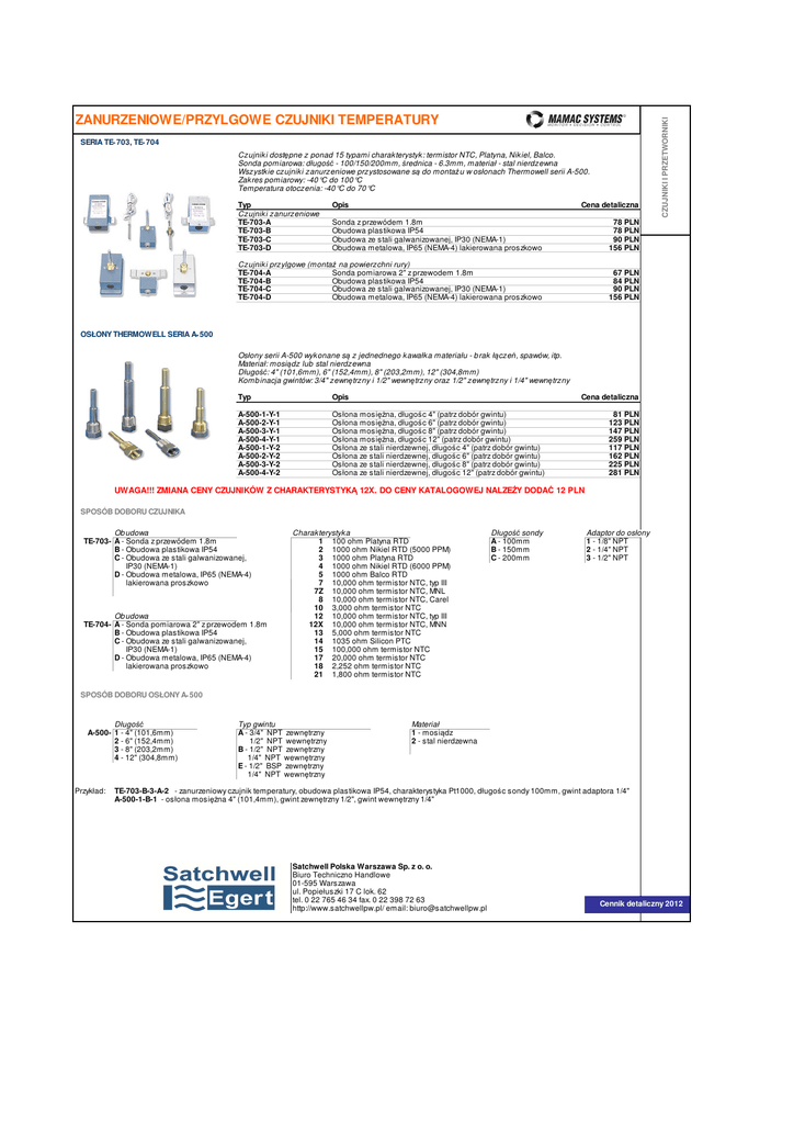 SERIA TE‐ 703, TE‐ 704 Czujniki dostępne z ponad 15 typami charakterystyk: termistor NTC, Platyna, Nikiel, Balco. Sonda pomiarowa: długość - 100/150/200mm, średnica - 6.3mm, materiał - stal nierdzewna Wszystkie czujniki zanurzeniowe przystosowane są do montażu w osłonach Thermowell serii A-500. Zakres pomiarowy: -40°C do 100°C Temperatura otoczenia: -40°C do 70°C Typ Czujniki zanurzeniowe TE-703-A TE-703-B TE-703-C TE-703-D Opis Cena detaliczna Sonda z przewódem 1.8m Obudowa plastikowa IP54 Obudowa ze stali galwanizowanej, IP30 (NEMA-1) Obudowa metalowa, IP65 (NEMA-4) lakierowana proszkowo 78 PLN 78 PLN 90 PLN 156 PLN Czujniki przylgowe (montaż na powierzchni rury) TE-704-A Sonda pomiarowa 2" z przewodem 1.8m TE-704-B Obudowa plastikowa IP54 TE-704-C Obudowa ze stali galwanizowanej, IP30 (NEMA-1) TE-704-D Obudowa metalowa, IP65 (NEMA-4) lakierowana proszkowo 67 PLN 84 PLN 90 PLN 156 PLN CZUJNIKI I PRZETWORNIKI ZANURZENIOWE/PRZYLGOWE CZUJNIKI TEMPERATURY OSŁONY THERMOWELL SERIA A‐ 500 Osłony serii A-500 wykonane są z jednednego kawałka materiału - b rak łączeń, spawów, itp. Materiał: mosiądz lub stal nierdzewna Długość: 4" (101,6mm), 6" (152,4mm), 8" (203,2mm), 12" (304,8mm) Komb inacja gwintów: 3/4" zewnętrzny i 1/2" wewnętrzny oraz 1/2" zewnętrzny i 1/4" wewnętrzny Typ Opis Cena detaliczna A-500-1-Y-1 A-500-2-Y-1 A-500-3-Y-1 A-500-4-Y-1 A-500-1-Y-2 A-500-2-Y-2 A-500-3-Y-2 A-500-4-Y-2 Osłona mosiężna, długośc 4" (patrz dobór gwintu) Osłona mosiężna, długośc 6" (patrz dobór gwintu) Osłona mosiężna, długośc 8" (patrz dobór gwintu) Osłona mosiężna, długośc 12" (patrz dobór gwintu) Osłona ze stali nierdzewnej, długośc 4" (patrz dobór gwintu) Osłona ze stali nierdzewnej, długośc 6" (patrz dobór gwintu) Osłona ze stali nierdzewnej, długośc 8" (patrz dobór gwintu) Osłona ze stali nierdzewnej, długośc 12" (patrz dobór gwintu) 81 PLN 123 PLN 147 PLN 259 PLN 117 PLN 162 PLN 225 PLN 281 PLN UWAGA!!! ZMIANA CENY CZUJNIKÓW Z CHARAKTERYSTYKĄ 12X. DO CENY KATALOGOWEJ NALZEŻY DODAĆ 12 PLN SPOSÓB DOBORU CZUJNIKA Ob udowa TE-703- A - Sonda z przewódem 1.8m B - Obudowa plastikowa IP54 C - Obudowa ze stali galwanizowanej, IP30 (NEMA-1) D - Obudowa metalowa, IP65 (NEMA-4) lakierowana proszkowo Ob udowa TE-704- A - Sonda pomiarowa 2" z przewodem 1.8m B - Obudowa plastikowa IP54 C - Obudowa ze stali galwanizowanej, IP30 (NEMA-1) D - Obudowa metalowa, IP65 (NEMA-4) lakierowana proszkowo Charakterystyka 1 100 ohm Platyna RTD 2 1000 ohm Nikiel RTD (5000 PPM) 3 1000 ohm Platyna RTD 4 1000 ohm Nikiel RTD (6000 PPM) 5 1000 ohm Balco RTD 7 10,000 ohm termistor NTC, typ III 7Z 10,000 ohm termistor NTC, MNL 8 10,000 ohm termistor NTC, Carel 10 3,000 ohm termistor NTC 12 10,000 ohm termistor NTC, typ III 12X 10,000 ohm termistor NTC, MNN 13 5,000 ohm termistor NTC 14 1035 ohm Silicon PTC 15 100,000 ohm termistor NTC 17 20,000 ohm termistor NTC 18 2,252 ohm termistor NTC 21 1,800 ohm termistor NTC Długość sondy A - 100mm B - 150mm C - 200mm Adaptor do osłony 1 - 1/8" NPT 2 - 1/4" NPT 3 - 1/2" NPT SPOSÓB DOBORU OSŁONY A‐ 500 Długość A-500- 1 - 4" (101,6mm) 2 - 6" (152,4mm) 3 - 8" (203,2mm) 4 - 12" (304,8mm) Przykład: Typ gwintu A - 3/4" NPT zewnętrzny 1/2" NPT wewnętrzny B - 1/2" NPT zewnętrzny 1/4" NPT wewnętrzny E - 1/2" BSP zewnętrzny 1/4" NPT wewnętrzny Materiał 1 - mosiądz 2 - stal nierdzewna TE-703-B-3-A-2 - zanurzeniowy czujnik temperatury, obudowa plastikowa IP54, charakterystyka Pt1000, długośc sondy 100mm, gwint adaptora 1/4" A-500-1-B-1 - osłona mosiężna 4" (101,4mm), gwint zewnętrzny 1/2", gwint wewnętrzny 1/4" Satchwell Polska Warszawa Sp. z o. o. Biuro Techniczno Handlowe 01-595 Warszawa ul. Popiełuszki 17 C lok. 62 tel. 0 22 765 46 34 fax. 0 22 398 72 63 http://www.satchwellpw.pl/ email: [email protected] Cennik detaliczny 2012