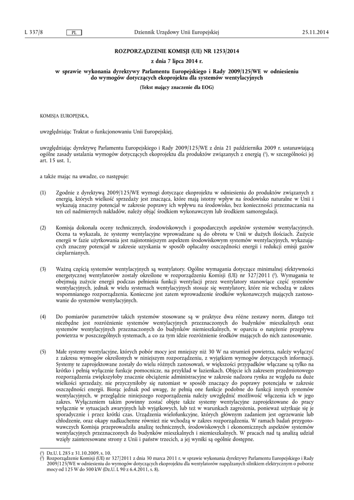 L 337/8 Dziennik Urzędowy Unii Europejskiej PL 25.11.2014 ROZPORZĄDZENIE KOMISJI (UE) NR 1253/2014 z dnia 7 lipca 2014 r. w sprawie wykonania dyrektywy Parlamentu Europejskiego i Rady 2009/125/WE w odniesieniu do wymogów dotyczących ekoprojektu dla systemów wentylacyjnych (Tekst mający znaczenie dla EOG) KOMISJA EUROPEJSKA, uwzględniając Traktat o funkcjonowaniu Unii Europejskiej, uwzględniając dyrektywę Parlamentu Europejskiego i Rady 2009/125/WE z dnia 21 października 2009 r. ustanawiającą ogólne zasady ustalania wymogów dotyczących ekoprojektu dla produktów związanych z energią (1), w szczególności jej art. 15 ust. 1, a także mając na uwadze, co następuje: (1) Zgodnie z dyrektywą 2009/125/WE wymogi dotyczące ekoprojektu w odniesieniu do produktów związanych z energią, których wielkość sprzedaży jest znacząca, które mają istotny wpływ na środowisko naturalne w Unii i wykazują znaczny potencjał w zakresie poprawy ich wpływu na środowisko, bez konieczności przeznaczania na ten cel nadmiernych nakładów, należy objąć środkiem wykonawczym lub środkiem samoregulacji. (2) Komisja dokonała oceny technicznych, środowiskowych i gospodarczych aspektów systemów wentylacyjnych. Ocena ta wykazała, że systemy wentylacyjne wprowadzane są do obrotu w Unii w dużych ilościach. Zużycie energii w fazie użytkowania jest najistotniejszym aspektem środowiskowym systemów wentylacyjnych, wykazują cych znaczny potencjał w zakresie uzyskania w sposób opłacalny oszczędności energii i redukcji emisji gazów cieplarnianych. (3) Ważną częścią systemów wentylacyjnych są wentylatory. Ogólne wymagania dotyczące minimalnej efektywności energetycznej wentylatorów zostały określone w rozporządzeniu Komisji (UE) nr 327/2011 (2). Wymagania te obejmują zużycie energii podczas pełnienia funkcji wentylacji przez wentylatory stanowiące część systemów wentylacyjnych, jednak w wielu systemach wentylacyjnych stosuje się wentylatory, które nie wchodzą w zakres wspomnianego rozporządzenia. Konieczne jest zatem wprowadzenie środków wykonawczych mających zastoso wanie do systemów wentylacyjnych. (4) Do pomiarów parametrów takich systemów stosowane są w praktyce dwa różne zestawy norm, dlatego też niezbędne jest rozróżnienie systemów wentylacyjnych przeznaczonych do budynków mieszkalnych oraz systemów wentylacyjnych przeznaczonych do budynków niemieszkalnych, w oparciu o natężenie przepływu powietrza w poszczególnych systemach, a co za tym idzie rozróżnienie środków mających do nich zastosowanie. (5) Małe systemy wentylacyjne, których pobór mocy jest mniejszy niż 30 W na strumień powietrza, należy wyłączyć z zakresu wymogów określonych w niniejszym rozporządzeniu, z wyjątkiem wymogów dotyczących informacji. Systemy te zaprojektowane zostały do wielu różnych zastosowań, w większości przypadków włączane są tylko na krótko i pełnią wyłącznie funkcje pomocnicze, na przykład w łazienkach. Objęcie ich zakresem przedmiotowego rozporządzenia zwiększyłoby znacznie obciążenie administracyjne w zakresie nadzoru rynku ze względu na duże wielkości sprzedaży, nie przyczyniłoby się natomiast w sposób znaczący do poprawy potencjału w zakresie oszczędności energii. Biorąc jednak pod uwagę, że pełnią one funkcje podobne do funkcji innych systemów wentylacyjnych, w przeglądzie niniejszego rozporządzenia należy uwzględnić możliwość włączenia ich w jego zakres. Wyłączeniem takim powinny zostać objęte także systemy wentylacyjne zaprojektowane do pracy wyłącznie w sytuacjach awaryjnych lub wyjątkowych, lub też w warunkach zagrożenia, ponieważ użytkuje się je sporadycznie i przez krótki czas. Urządzenia wielofunkcyjne, których głównym zadaniem jest ogrzewanie lub chłodzenie, oraz okapy nadkuchenne również nie wchodzą w zakres rozporządzenia. W ramach badań przygoto wawczych Komisja przeprowadziła analizę technicznych, środowiskowych i ekonomicznych aspektów systemów wentylacyjnych przeznaczonych do budynków mieszkalnych i niemieszkalnych. W pracach nad tą analizą udział wzięły zainteresowane strony z Unii i państw trzecich, a jej wyniki są ogólnie dostępne. (1) Dz.U. L 285 z 31.10.2009, s. 10. (2) Rozporządzenie Komisji (UE) nr 327/2011 z dnia 30 marca 2011 r. w sprawie wykonania dyrektywy Parlamentu Europejskiego i Rady 2009/125/WE w odniesieniu do wymogów dotyczących ekoprojektu dla wentylatorów napędzanych silnikiem elektrycznym o poborze mocy od 125 W do 500 kW (Dz.U. L 90 z 6.4.2011, s. 8). 25.11.2014 PL Dziennik Urzędowy Unii Europejskiej L 337/9 (6) Do celów niniejszego rozporządzenia za najważniejszy parametr związany z wpływem na środowisko odnośnych systemów wentylacyjnych uznano zużycie energii elektrycznej w fazie użytkowania. Roczne zużycie energii elek trycznej na terenie Unii przez produkty będące przedmiotem niniejszego rozporządzenia osiągnęło w 2010 r. szacunkową wartość 77,6 TWh. Jednocześnie stosowanie tych produktów przynosi oszczędność energii w wymiarze 2 570 PJ w zakresie ogrzewania pomieszczeń. W rozliczeniu końcowym, przyjmując 2,5 jako wartość współczynnika konwersji energii pierwotnej na energię elektryczną, bilans energetyczny wykazuje oszczędność energii pierwotnej w 2010 r. wynoszącą 1 872 PJ. Bez wprowadzania szczególnych środków łączna wielkość oszczędności wzrośnie w 2025 r. zgodnie z przewidywaniami do poziomu 2 829 PJ. (7) Ze wspomnianych badań przygotowawczych wynika, że zużycie energii przez produkty, których dotyczy niniejsze rozporządzenie, można znacznie zmniejszyć. Oczekuje się, iż wprowadzenie w życie zarówno wymogów dotyczących ekoprojektu określonych w niniejszym rozporządzeniu, jak i odpowiednich wymogów zawartych w rozporządzeniu delegowanym Komisji (UE) nr 1254/2014 (1) przyniesie łączny wzrost oszczędności energii 