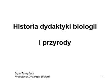 Historia dydaktyki biologii i przyrody Ligia Tuszyńska Pracownia Dydaktyki Biologii 1 Zagadnienia • Wybitni twórcy nauk biologicznych • Historia dydaktyki biologii w Polsce • Projekty programów i literatura dydaktyczna • Historia reform systemu edukacji • Dydaktyka przyrodnicza na UW • Literatura 2 Dydaktyka • (gr. Didaktikos – nauczający, pouczający ) jest jedną z podstawowych nauk pedagogicznych, której przedmiotem jest kształcenie ludzi 3 Wielka Dydaktyka • Po raz pierwszy pojawia się w tytule: „Didaktica magna” – 1657 r. J.A. Komeński • Jedyna nauka, która obejmuje jednocześnie: nauczanie + uczenie się + wychowanie = KSZTAŁCENIE 4 Zadania Dydaktyki biologii: • Formułowanie celów kształcenia; • Określanie kryteriów doboru i zakresu biologicznych treści nauczania; • Dokonywanie dydaktycznej transformacji wiedzy biologicznej z poziomu akademickiego na poziom szkolny • Dobór strategii, form i metod formalnego i nieformalnego nauczania oraz uczenia się biologii; 5 HISTORIA Złota reguła J.A. Komeńskiego 6 „Niech to złotą będzie zasadą dla uczących, ażeby tylko co mogą udostępniali zmysłom a więc: Rzeczy widzialne – wzrokowi, Słyszalne – słuchowi, Zapachy – węchowi, Rzeczy smak mające – smakowi, Namacalne – dotykowi, A jeśli coś jest uchwytne dla kilku zmysłów, należy kilku zmysłom na raz udostępnić” 7 J. Amos Komeński 1592-1670 Nauczyciel powinien: • "liczyć się z wiekiem swoich wychowanków i dobierać to, co jest zgodne z ich stopniem rozwoju, co ich umysłowości sprawia naturalną przyjemność". • "Uczeń nie powinien przy nauce siedzieć i ograniczać się wyłącznie do przysłuchiwania, ale brać czynny udział w zajęciach". • "Z każdej godziny szkolnej przeznacz tylko kwadrans na pokazywanie i objaśnianie, a trzy pozostałe na naśladowanie." 8 J. A. Komeński "Pansofia" - wszechstronność Natura przeznaczyła 24 lata na naukę i rozwój • 0-6 - "schola maternae" • 6-12 - szkoła elementarna • 12-18 - przedmioty (historia biblijna, naturalna, sztuka i wynalazki, obyczaje różnych narodów a na końcu historia powszechna • 18-24 - akademia 9 Siła motoryczna ludzkich działań (Comenius) • „Umysł – zwierciadło rzeczy • Ręka – rzeczy naśladowcą • Język – jest ich tłumaczeniem” 10 Jan Henryk Pestalozzi (1746-1827) • Kształcenie człowieka = siła dopomagania naturze • Główne cele nauczania = rozwijanie umysłu i moralności - Nie naśladownictwo • Aktywność i samodzielność w poznawaniu świata 11 Jan Henryk Pestalozzi Cztery momenty nauczania • w obserwacji zjawisk:(liczba, kształt i słowo) - Spostrzeganie przedmiotów - Kształtowanie wyobrażeń postrzeganych przedmiotów - Porównywanie przedmiotów i kształtowanie pojęć - Nazywanie przedmiotów, rozwijanie mowy (liczenie, mierzenie, mówienie) 12 Jan Fryderyk Herbart (1776- 1841) • Etyka – podstawa celów wychowania • Psychologia – środek wychowawczy • Nauczanie wychowujące – najważniejszy element dydaktyki 13 Jan Fryderyk Herbart Teoria stopni formalnych • • • • Jasność Kojarzenie System – porządkowanie wiadomości Metodę – organizowanie zadań by uczeń wykazał, że pojął główne myśli w sposób należyty” 14 Jan Władysław Dawid (1859 - 1914) • Pierwszy w polskiej dydaktyce domagał się nauczania opartego na rozumieniu i działaniu praktycznym • Trzy środki: - Spostrzeganie - Słowo - Działanie 15 John Devey(1859 – 1952) „Uczenie się przez działanie” Prekursor strategii projektów • Proces rozwiązywania problemów oparty na metodzie eksperymentalnej: - Odczucie trudności - Wykrycie i określenie - Nasuwanie się możliwego rozwiązania - Obserwacje i eksperymenty prowadzące do wniosku zawierającego rozwiązanie 16 Bogdan Nawroczyński (1882- 1974) • • - Autor zasad nauczania Etapy nauczania wg. Nawroczynskiego Zetknięcie ucznia z trudnością Sformułowanie podstawowego pytania Poszukiwanie odpowiedzi Sformułowanie odpowiedzi Zastosowanie jej w wielu ćwiczeniach 17 ul. Miodowa w Warszawie Collegium Nobilium 1740 założone przez Stanisława. Konarskiego 18 Collegium Nobilium • Językiem wykładowym była łacina. • Kolegium dzieliło się na 5 klas, nauka trwała 8 lat: - klasa I - 1 rok - klasa II - 2 lata - klasa III - 1 rok - klasa IV - 2 lata - klasa V - 2 lata. 19 Collegium Nobilium • Po raz pierwszy: • Mniejszy nacisk na naukę łaciny i greki, a większy na nauki przyrodnicze, Nauka o człowieku i zarys biologii 20 KEN 1773 -rozpoczyna historię dydaktyki w Polsce • w procesie nauczania biologii postulowano: - rozpoznawanie roślin - prowadzenie terenowych obserwacji 2 podręczniki główne: 21 22 23 Jan Krzysztof Kluk (1739-1796), ksiądz, jeden z najwybitniejszych przyrodników polskiego oświecenia. (1786) - pierwsza flora Polski, wykorzystująca nazewnictwo K. Linneusza. 24 Kluk Jan Krzysztof • • • • Proboszcz w Ciechanowcu na Podlasiu, Bogata wiedza przyrodnicza Kontakty z uczonymi Zbiory naukowe, muzeum przyrodnicze Anny z Sapiehów Jabłonowskiej w Siemiatyczach. • Współpraca z Komisją Edukacji Narodowej oraz Towarzystwem do Ksiąg Elementarnych. 25 Twórczość Krzysztofa Kluka • rolnicze pisma K. Kluka: 26 K. Kluk • Zwierząt domowych i dzikich, osobliwie krajowych, historii naturalnej początki i gospodarstwo (tom 1-4, Warszawa 17791780). • Zagadnień mineralogii, petrografii i górnictwa dotyczyła praca Rzeczy kopalnych [...] szukanie, poznanie i zażycie (tom 1-2, Warszawa 1781-1782). 27 Carolus Linnaeus 23 V 1707 –10 I 1778 szwedzki przyrodnik, profesor Uniwersytetu w Upsali. 28 Charles Robert Darwin 12 II 1809 - 19. IV. 1882 – jeden z najważniejszych XIX-wiecznych biologów i pierwszych badaczy ewolucji. 29 Edukacja przyrodnicza w polskiej myśli pedagogicznej XIX wieku • Józef Wybicki – „O użyciu zaczęcia edukacji od historii naturalnej”