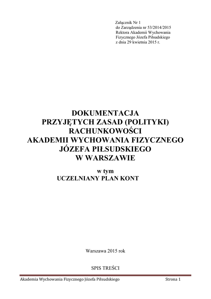 Załącznik Nr 1 do Zarządzenia nr 53/2014/2015 Rektora Akademii Wychowania Fizycznego Józefa Piłsudskiego z dnia 29 kwietnia 2015 r. DOKUMENTACJA PRZYJĘTYCH ZASAD (POLITYKI) RACHUNKOWOŚCI AKADEMII WYCHOWANIA FIZYCZNEGO JÓZEFA PIŁSUDSKIEGO W WARSZAWIE w tym UCZELNIANY PLAN KONT Warszawa 2015 rok SPIS TREŚCI Akademia Wychowania Fizycznego Józefa Piłsudskiego Strona 1 I. OGÓLNE ZASADY PROWADZENIA KSIĄG RACHUNKOWYCH. 3 1. Miejsce prowadzenia ksiąg rachunkowych……………………......3 2. Okres roku obrotowego i okresy sprawozdawcze………...…..…..3 3. Terminy metody prowadzenia inwentaryzacji składników majątkowych……………………………………………………….4 II. METODY WYCENY AKTYWÓW I PASYWÓW ORAZ USTALANIE WYNIKU FINANSOWEGO……………..…………………….……….......4 1. Metody wyceny aktywów i pasywów z założeniem kontynuacji działalności Uczelni……….……….…………………4 2. Zasady ustalania wyniku finansowego Uczelni….………………10 3. Sprawozdania finansowe Akademii Wychowania Fizycznego….11 a) Bilans b) Rachunek zysków i strat c) Szczegółowa informacja dodatkowa d) Zestawienie zmian w kapitale własnym e) Rachunek przepływów pieniężnych f) Zasada istotności III. ZASADY I SPOSÓB PROWADZENIA KSIĄGRACHUNKOWYCH………………………………………………12 1. 2. 3. 4. Uczelniany plan kont.………………………………..………….….12 Symbole jednostek organizacyjnych Akademii……………….…....41 Źródła pokrycia kosztów w Akademii……………………….……….42 Numeracja dokumentacji księgowej……………………………….....42 IV. ZASADY ROZLICZANIA KOSZTÓW I PRZYCHODÓW……………...45 1. Zasady rozliczania kosztów…………………………………..…..45 2. Zasady rozliczania przychodów………………………………..…53 V. CHARAKTERYSTYKA SYSTEMU PRZETWARZANIA DANYCH…………………………………………………………………..55 VI. SYSTEM OCHRONY DAYCH I ICH ZBIORÓW………….…..…..…..58 Akademia Wychowania Fizycznego Józefa Piłsudskiego Strona 2 OGÓLNE ZASADY PROWADZENIA KSIĄG RACHUNKOWYCH W Akademii Wychowania Fizycznego obowiązują następujące ogólne zasady prowadzenia ksiąg rachunkowych: Księgi rachunkowe prowadzone są w języku polskim i w walucie polskiej w złotych i groszach z zachowaniem zasady podwójnego księgowania każdej operacji gospodarczej, Księgi rachunkowe prowadzi się zgodnie z ustawą o rachunkowości z zachowaniem wszelkich zawartych w ustawie zasad z uwzględnieniem specyficznych warunków działalności szkół wyższych określonych w Rozporządzeniu w sprawie szczegółowych zasad gospodarki finansowej uczelni publicznych, Księgi rachunkowe otwiera się na początek każdego roku obrotowego, a zmyka na dzień kończący rok obrotowy, Ostateczne zamknięcie ksiąg rachunkowych następuje nie później niż 15 dni po zatwierdzeniu sprawozdania finansowego przez Senat Uczelni, Księgi rachunkowe są prowadzone przy użyciu licencjonowanego oprogramowania komputerowego HMS firmy SOFTKAM – Krzysztof Kurkowiak, ul. Olchowa 1, 62-002 Suchy Las. 1. Miejsce prowadzenia ksiąg rachunkowych Księgi rachunkowe Akademii Wychowania Fizycznego w Warszawie prowadzone są : W siedzibie Uczelni w Warszawie, ul. Marymoncka 34 bez Wydziału Wychowania Fizycznego i Sportu, W siedzibie Wydziału Wychowania Fizycznego i Sportu w Białej Podlskiej ul. Akademicka 2 2. Określenie roku obrotowego i okresów sprawozdawczych Okresem obrachunkowym dla Akademii Wychowani Fizycznego Józefa Piłsudskiego w Warszawie jest rok kalendarzowy. Księgi rachunkowe są zamykane na dzień bilansowy, który jest dniem kończącym rok obrotowy. Ustala się następujące okresy sprawozdawcze: 1. Sprawozdania finansowe sporządza się na dzień zamknięcia ksiąg (dzień bilansowy) przy zastosowaniu określonych ustawą o rachunkowości i polityką rachunkowości zasad wyceny aktywów i pasywów oraz ustalenia wyniku finansowego. 2. Akademia sporządza sprawozdania kwartalne o wynagrodzeniu i zatrudnieniu zgodnie z Rozporządzeniem Ministra o sprawozdawczości. Akademia Wychowania Fizycznego Józefa Piłsudskiego Strona 3 3. Akademia sporządza sprawozdanie o przychodach, kosztach i wyniku finansowym w terminach określonych przepisami GUS. 4. Akademia sporządza miesięczne ( za wyjątkiem stycznia i lutego) sprawozdania z przychodów i kosztów dla własnych potrzeb na ustalonych wzorach tabularycznych. Sprawozdanie sporządzane jest po zamknięci okresu sprawozdawczego jakim jest miesiąc. Zamknięcie miesiąca następuje po złożeniu wymaganych przepisami deklaracji podatkowych. 3. Terminy i metody prowadzenia inwentaryzacji składników majątkowych Metody i terminy inwentaryzacji składników majątkowych określa „Instrukcja w sprawie gospodarki majątkiem trwałym, inwentaryzacji majątku i zasad odpowiedzialności za powierzone mienie” wprowadzona Zarządzeniem Rektora nr 49/2006/2007 z dnia 4 września 2007 r. II. METODY WYCENY AKTYWÓW I PASYWÓW ORAZ USTALENIE WYNIKU FINANSOWEGO 1. Metody wyceny aktywów i pasywów z założeniem kontynuacji działalności Uczelni. Zgodnie z postanowieniami art. 4, art. 10, oraz rozdziału 4 ustawy z dnia 29 września 1994 r. o rachunkowości (Dz. U. z 2002 r. Nr 76, poz. 694 z późn. zm.) ustala się następujące metody wyceny aktywów i pasywów do stosowania w sposób ciągły (na okres wieloletni) bez zagrożenia kontynuacji działalności Akademii. Środki trwałe, środki trwałe w budowie i wartości niematerialne i prawne wycenia się, zależnie od sposobu ich nabycia (wytworzenia) wg: a) cen nabycia (zakupu) b) kosztów wytworzenia c) wartości przeszacowanej (po aktualizacji wyceny środków trwałych) pomniejszonych o odpisy umorzeniowe(amortyzacyjne) oraz ewentualne odpisy z tytułu trwałej utraty wartości. Cena naby