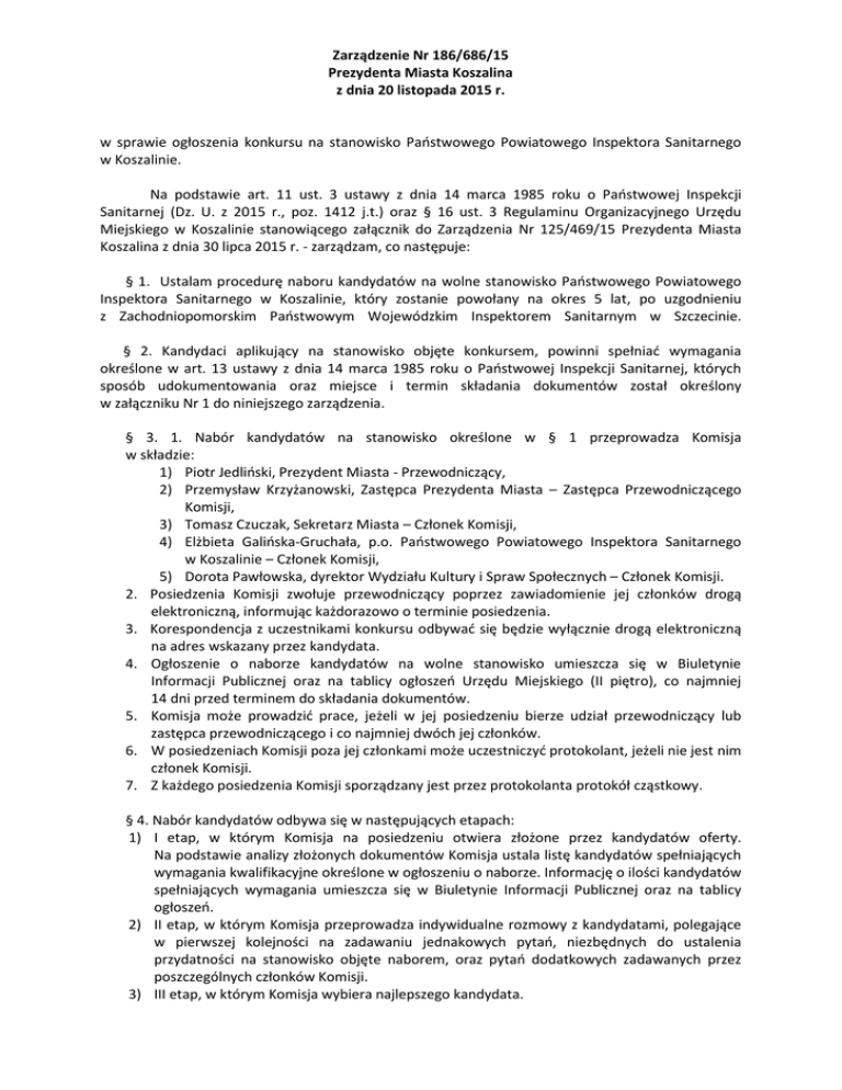Zarządzenie Nr 186/686/15 Prezydenta Miasta Koszalina z dnia 20 listopada 2015 r. w sprawie ogłoszenia konkursu na stanowisko Państwowego Powiatowego Inspektora Sanitarnego w Koszalinie. Na podstawie art. 11 ust. 3 ustawy z dnia 14 marca 1985 roku o Państwowej Inspekcji Sanitarnej (Dz. U. z 2015 r., poz. 1412 j.t.) oraz § 16 ust. 3 Regulaminu Organizacyjnego Urzędu Miejskiego w Koszalinie stanowiącego załącznik do Zarządzenia Nr 125/469/15 Prezydenta Miasta Koszalina z dnia 30 lipca 2015 r. - zarządzam, co następuje: § 1. Ustalam procedurę naboru kandydatów na wolne stanowisko Państwowego Powiatowego Inspektora Sanitarnego w Koszalinie, który zostanie powołany na okres 5 lat, po uzgodnieniu z Zachodniopomorskim Państwowym Wojewódzkim Inspektorem Sanitarnym w Szczecinie. § 2. Kandydaci aplikujący na stanowisko objęte konkursem, powinni spełniać wymagania określone w art. 13 ustawy z dnia 14 marca 1985 roku o Państwowej Inspekcji Sanitarnej, których sposób udokumentowania oraz miejsce i termin składania dokumentów został określony w załączniku Nr 1 do niniejszego zarządzenia. § 3. 1. Nabór kandydatów na stanowisko określone w § 1 przeprowadza Komisja w składzie: 1) Piotr Jedliński, Prezydent Miasta - Przewodniczący, 2) Przemysław Krzyżanowski, Zastępca Prezydenta Miasta – Zastępca Przewodniczącego Komisji, 3) Tomasz Czuczak, Sekretarz Miasta – Członek Komisji, 4) Elżbieta Galińska-Gruchała, p.o. Państwowego Powiatowego Inspektora Sanitarnego w Koszalinie – Członek Komisji, 5) Dorota Pawłowska, dyrektor Wydziału Kultury i Spraw Społecznych – Członek Komisji. 2. Posiedzenia Komisji zwołuje przewodniczący poprzez zawiadomienie jej członków drogą elektroniczną, informując każdorazowo o terminie posiedzenia. 3. Korespondencja z uczestnikami konkursu odbywać się będzie wyłącznie drogą elektroniczną na adres wskazany przez kandydata. 4. Ogłoszenie o naborze kandydatów na wolne stanowisko umieszcza się w Biuletynie Informacji Publicznej oraz na tablicy ogłoszeń Urzędu Miejskiego (II piętro), co najmniej 14 dni przed terminem do składania dokumentów. 5. Komisja może prowadzić prace, jeżeli w jej posiedzeniu bierze udział przewodniczący lub zastępca przewodniczącego i co najmniej dwóch jej członków. 6. W posiedzeniach Komisji poza jej członkami może uczestniczyć protokolant, jeżeli nie jest nim członek Komisji. 7. Z każdego posiedzenia Komisji sporządzany jest przez protokolanta protokół cząstkowy. § 4. Nabór kandydatów odbywa się w następujących etapach: 1) I etap, w którym Komisja na posiedzeniu otwiera złożone przez kandydatów oferty. Na podstawie analizy złożonych dokumentów Komisja ustala listę kandydatów spełniających wymagania kwalifikacyjne określone w ogłoszeniu o naborze. Informację o ilości kandydatów spełniających wymagania umieszcza się w Biuletynie Informacji Publicznej oraz na tablicy ogłoszeń. 2) II etap, w którym Komisja przeprowadza indywidualne rozmowy z kandydatami, polegające w pierwszej kolejności na zadawaniu jednakowych pytań, niezbędnych do ustalenia przydatności na stanowisko objęte naborem, oraz pytań dodatkowych zadawanych przez poszczególnych członków Komisji. 3) III etap, w którym Komisja wybiera najlepszego kandydata. § 5.1. Komisja nie może zajmować stanowiska w trakcie rozmowy kwalifikacyjnej. 2. Po każdej rozmowie kwalifikacyjnej, każdy z członków Komisji powinien dokonać swojej oceny. Dyskusja z pozostałymi członkami Komisji odbywa się dopiero po zakończeniu wszystkich rozmów kwalifikacyjnych. 3. Oceny wszystkich kandydatów przez poszczególnych członków Komisji przeprowadza się na formularzu stanowiącym załącznik Nr 2 do zarządzenia. 4. Komisja porównuje swoje spostrzeżenia oraz uzgadnia kolejność kandydatów, a także wybiera najlepszego kandydata, biorąc pod uwagę poprawność udzielonych odpowiedzi na zadawane pytania. 5. W przypadku nie osiągnięcia porozumienia przez Komisję w sprawie kolejności kandydatów, a także wyboru najlepszego kandydata, Komisja przeprowadza głosowanie. 6. Komisja podejmuje uchwały zwykłą większością głosów. W razie równej ilości głosów decyduje głos Przewodniczącego Komisji. § 6. W razie odrzucenia przez Komisję wszystkich kandydatów lub w razie nie wyłonienia kandydata, Komisja uznaje, że nabór nie doprowadził do wybrania kandydata. § 7. 1. Nabór jest nieważny w razie: 1) niezachowania kolejności czynności, o których mowa w § 4, 2) nie dokonania jednej z czynności, o których mowa w § 4, 3) nie powiadomienia kandydata lub członka Komisji o terminie posiedzenia. 2. Nieważność naboru stwierdza Prezydent Miasta Koszalina na wniosek członka Komisji lub na wniosek kandydata. Wniosek można złożyć w terminie 3 dni od dnia zaistnienia przyczyny nieważności naboru. 3. Nie można stwierdzić nieważności naboru po zawarciu z kandydatem umowy o pracę na stanowisku, którego dotyczył nabór. § 8. 1. Z przeprowadzonego naboru kandydatów protokolant sporządza protokół. 2. Informacja o wyniku naboru jest publikowana niezwłocznie - nie później niż w terminie 14 dni od zatrudnienia wybranego kandydata - w Biuletynie Informacji Publicznej i na tablicy ogłoszeń przez okres co najmniej 3 miesięcy. 3. Jeżeli kandydat wyłoniony w wyniku naboru nie przyjął oferty pracy możliwe jest zatrudnienie na tym samym stanowisku kolejnej osoby spośród najlepszych kandydatów wymienionych w protokole naboru, biorąc pod uwagę kolejność uszeregowania kandydatów określoną w § 4 ust.4 4. Komisja ulega rozwiązaniu z dniem zatrudnienia wybranego kandydata. 5. Oferty złożone na przeprowadzony nabór odsyłane są na wskazany przez kandydata adres do korespondencji. § 9. Wykonanie zarządzenia powierzam Sekretarzowi Miasta. § 10. Zarządzenie wchodzi w życie z dniem 20 listopada 2015 roku. Prezydent Miasta Koszalina Piot